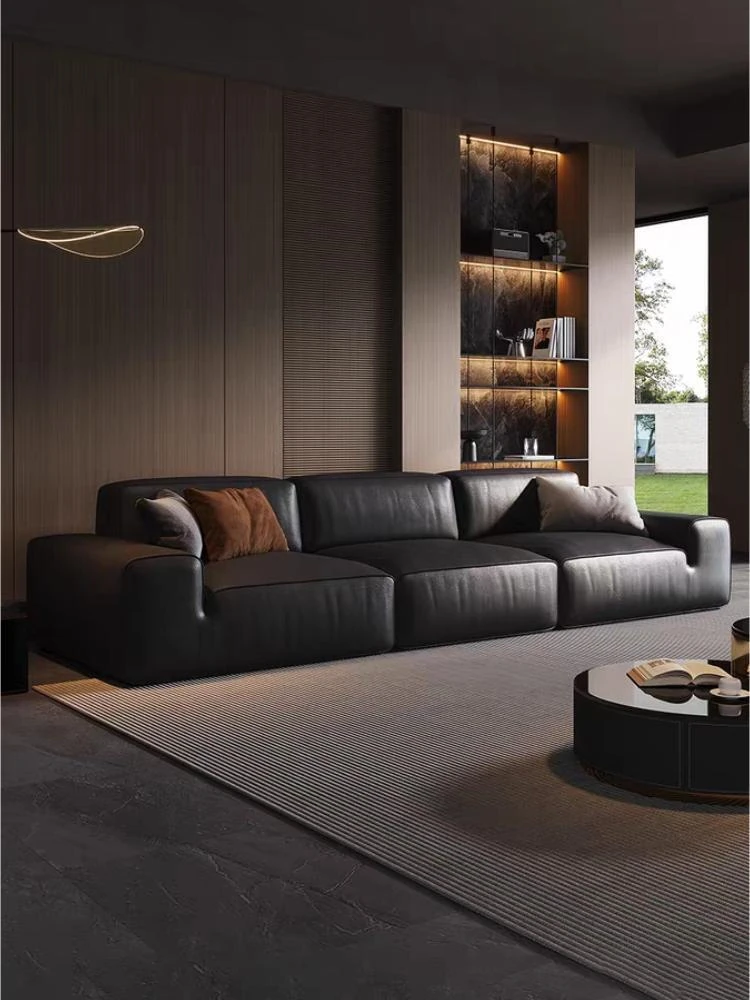 イタリアンミニマルビッグブラック牛革ソファ | ブラックトーフブロック型コンビネーション | 小型から大型の居住空間に最適な直線型ソファ!