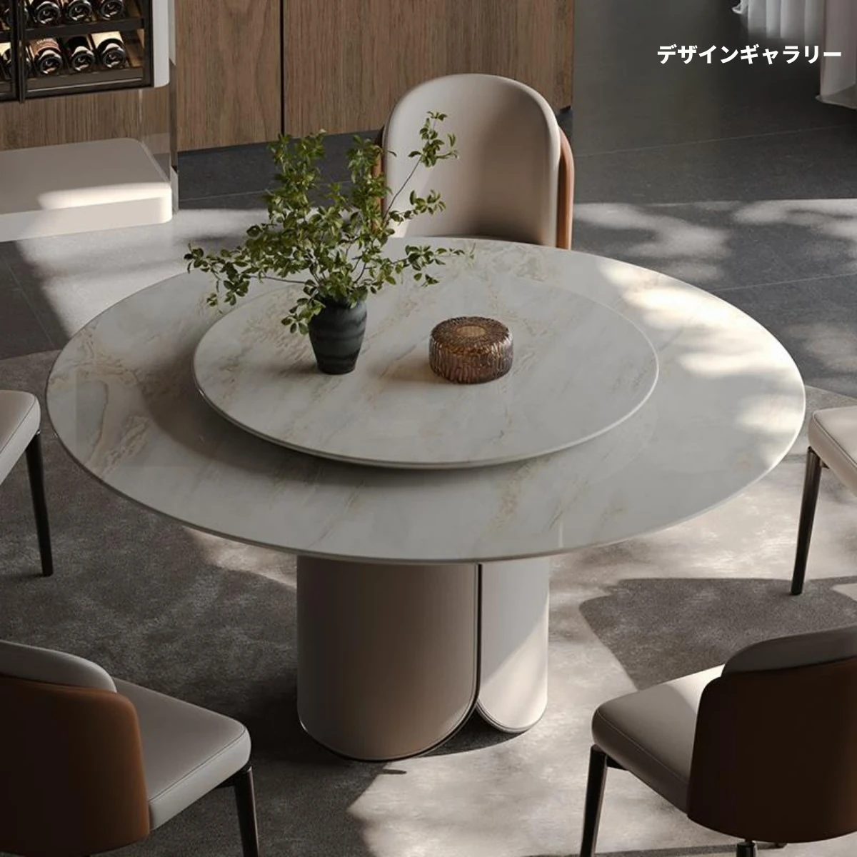 カフニ高級石製ラウンドダイニングテーブル - 天然大理石の回転盤付き、モダンな別荘スタイルの贅沢な食卓。美しいデザインと機能性を兼ね備えた、特別な食事のひとときを演出します。