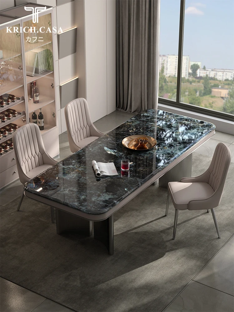 カフニのラグジュアリー天然石ダイニングテーブル - 高級別荘向けのサファイアカラー、イタリアンスタイルの長方形大理石テーブル。洗練されたデザインで、特別な食事のひとときを演出します。