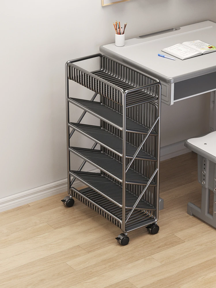 高校生にぴったり!スペースを取らない多層型アイアン製移動式書棚デスク収納ラック。デスクサイドや隙間にフィットするコンパクトなブックキャビネットで、すっきり整理整頓!