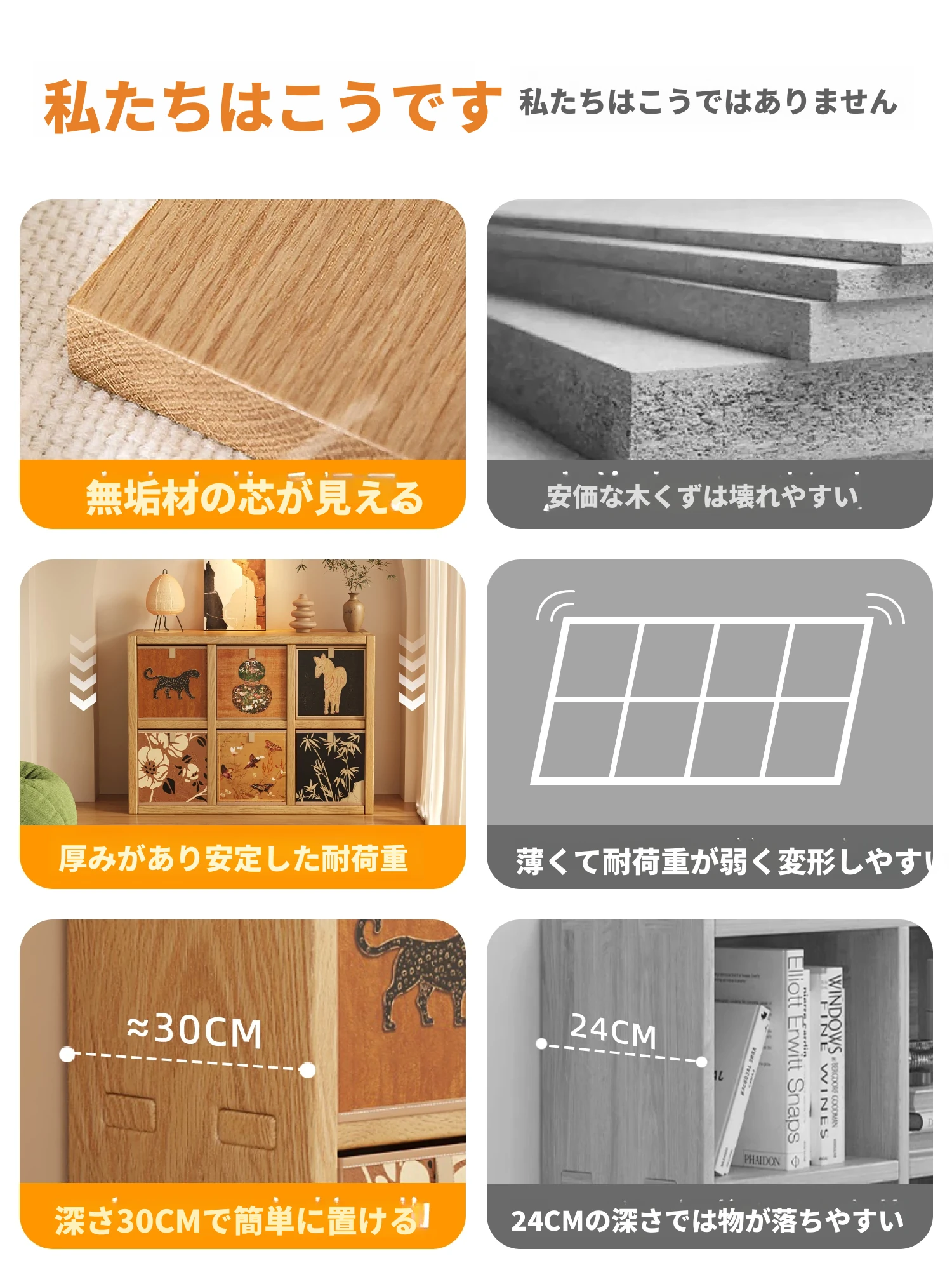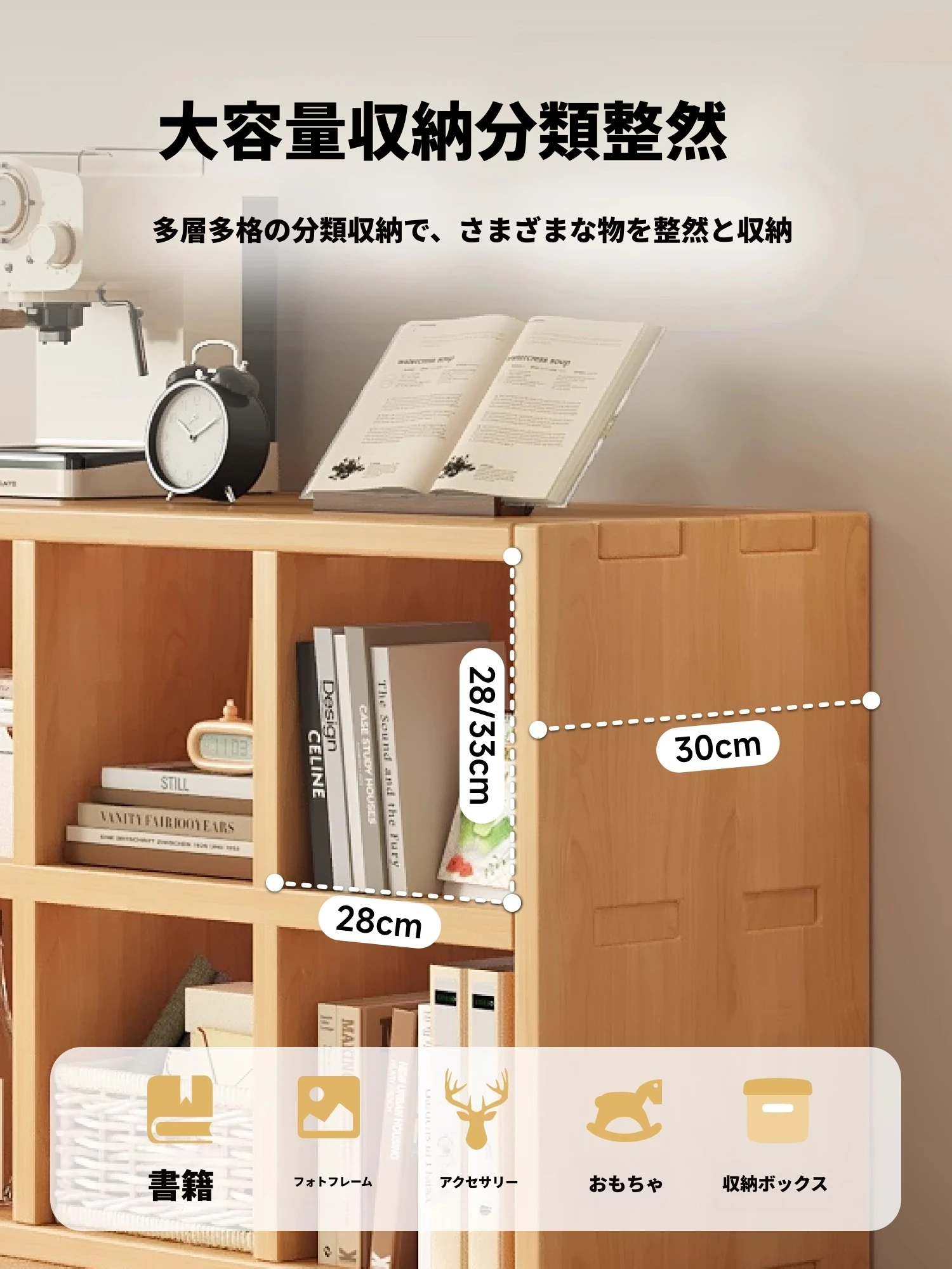 天然木製のグリッドキャビネット本棚 - 落地式収納ラック!8つの収納スペースを備え、幼稚園に最適!壁に寄り添い、シンプルで便利な収納を実現。お部屋をスッキリ整頓し、お子様の成長をサポートします!