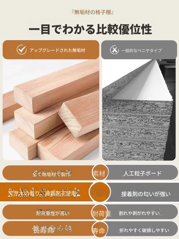 天然木材使用のグリッドラック書棚!フロアスタンド式で、壁にぴったりフィット。リビングや家庭に最適な多層収納。自由に組み合わせ可能で、おしゃれな空間を演出します!