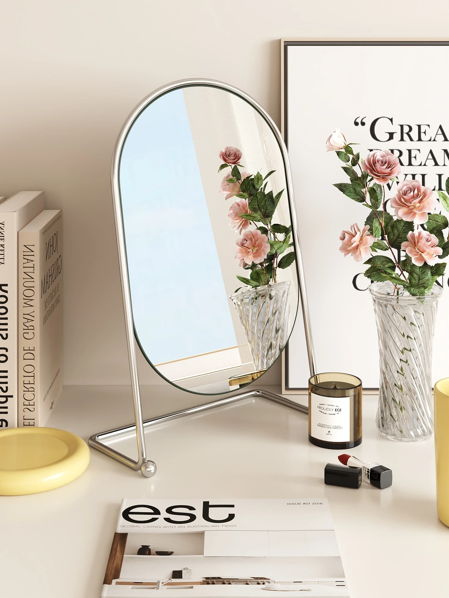 クリーム風の回転式化粧鏡 - 家庭用・寝室用・学生寮に最適!大きなデスクトップ用鏡で、メイクアップがもっと楽しくなる!おしゃれなドレッサーにもぴったり。