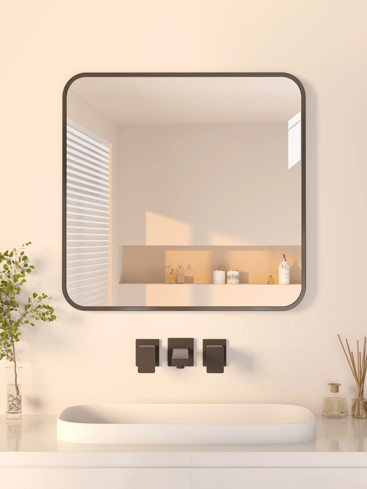 自粘式壁掛け鏡 - バスルームやトイレに最適な高精細ガラス製ミラー!穴を開けずに簡単取り付け、洗練されたデザインで空間を広く見せる!おしゃれで実用的なアイテムで、毎日の身支度がもっと楽しく!