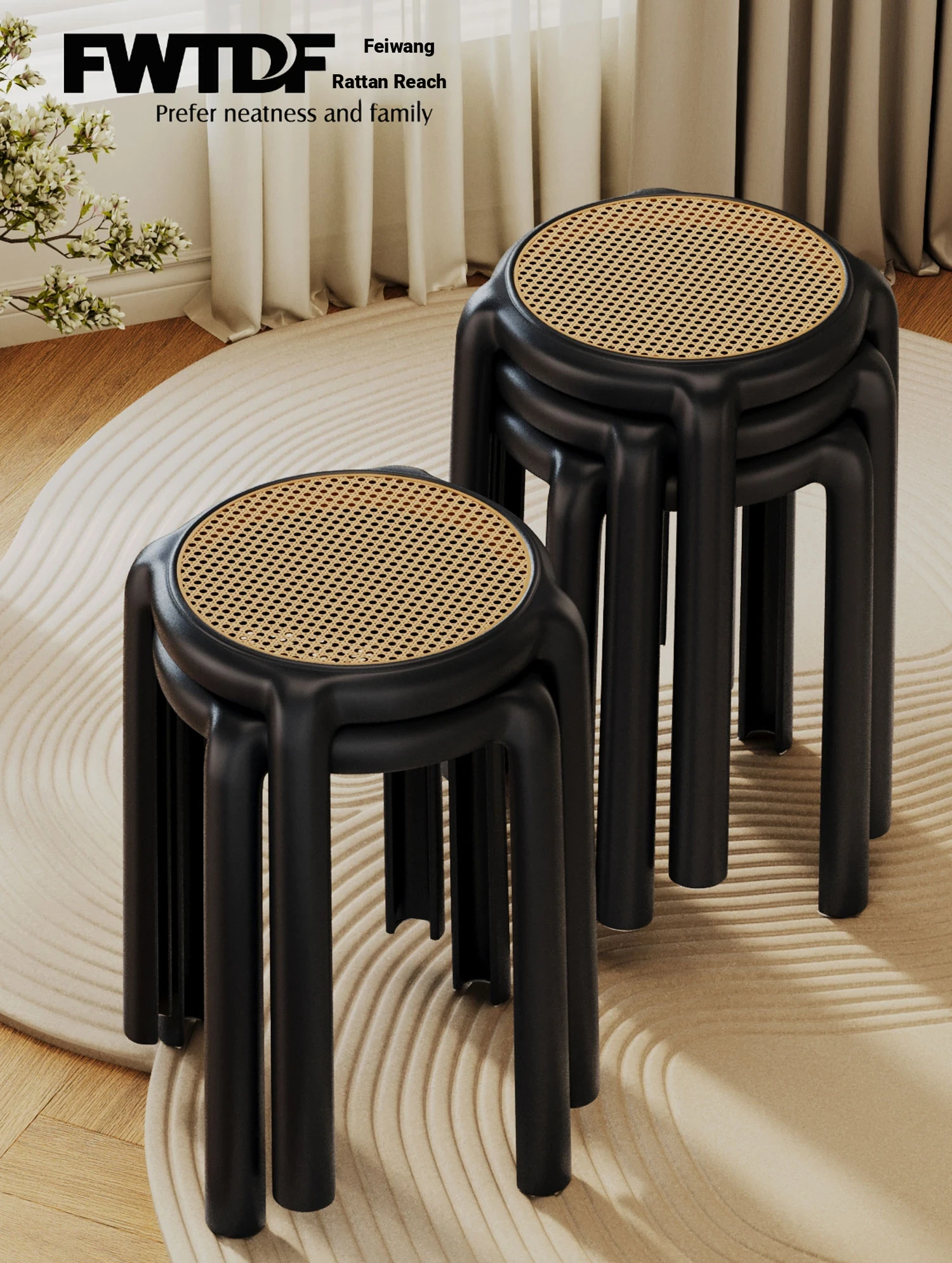 Thickened Plastic Stools for Home Use - Stackable Rattan-Style Round Stools, Vintage High Bar Stools, Modern Minimalist Chairs for Living Room and Dining Table