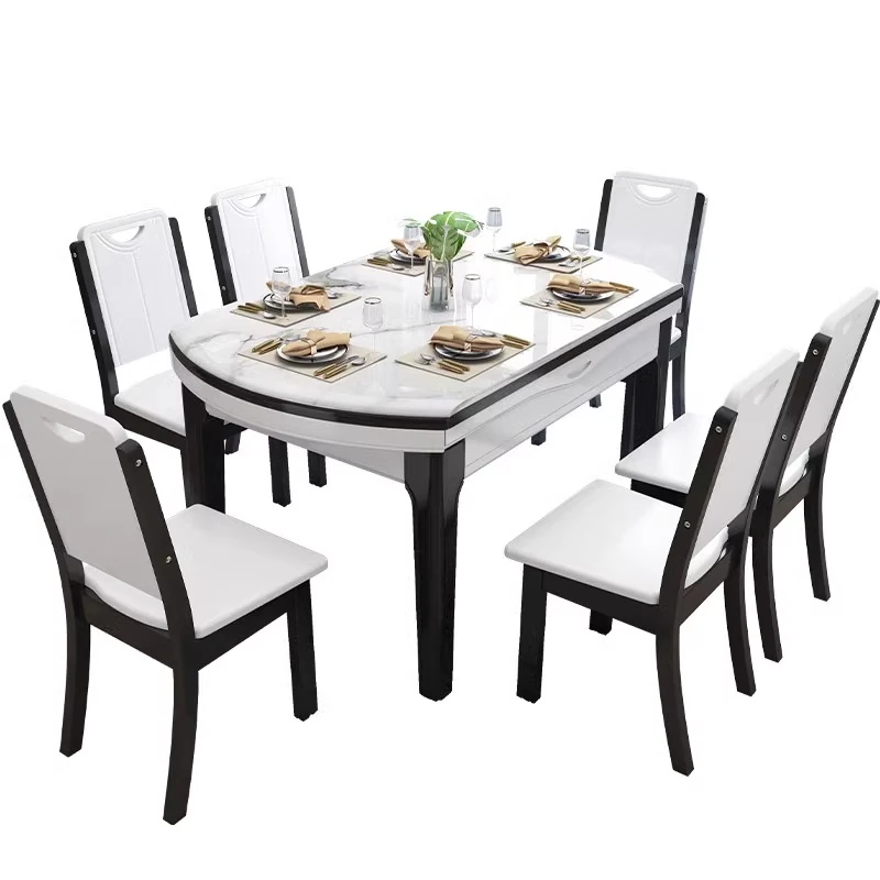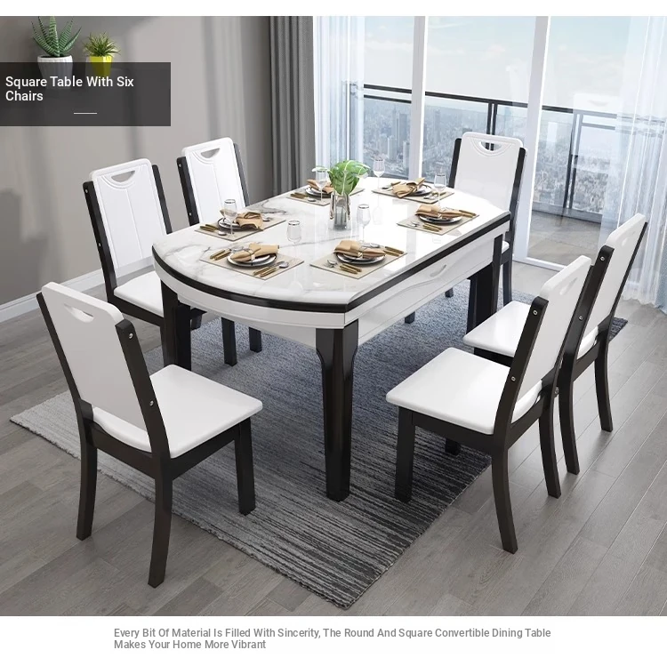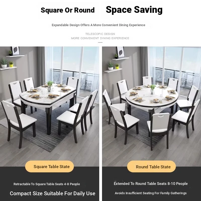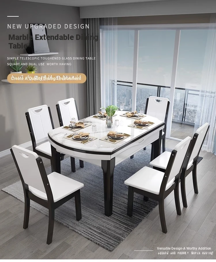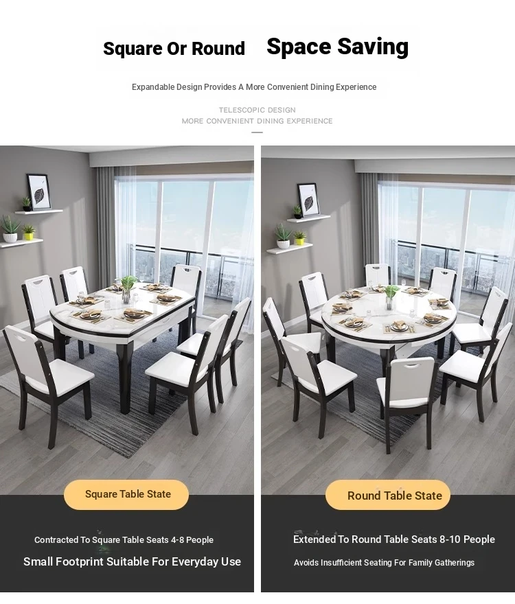 Modern Extendable Round Marble Dining Table Set with Solid Wood Chairs - Space-Saving Design for Small Homes, Perfect for Elegant Dining Experiences