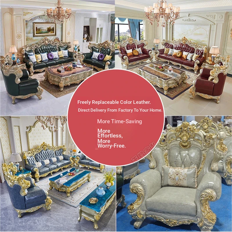 Luxurious European Villa Gold Leather Sofa Set - 2025 New Arrival with Solid Wood Carving and Gold Foil Finish for Elegant Living Rooms