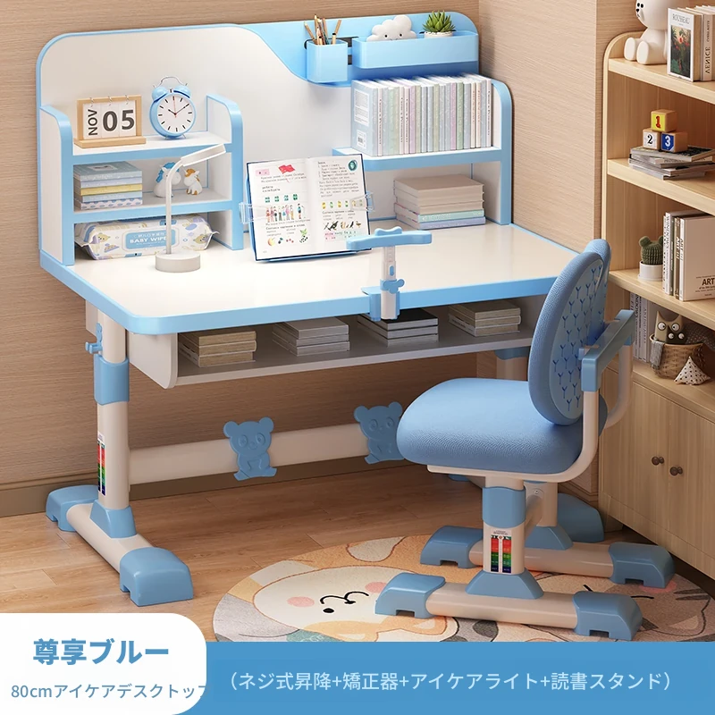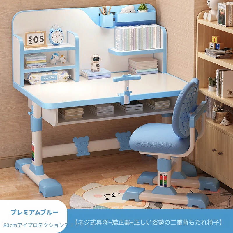 ⭐強化型テーブル・チェア脚【フラグシップブルー】 手動昇降/正姿勢ダブルバックチェア/スポンジクッションカバー/矯正器/目に優しいライト(オリジナルカバー付き)