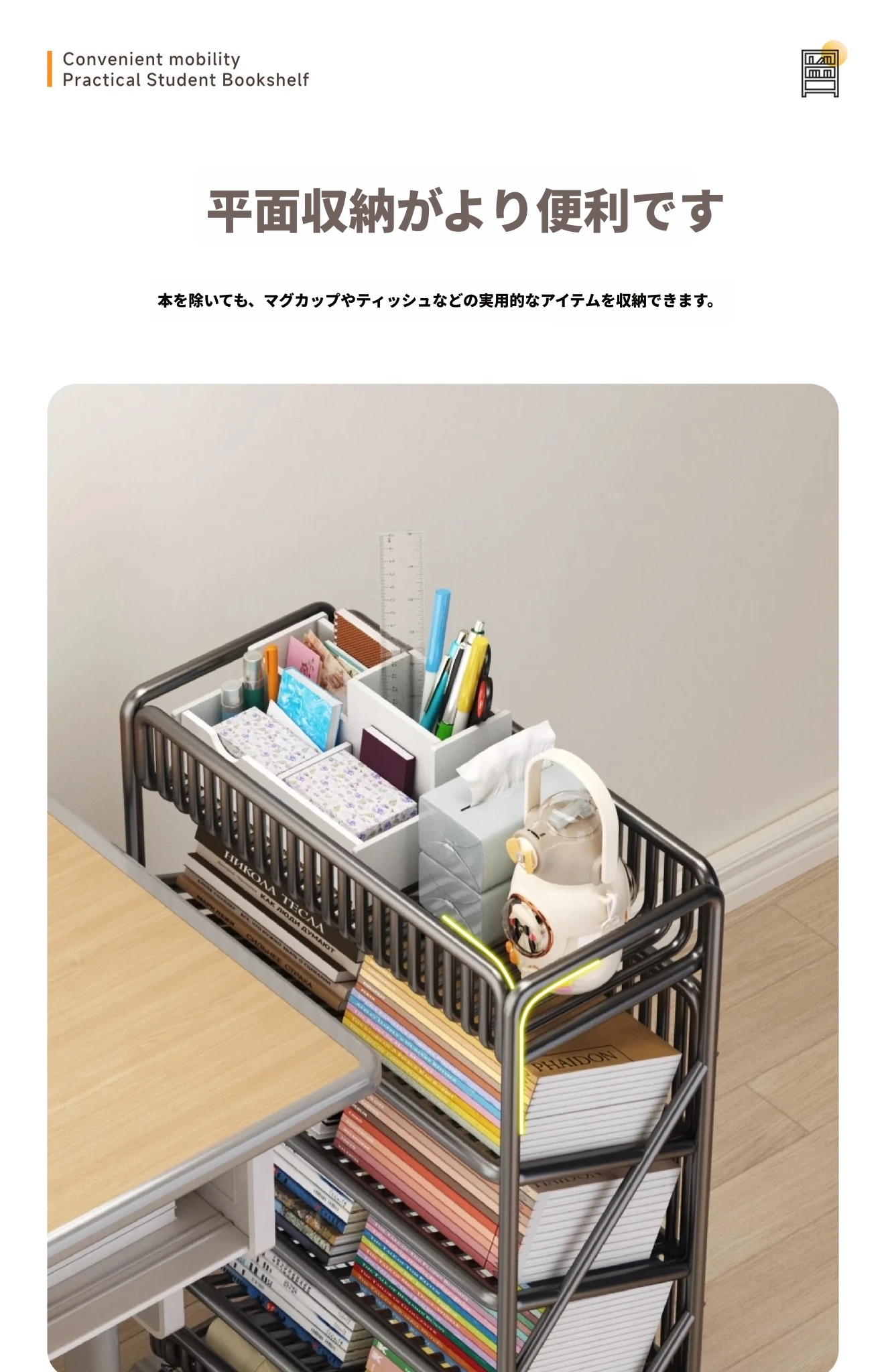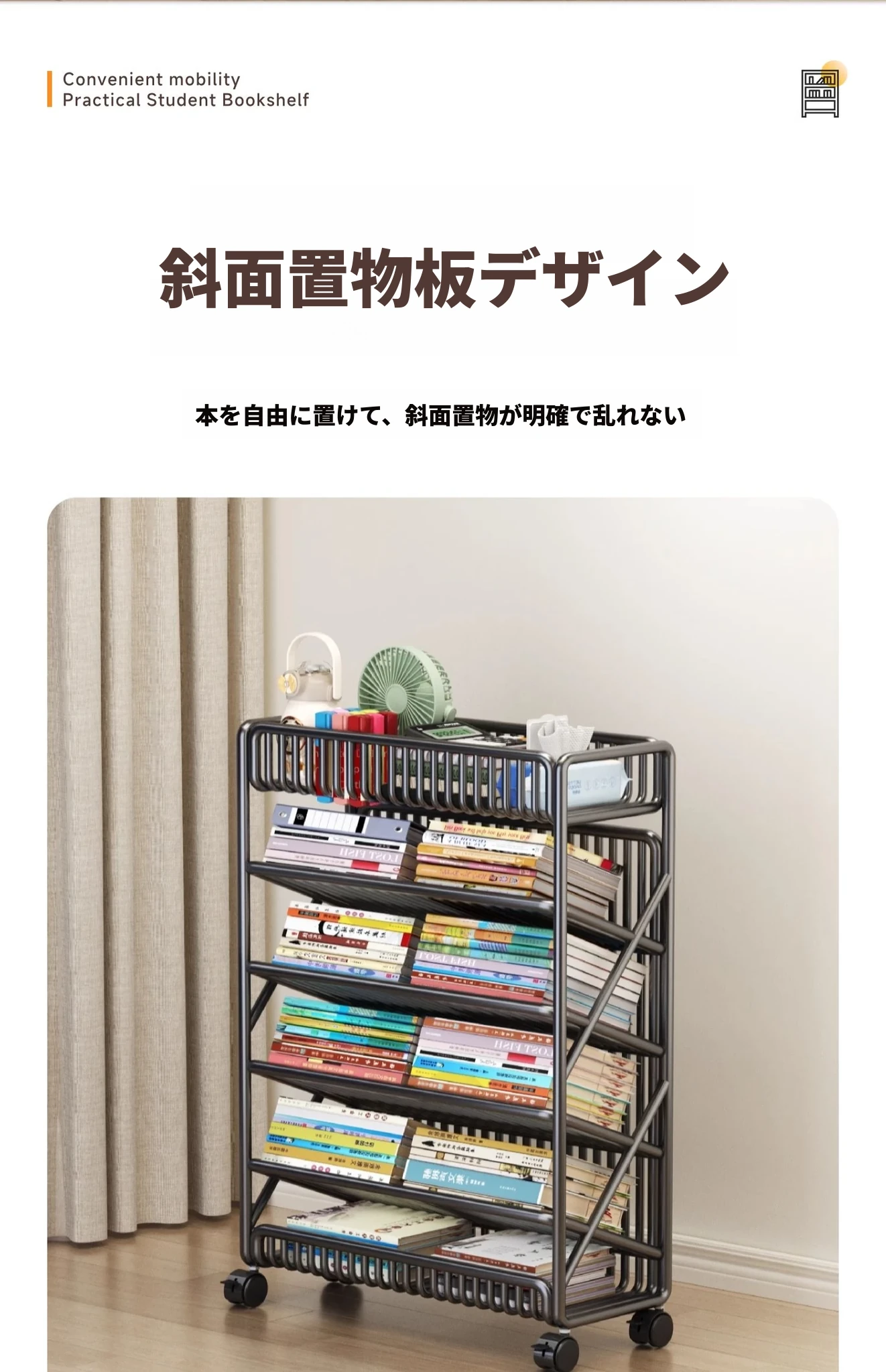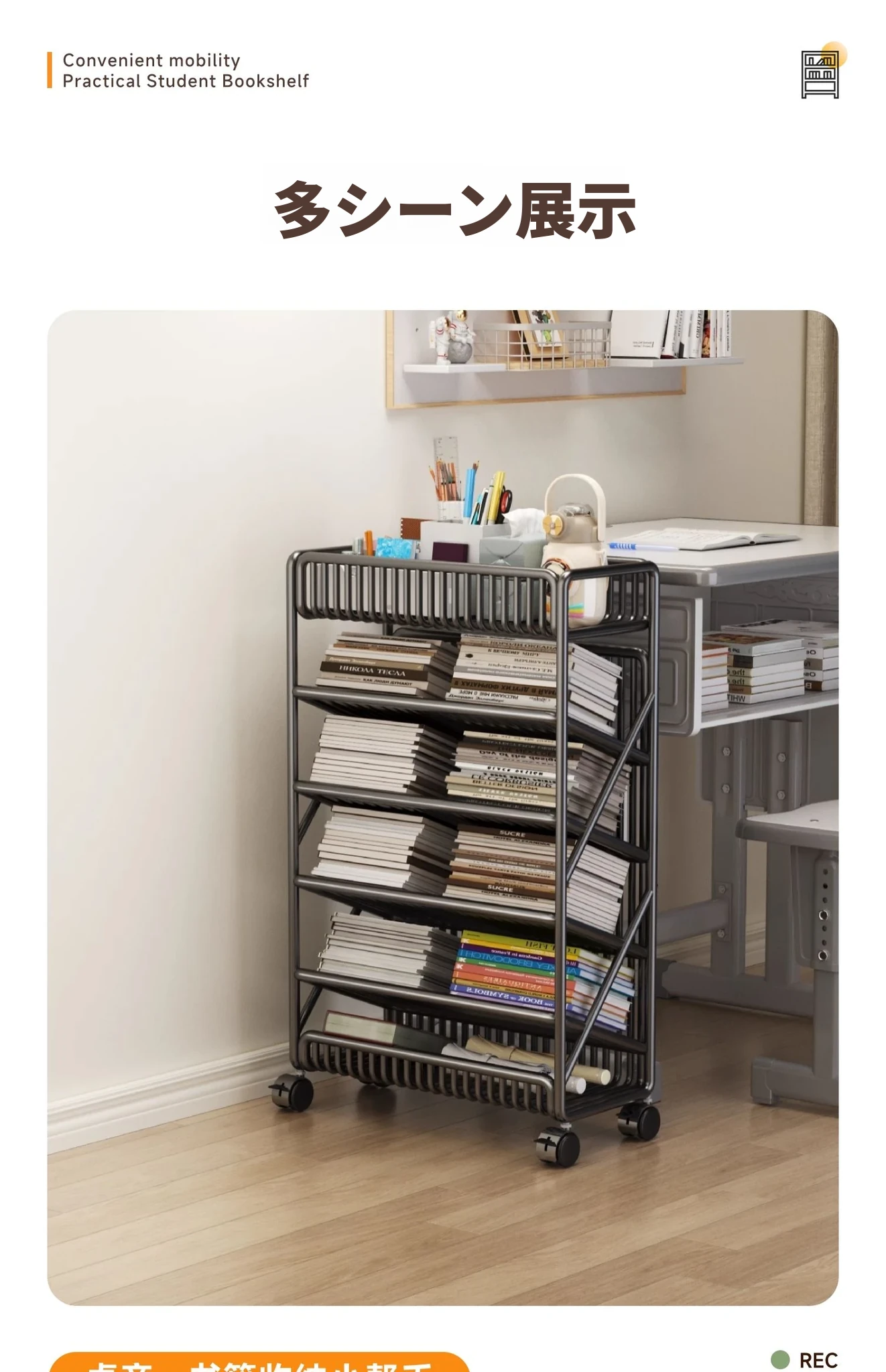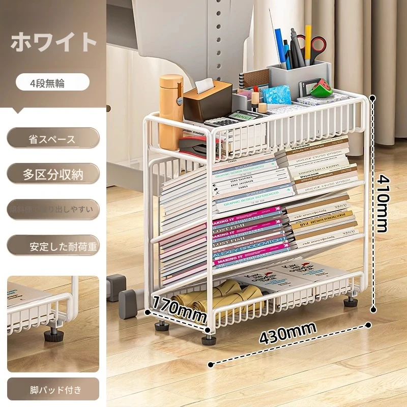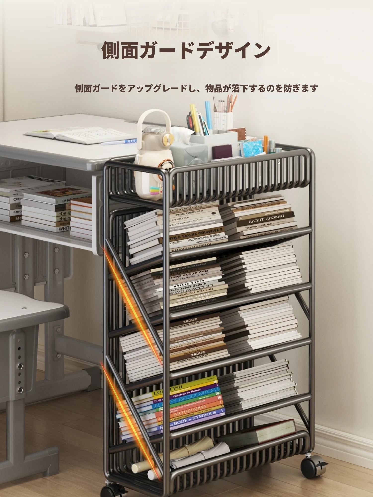移動式デスクサイド書棚 - スペースを取らず、軽量で便利!寝室や書斎にぴったりの収納ソリューション。あなたの生活空間を効率的に整理整頓し、スタイリッシュに演出します!