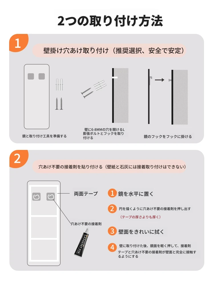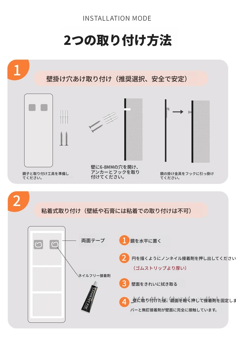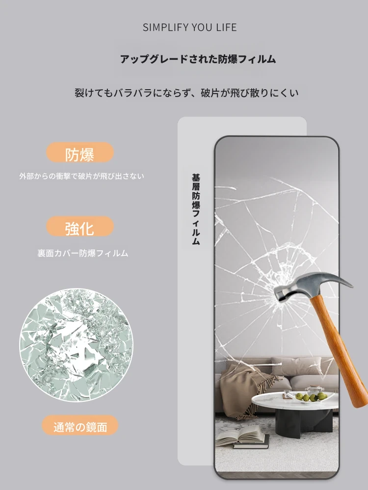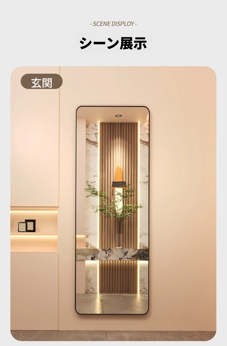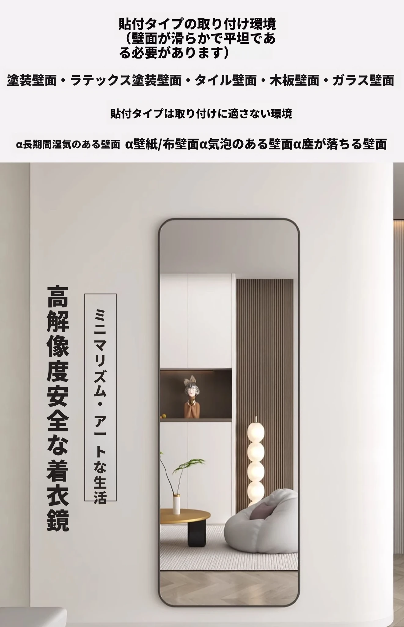 高級感あふれる自粘式全身鏡!壁掛け・立て掛け両用で、インテリアにぴったり。穴あけ不要の簡単取り付け、寝室やクローゼットに最適な試着鏡。あなたのスタイルを引き立てる鏡で、毎日を特別に!