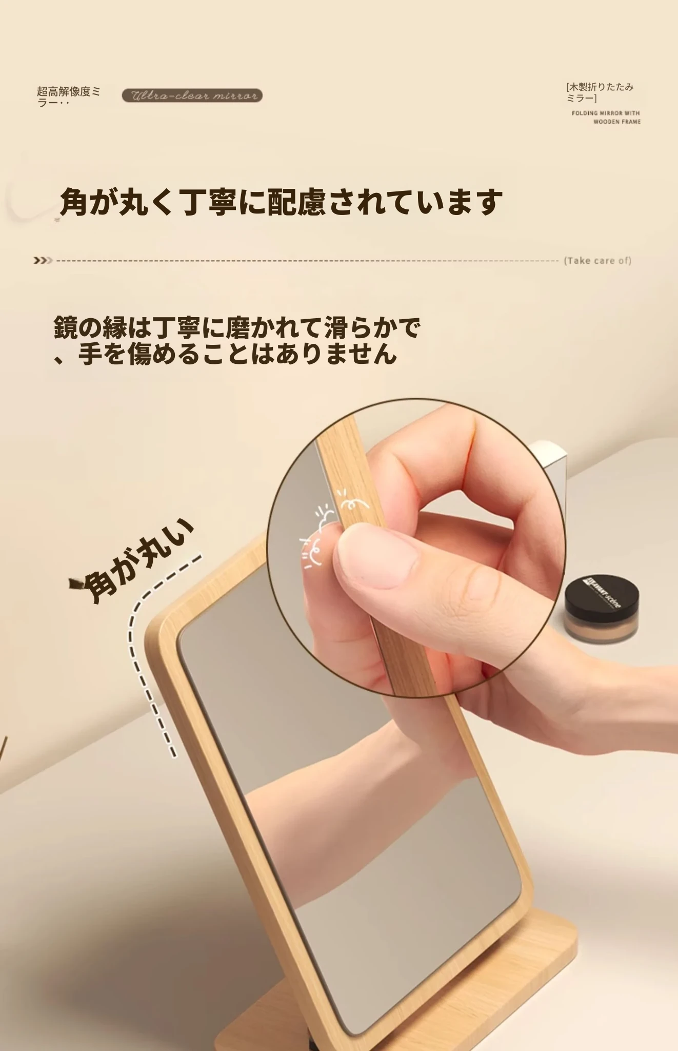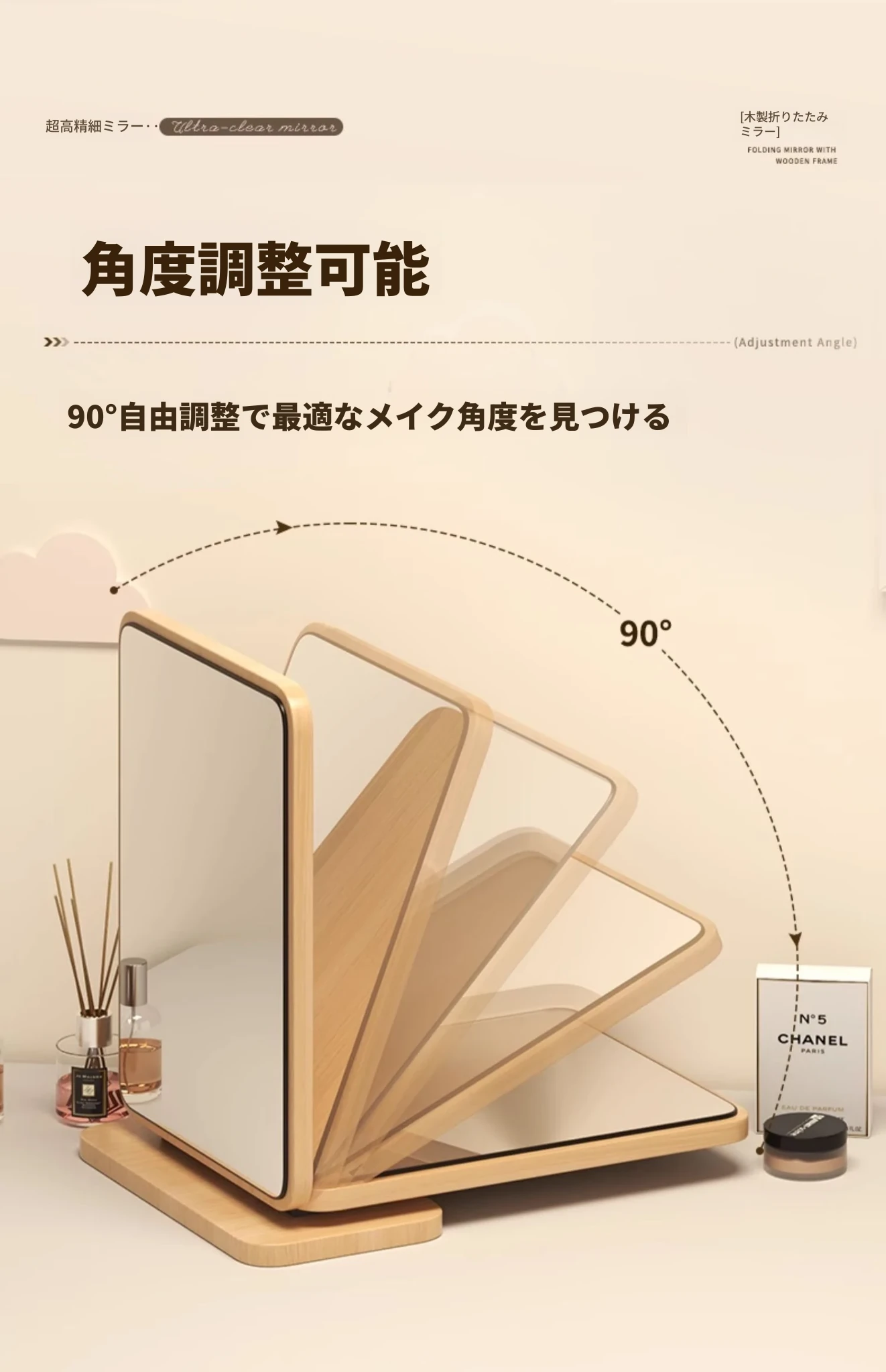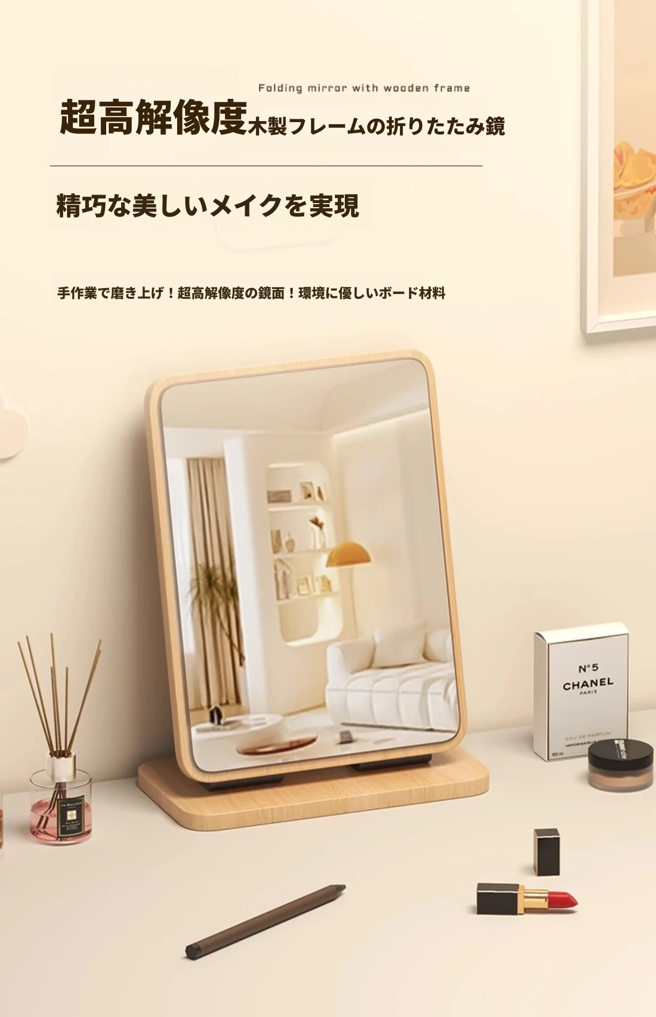 高級感あふれる木製化粧鏡!卓上用の折りたたみ式メイクアップミラーで、洗練されたインテリアにぴったり。自宅で贅沢なビューティータイムを楽しみましょう。大きな鏡面で、完璧なメイクが叶います!