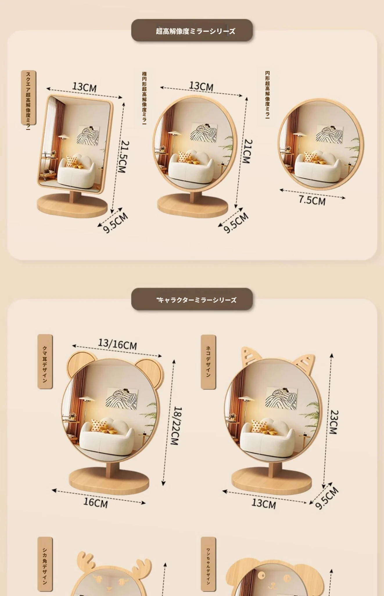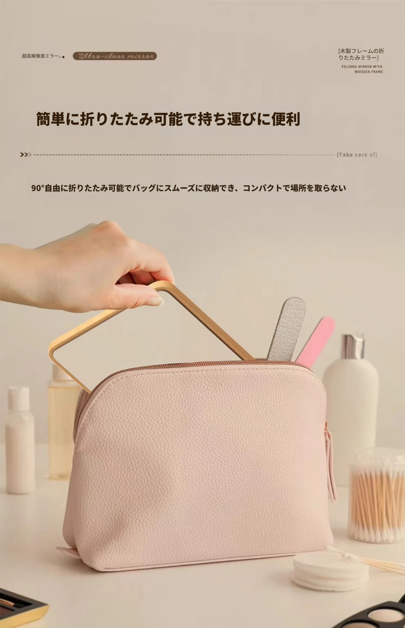 【円形】折りたたみ木製ミラー 20*22cm(擬似木材質)