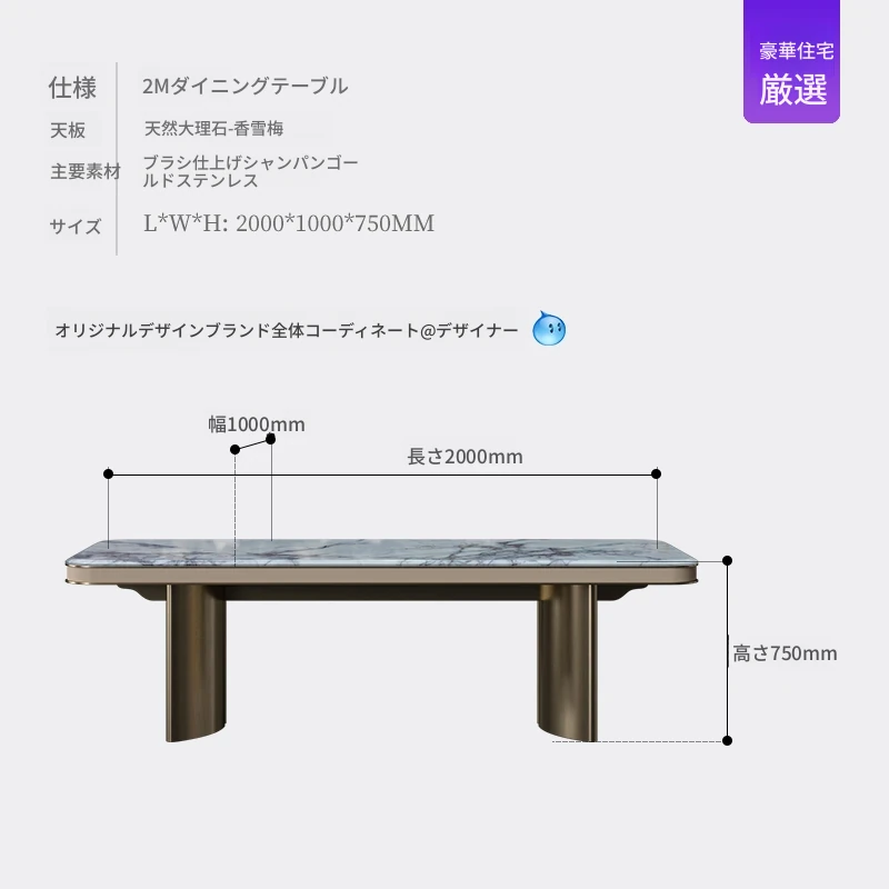 【天然大理石香雪梅】2.00mダイニングテーブル(シャンパンゴールド)