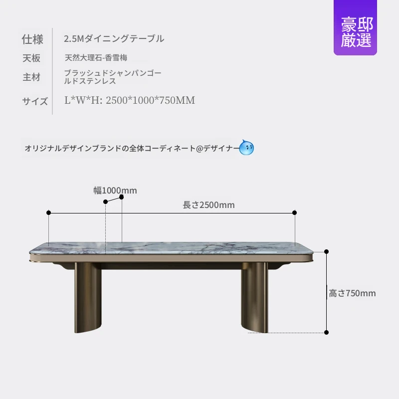 【天然大理石香雪梅】2.50mダイニングテーブル(シャンパンゴールド)