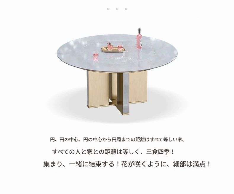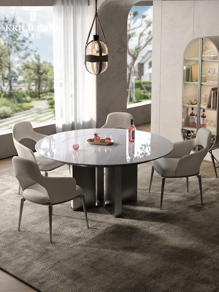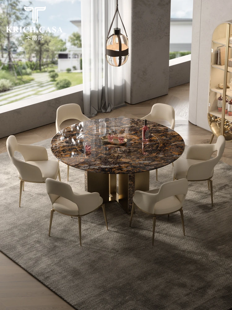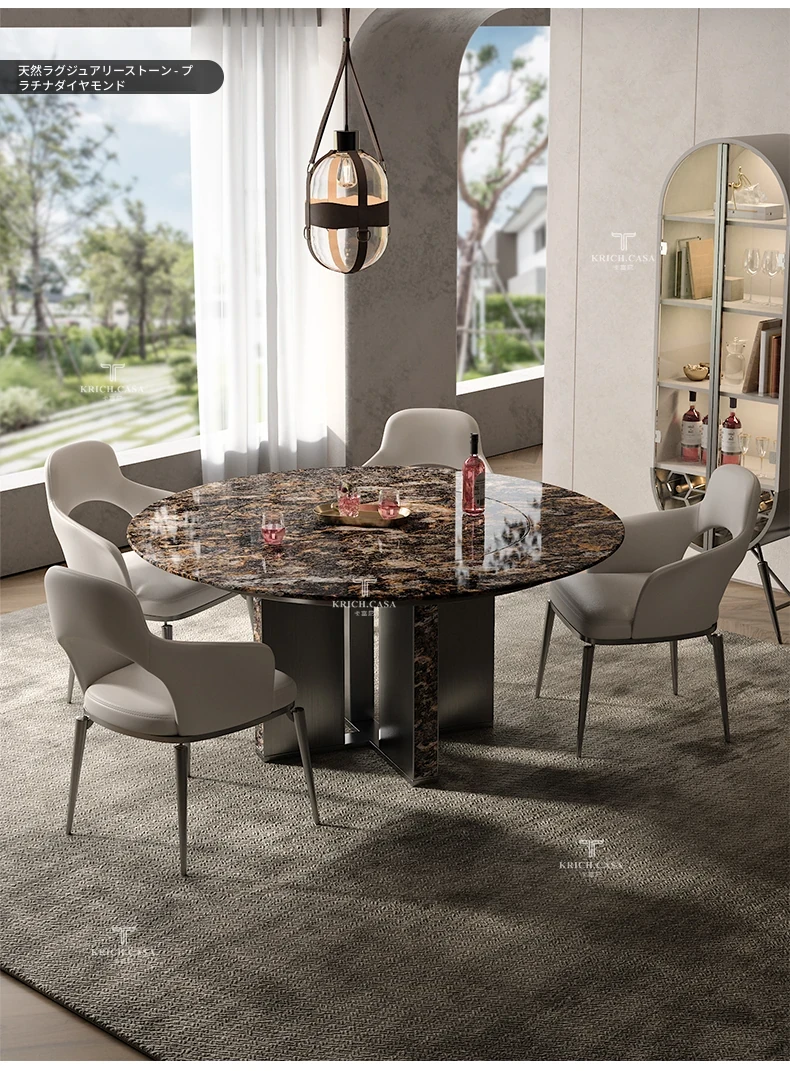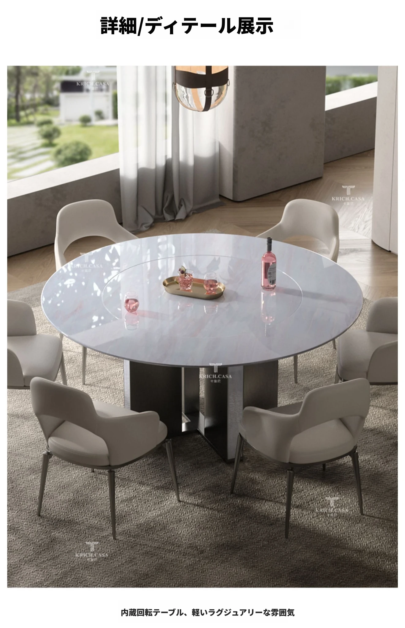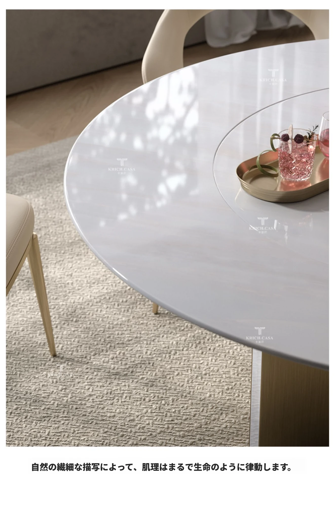 カフニ高級石製ラウンドダイニングテーブル - 天然大理石の回転盤付き、モダンな別荘スタイルの贅沢な食卓。美しいデザインと機能性を兼ね備えた、特別な食事のひとときを演出します。