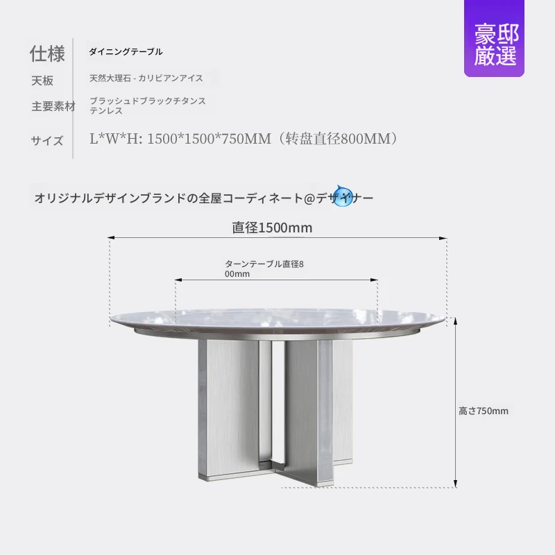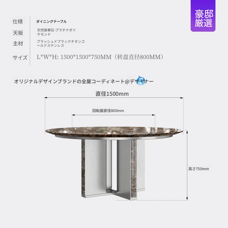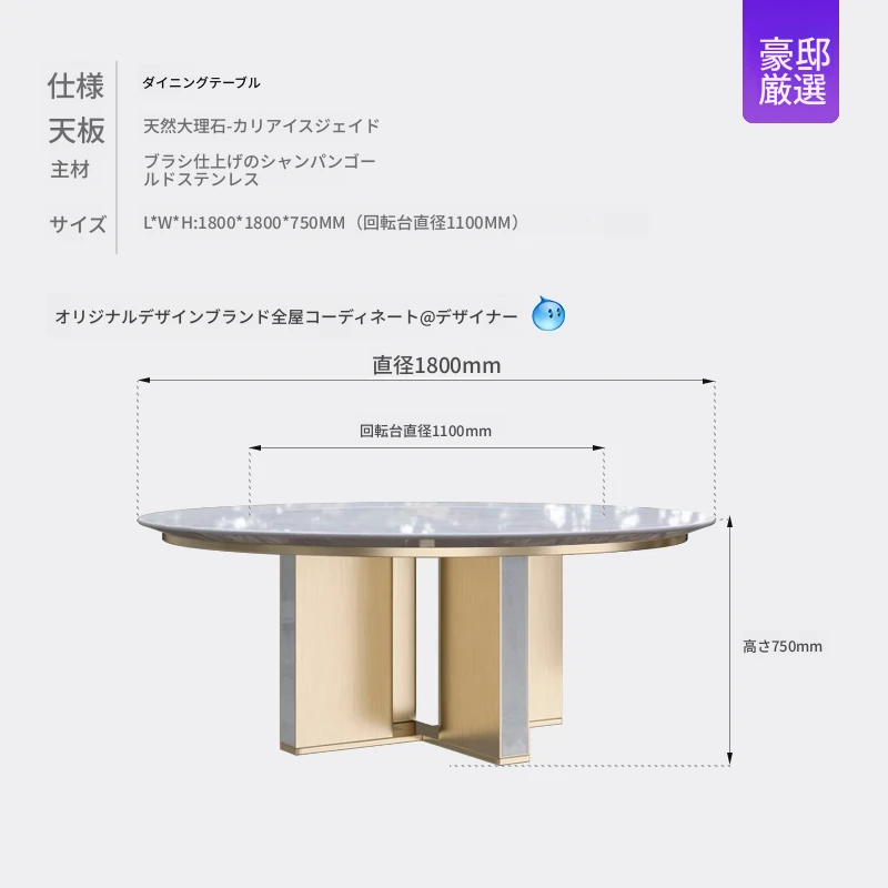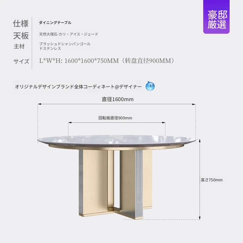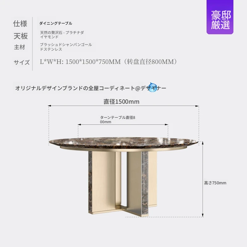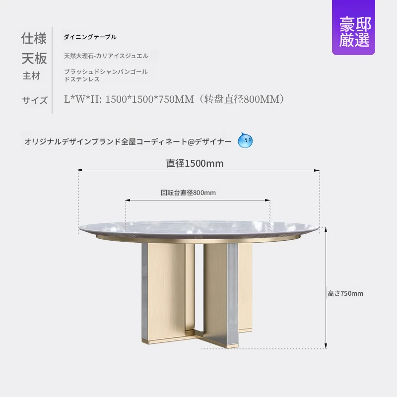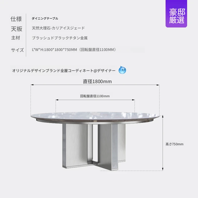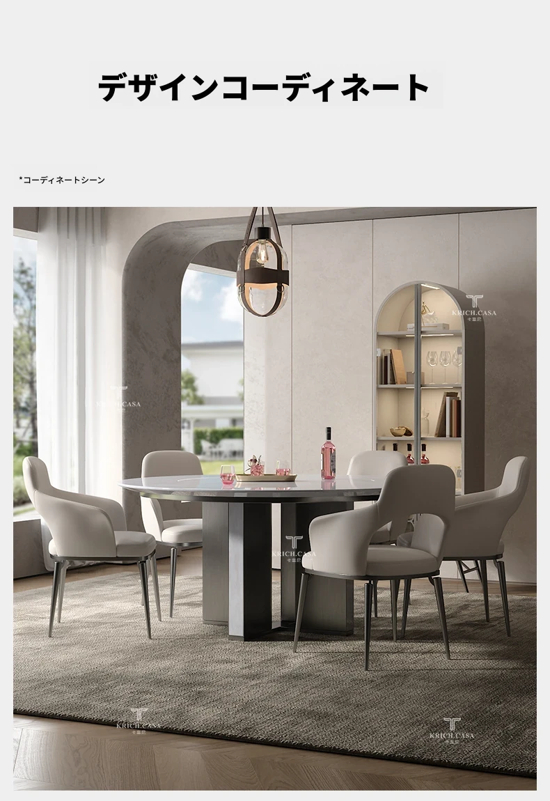 カフニ高級石製ラウンドダイニングテーブル - 天然大理石の回転盤付き、モダンな別荘スタイルの贅沢な食卓。美しいデザインと機能性を兼ね備えた、特別な食事のひとときを演出します。