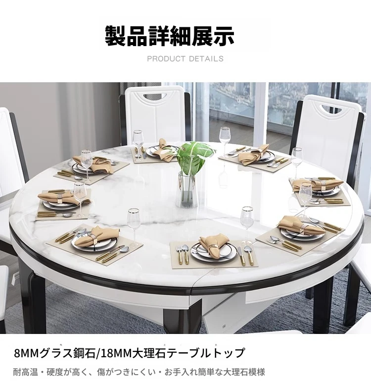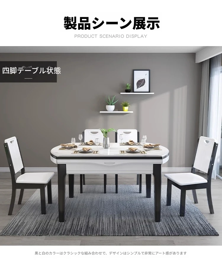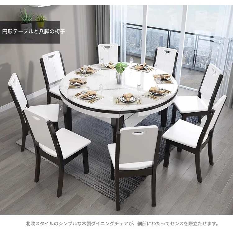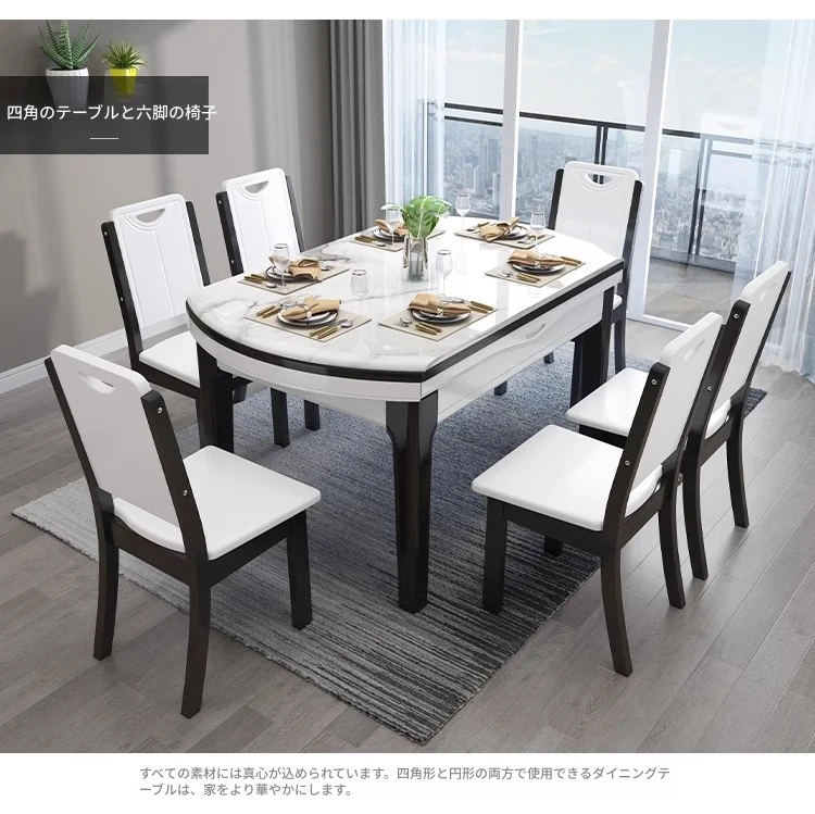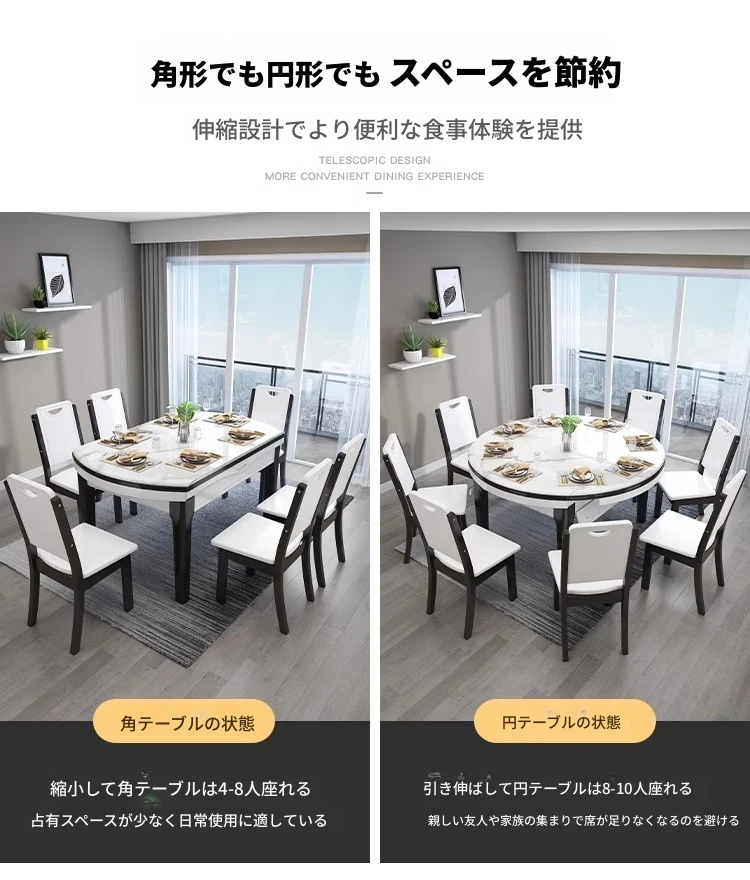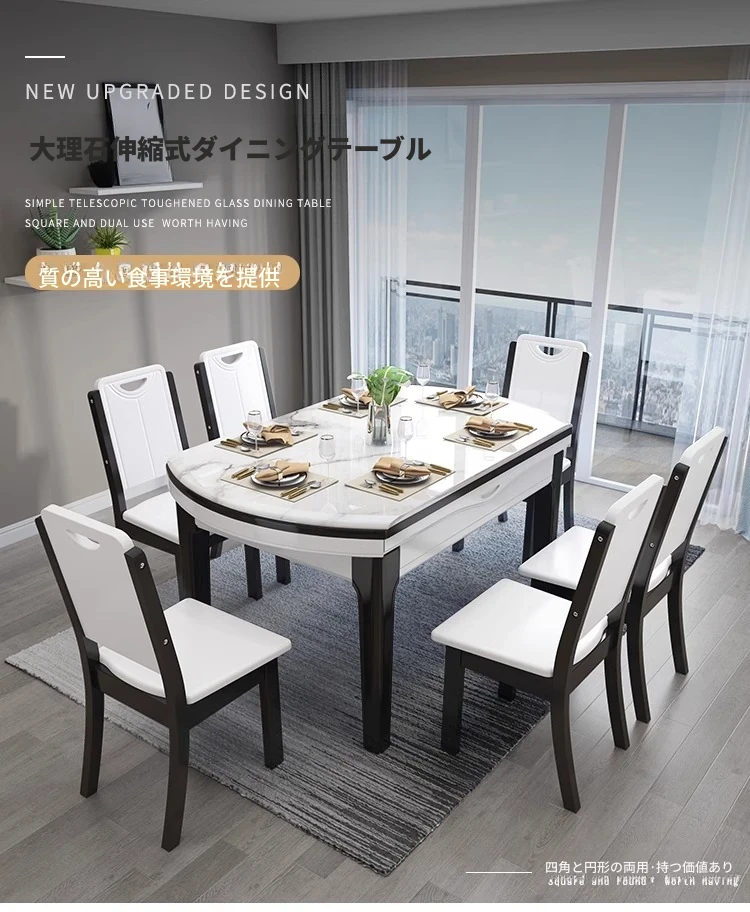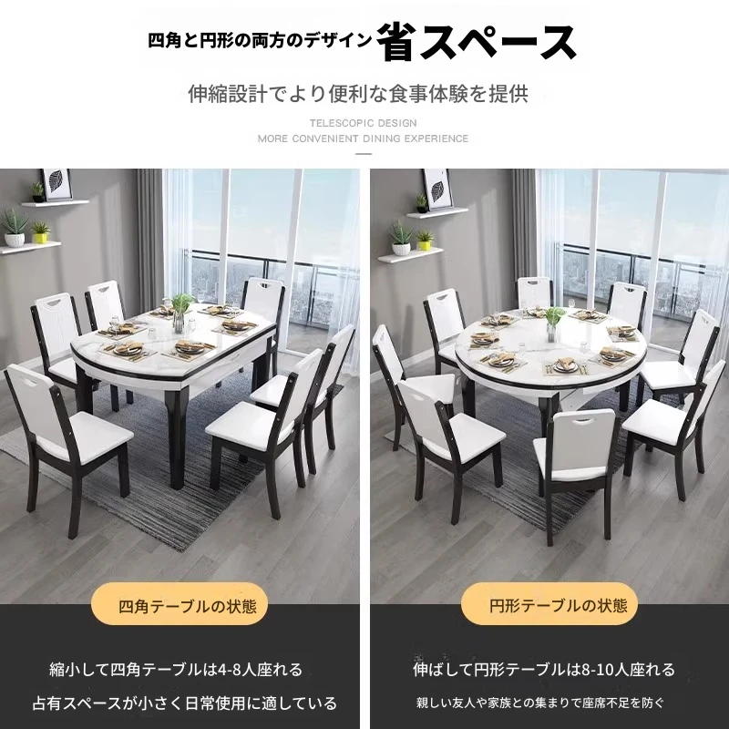 モダンでシンプルな大理石製の伸縮可能な折りたたみ円形テーブル。実木製のダイニングテーブルとチェアのセットは、小さなお部屋にもぴったり!家族や友人との楽しい食事の時間を演出します。