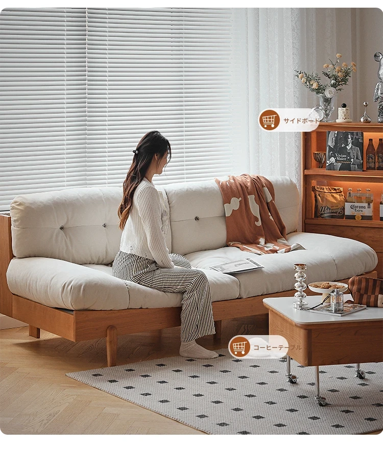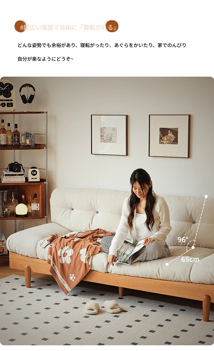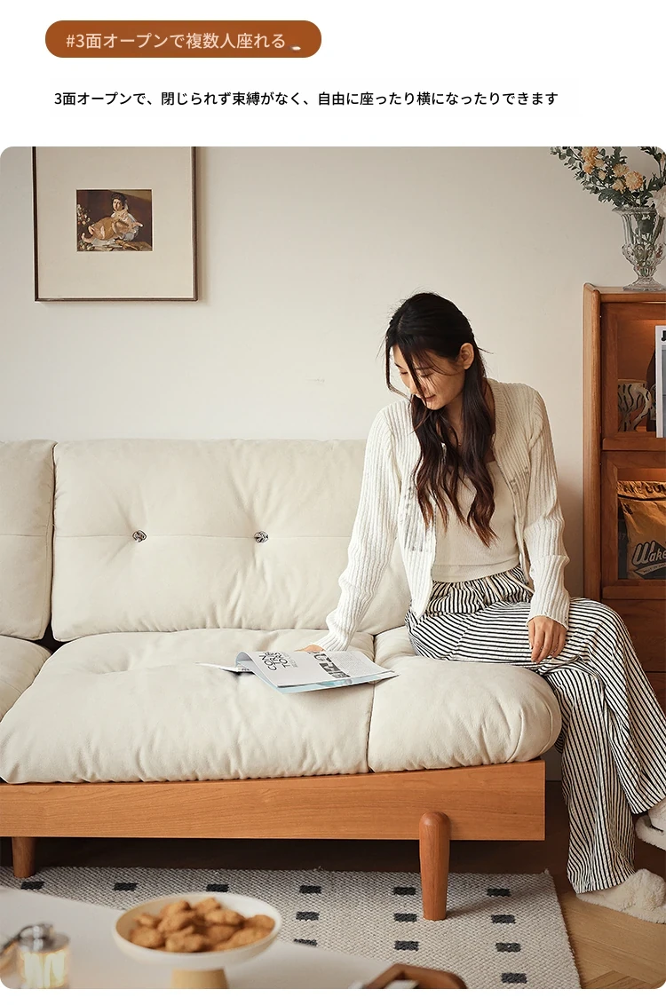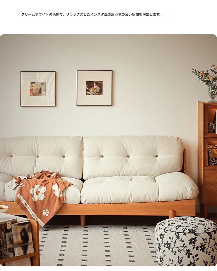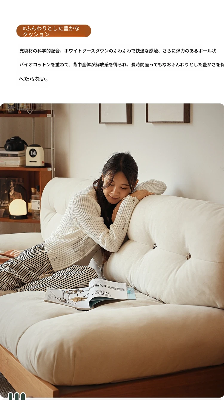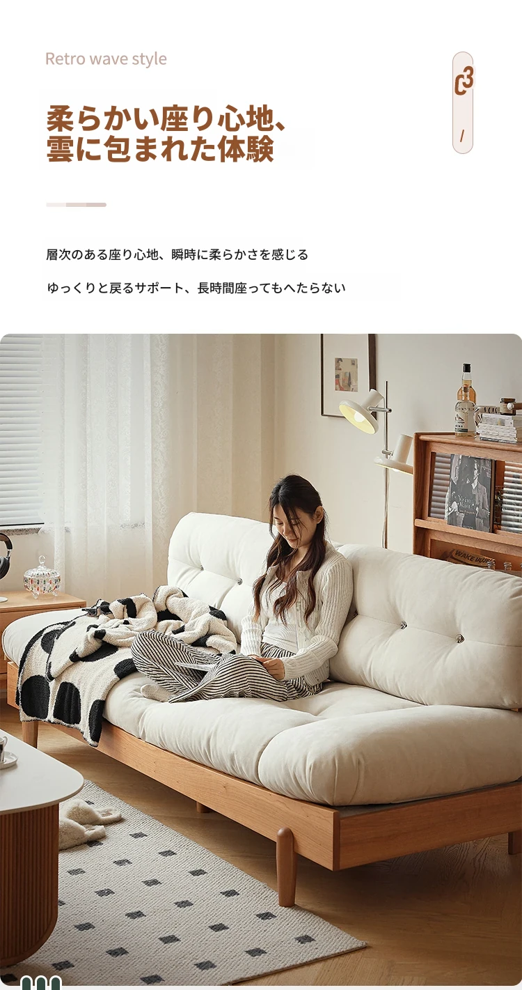 北欧風・日本式・雲のようなデザインの無垢材ソファ バクスター 小型リビングに最適!クリーミーなナチュラルウッド風の布製ソファは、取り外し可能でお手入れ簡単!快適な空間をあなたの家に。