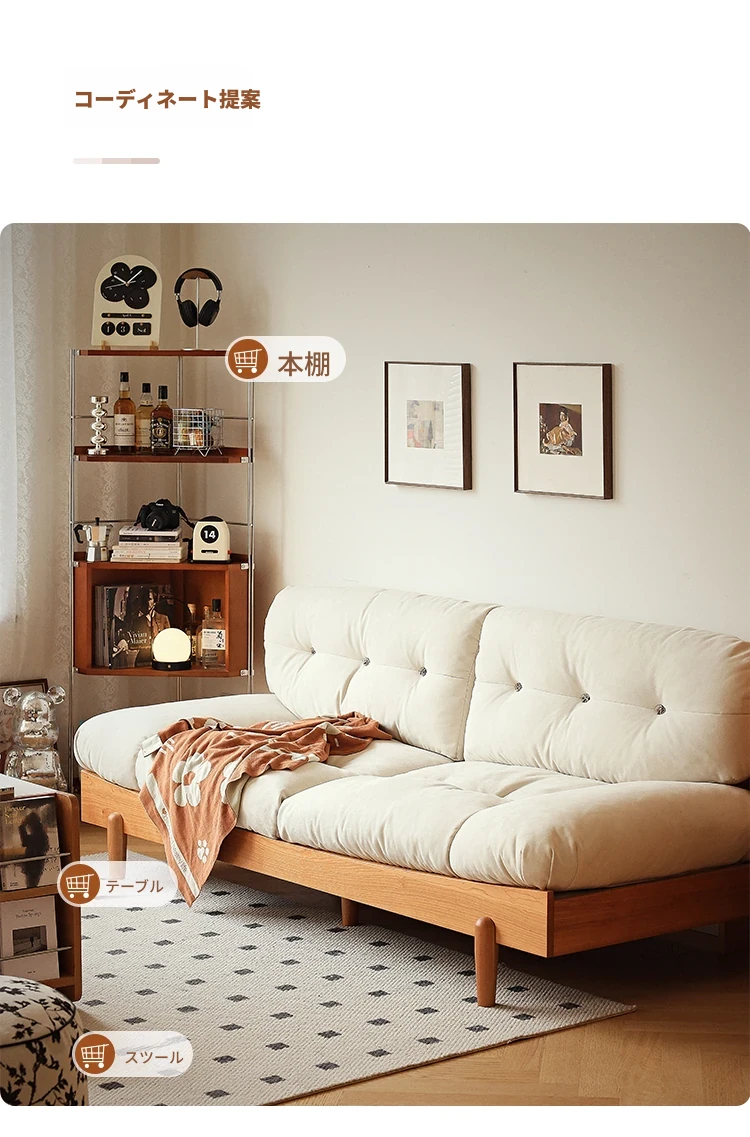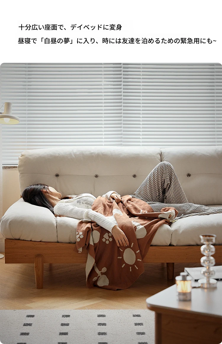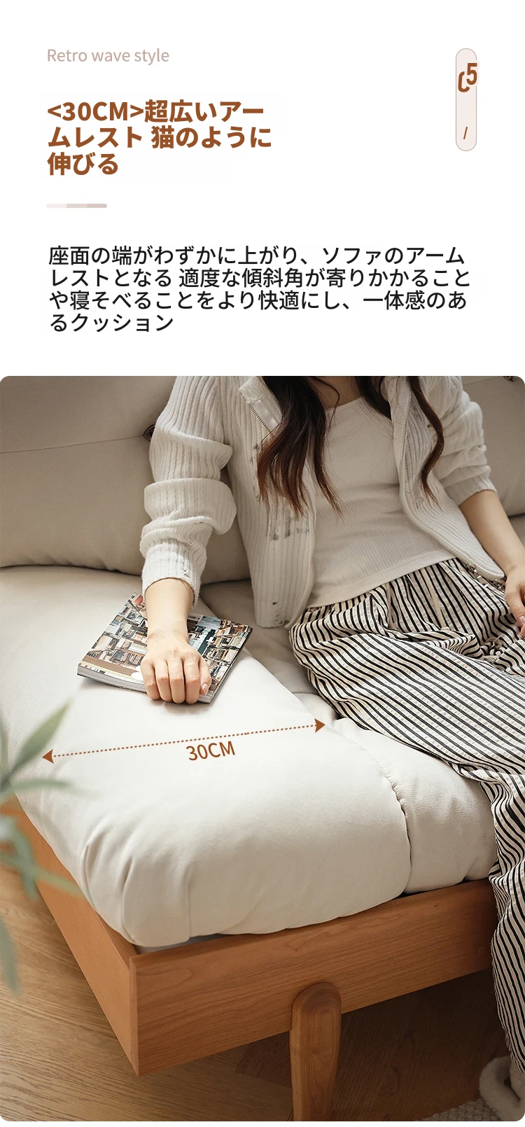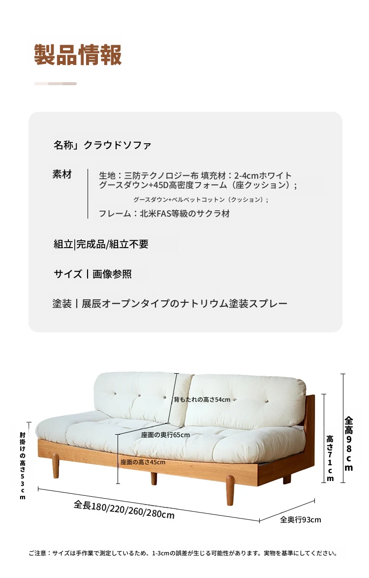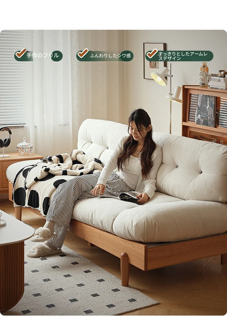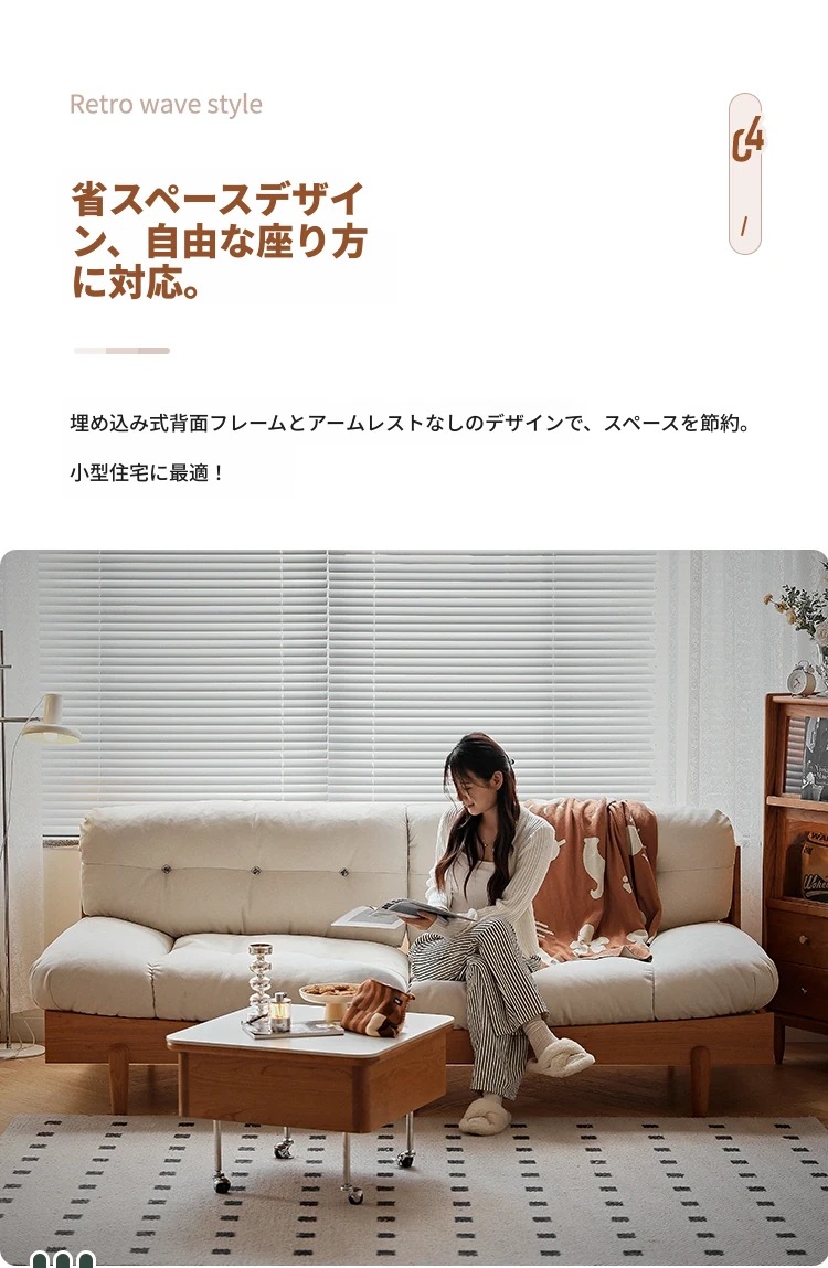 北欧風・日本式・雲のようなデザインの無垢材ソファ バクスター 小型リビングに最適!クリーミーなナチュラルウッド風の布製ソファは、取り外し可能でお手入れ簡単!快適な空間をあなたの家に。