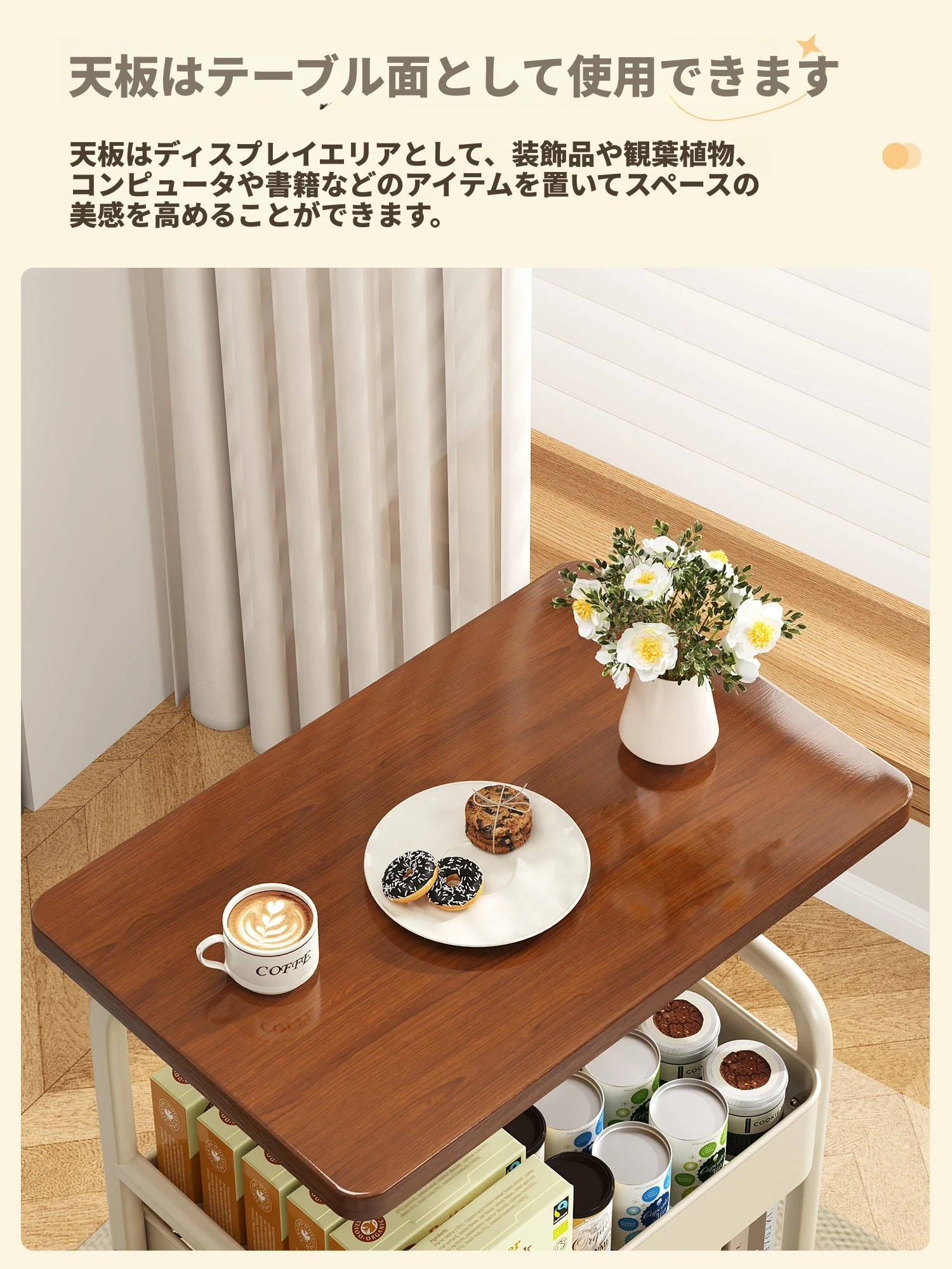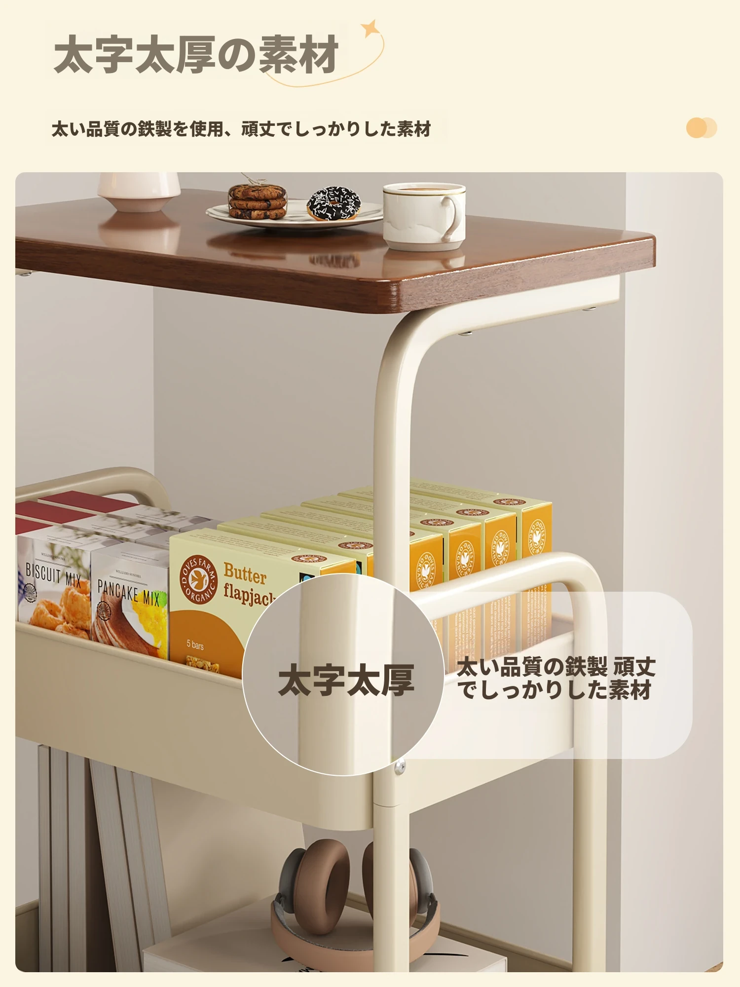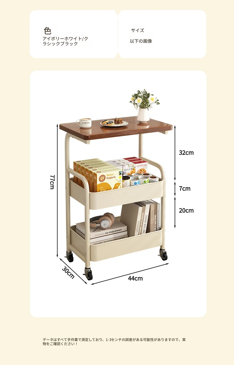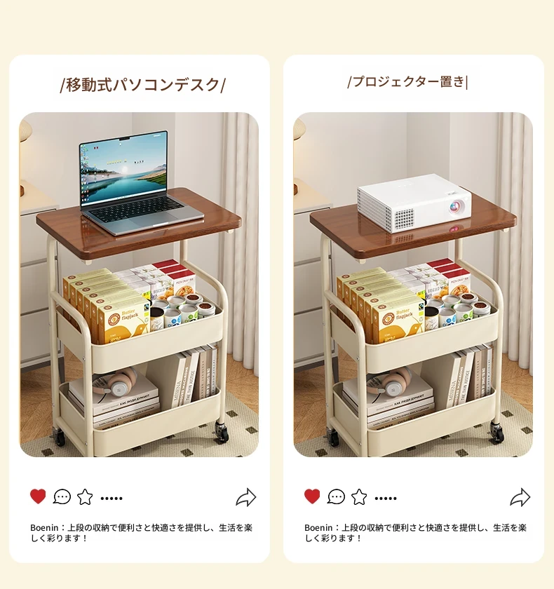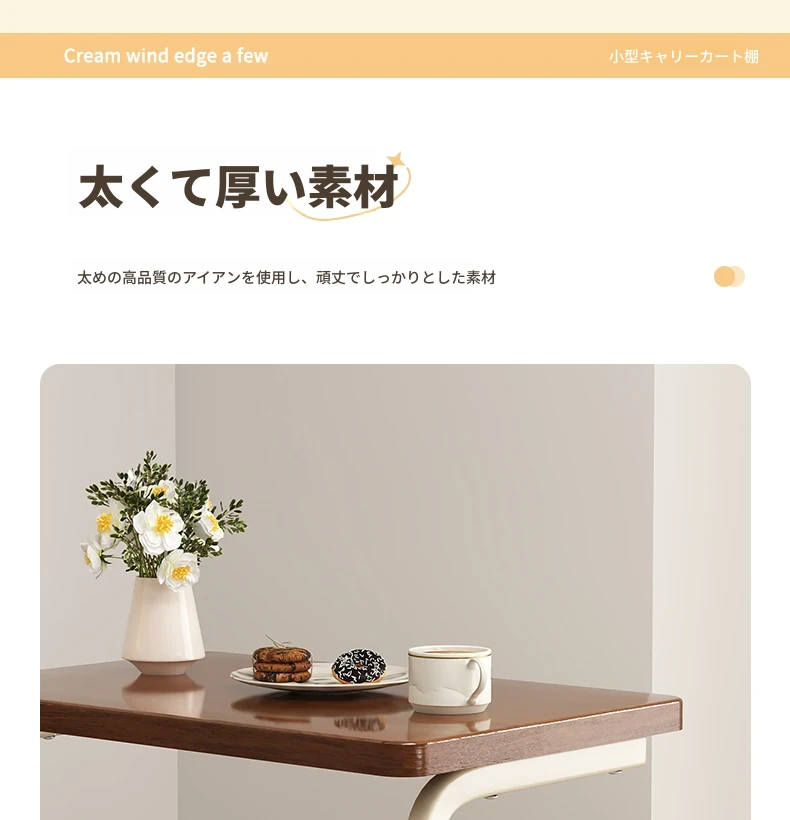 移動式スナックラック!クリーム風デザインのサイドテーブル、リビングやソファの横にぴったり。収納力抜群で、使い勝手も良好。おしゃれな空間を演出し、快適な暮らしをサポートします!