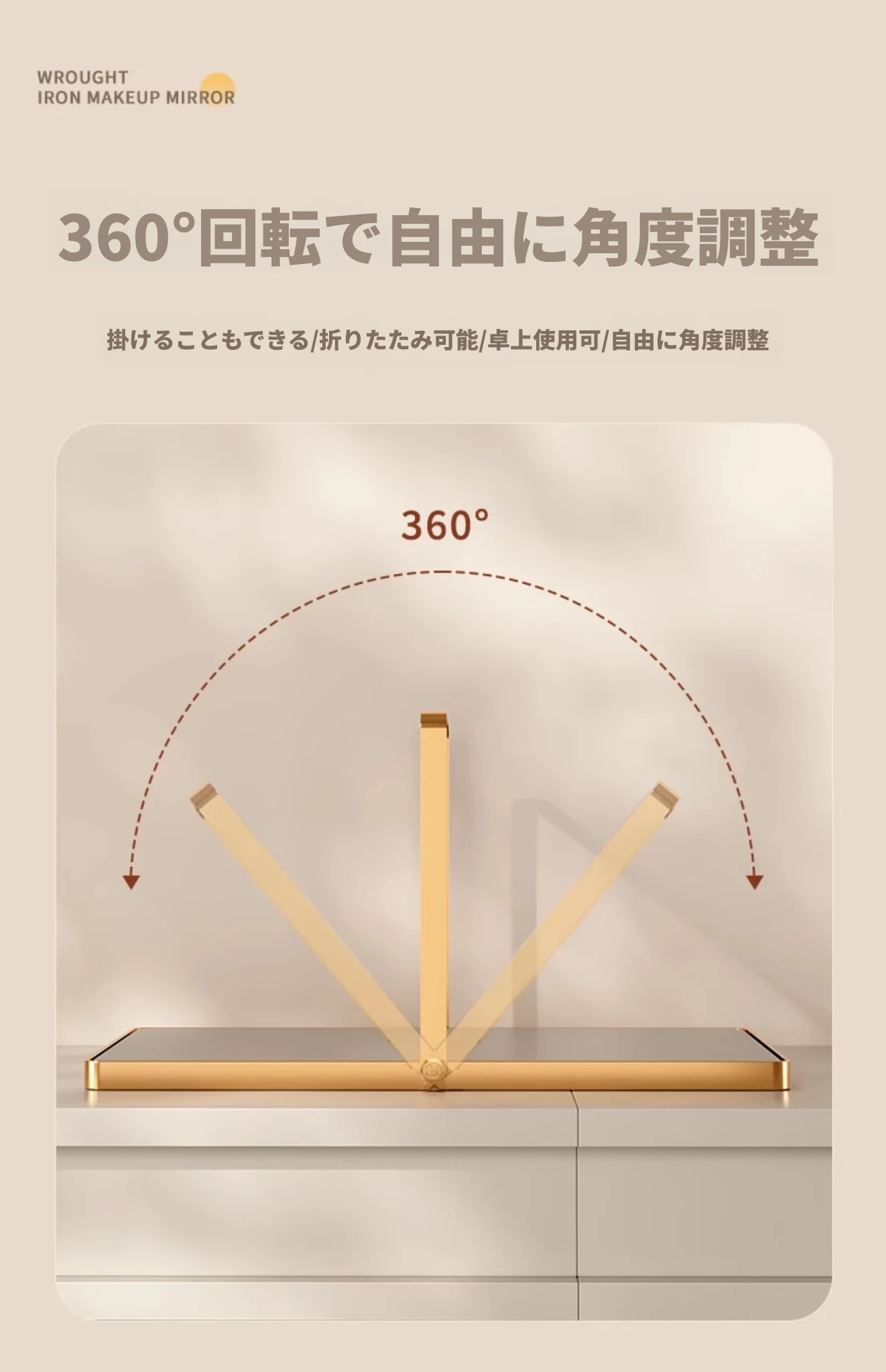 折りたたみ式の円形アイアン化粧鏡 - デスクトップ用、家庭や寝室に最適!学生寮にもぴったりな大きな鏡で、メイクアップがもっと楽しくなる!