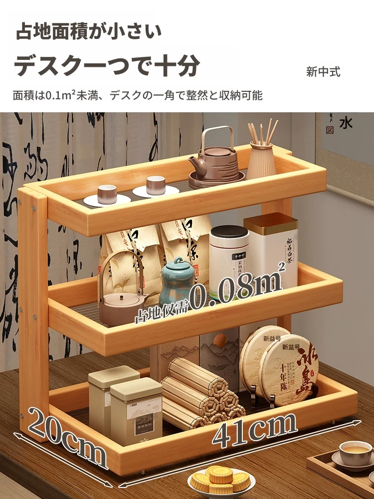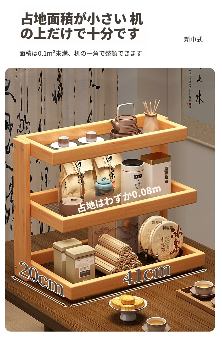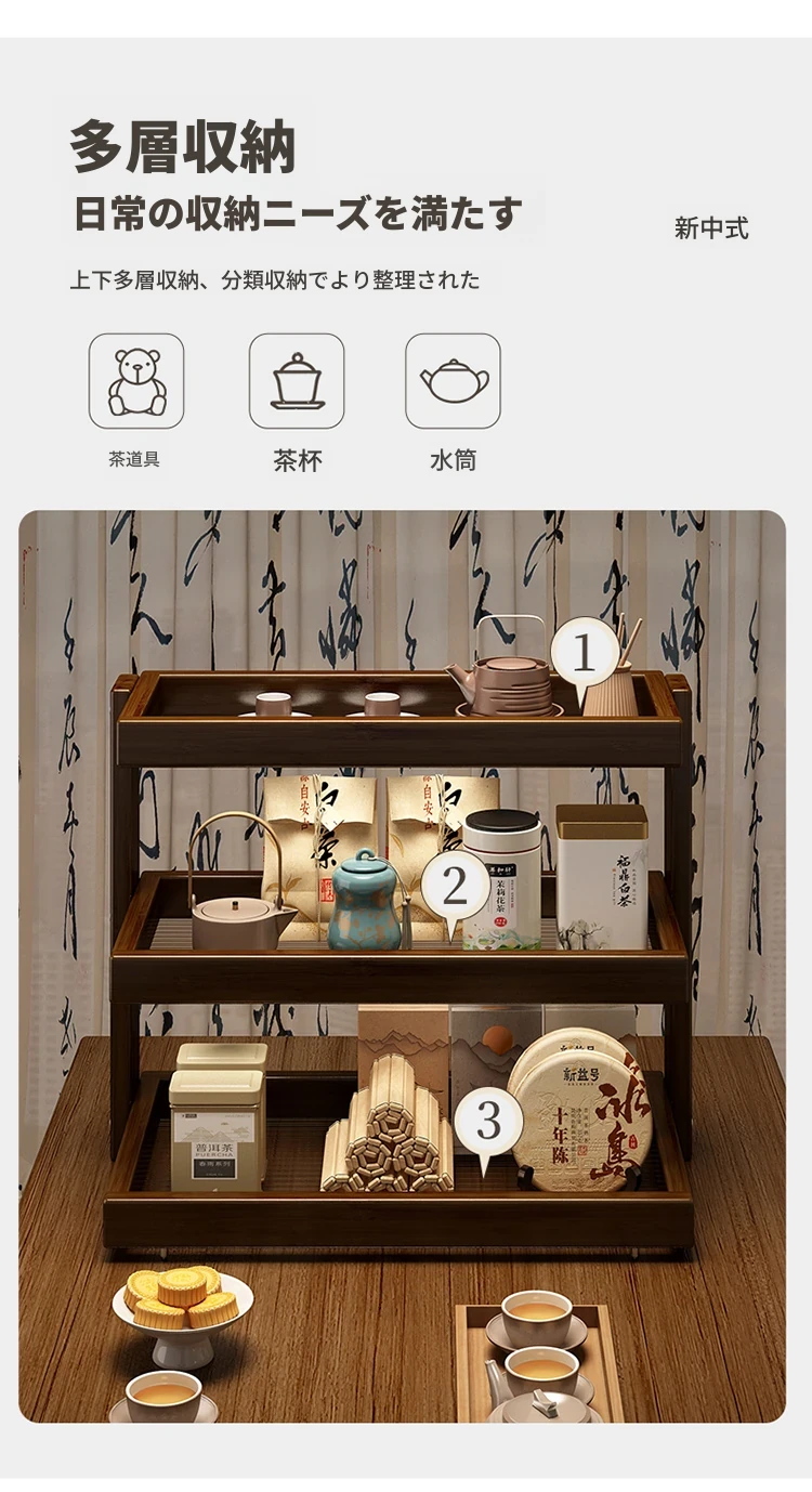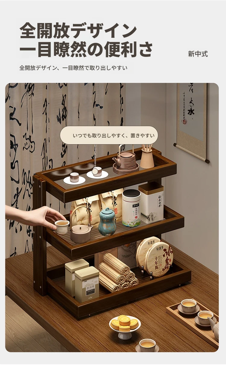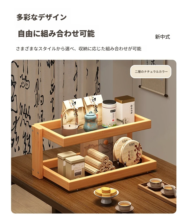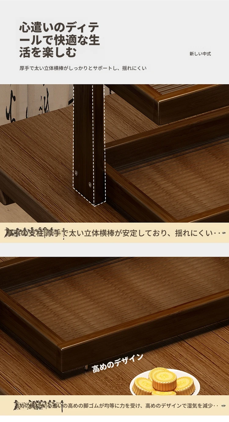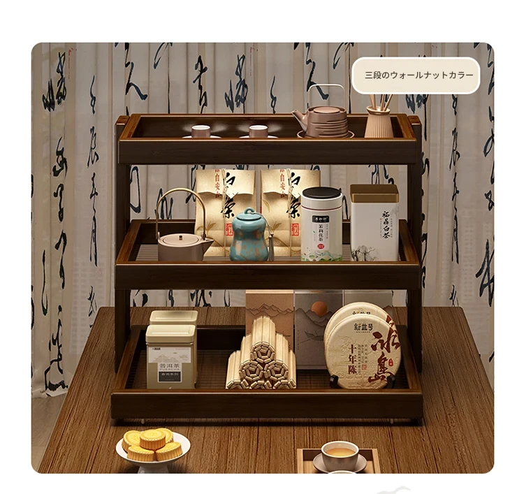 本格派の無垢材製・中華風茶器ディスプレイラック - おしゃれなティーカップ収納、リビングや茶卓の美しい飾り棚として最適!茶葉や茶具をスタイリッシュに演出し、空間を華やかに彩ります。