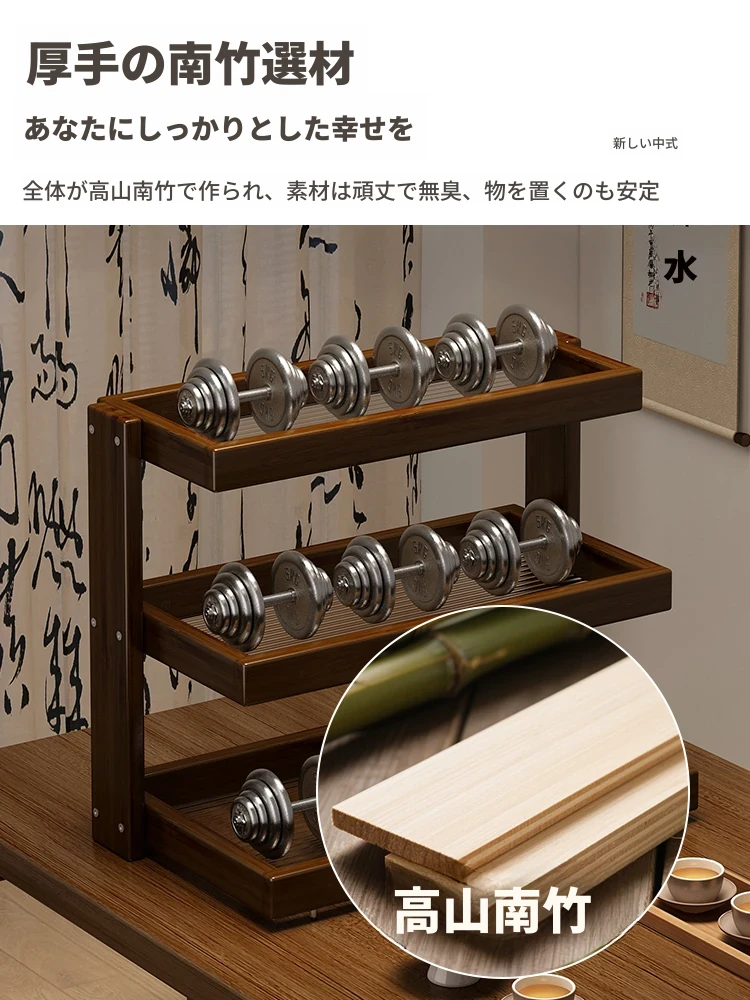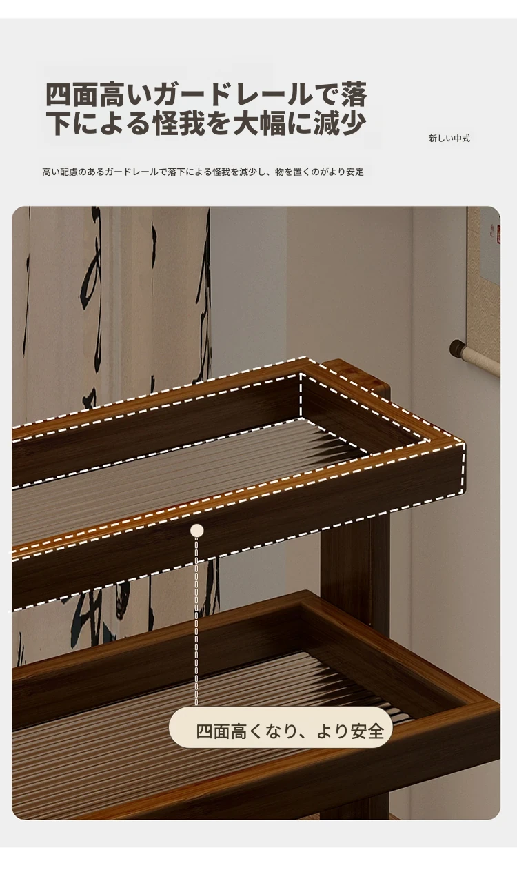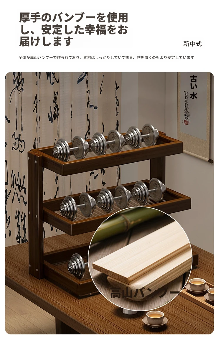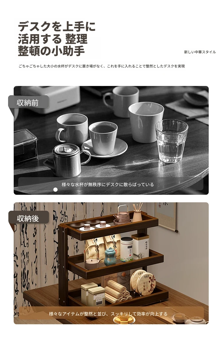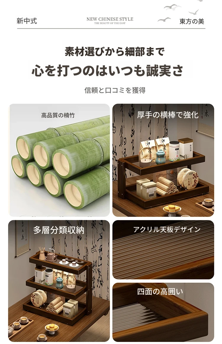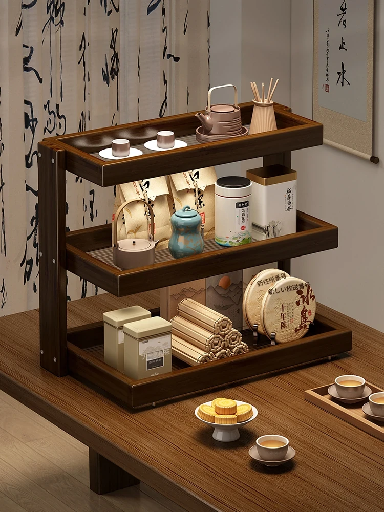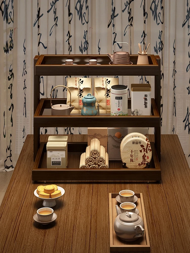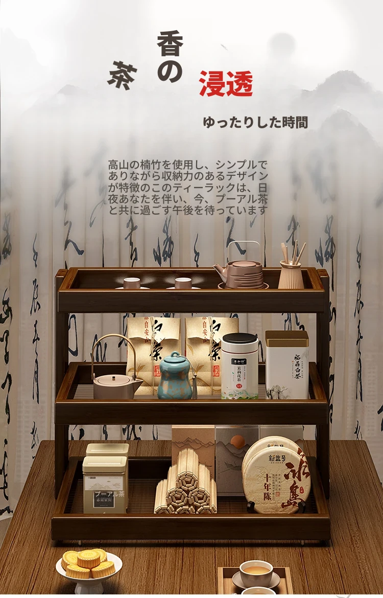 本格派の無垢材製・中華風茶器ディスプレイラック - おしゃれなティーカップ収納、リビングや茶卓の美しい飾り棚として最適!茶葉や茶具をスタイリッシュに演出し、空間を華やかに彩ります。