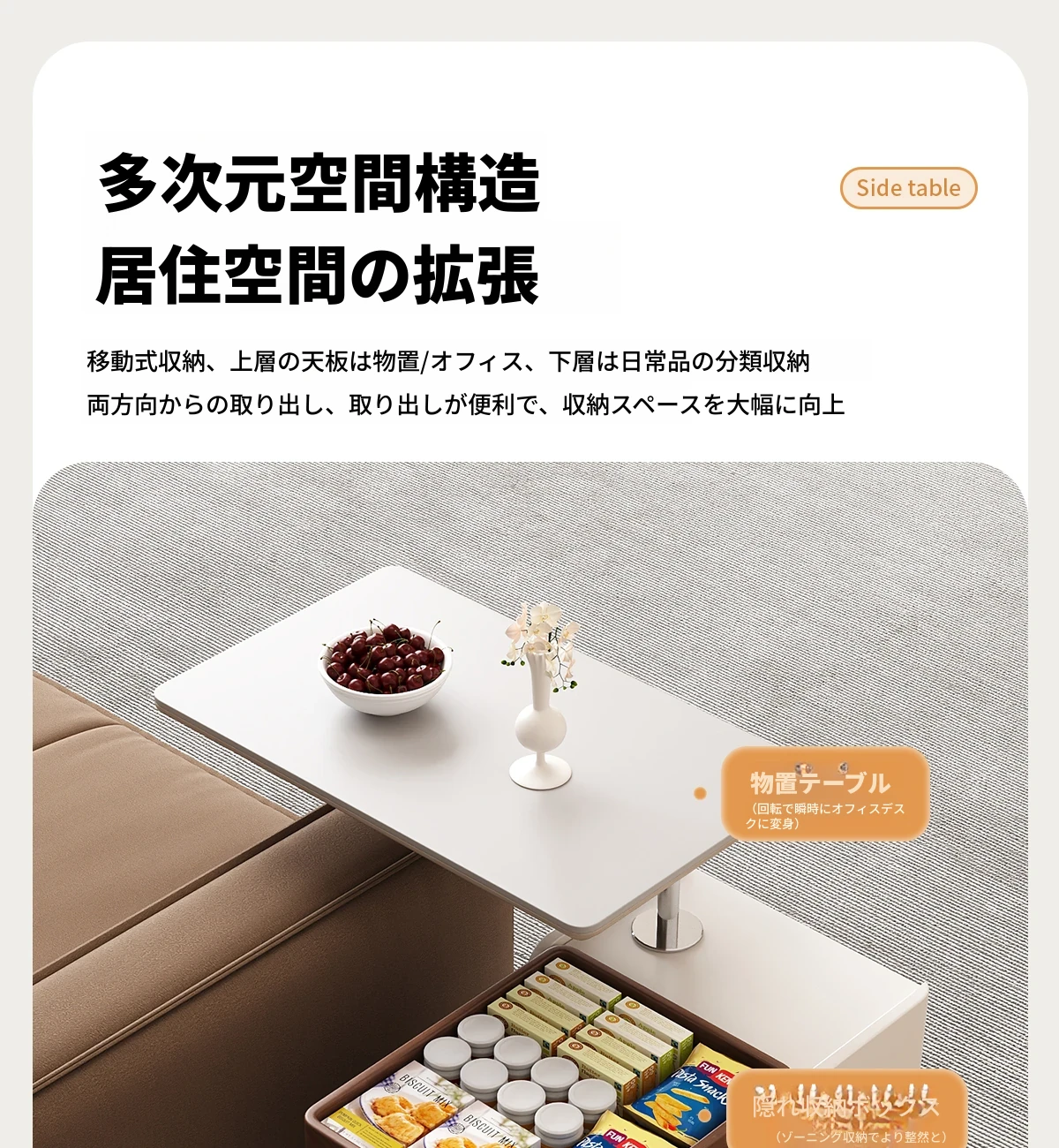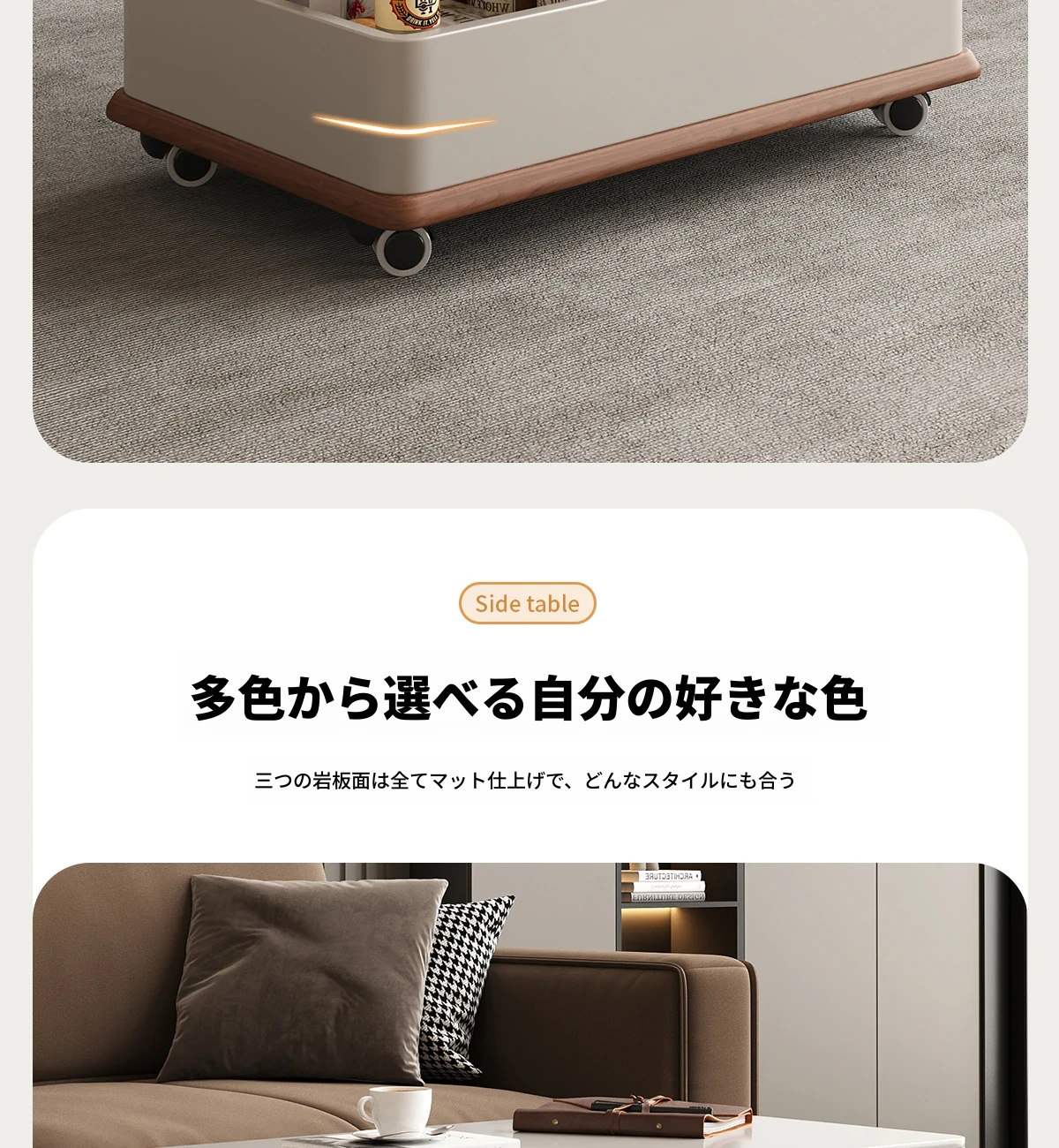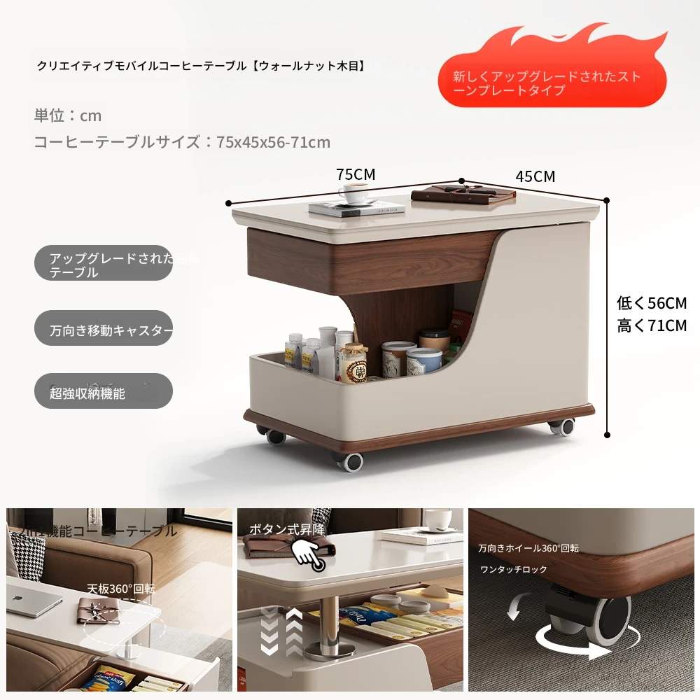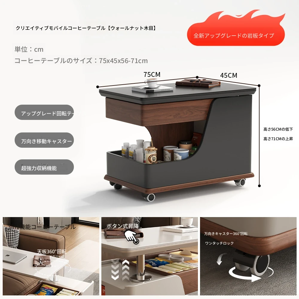 移動式サイドテーブル!スタイリッシュなロック付き昇降機能付き。リビングやベッドサイドに最適な便利なストレージ。高級感あふれる岩板デザインで、おしゃれな空間を演出します。