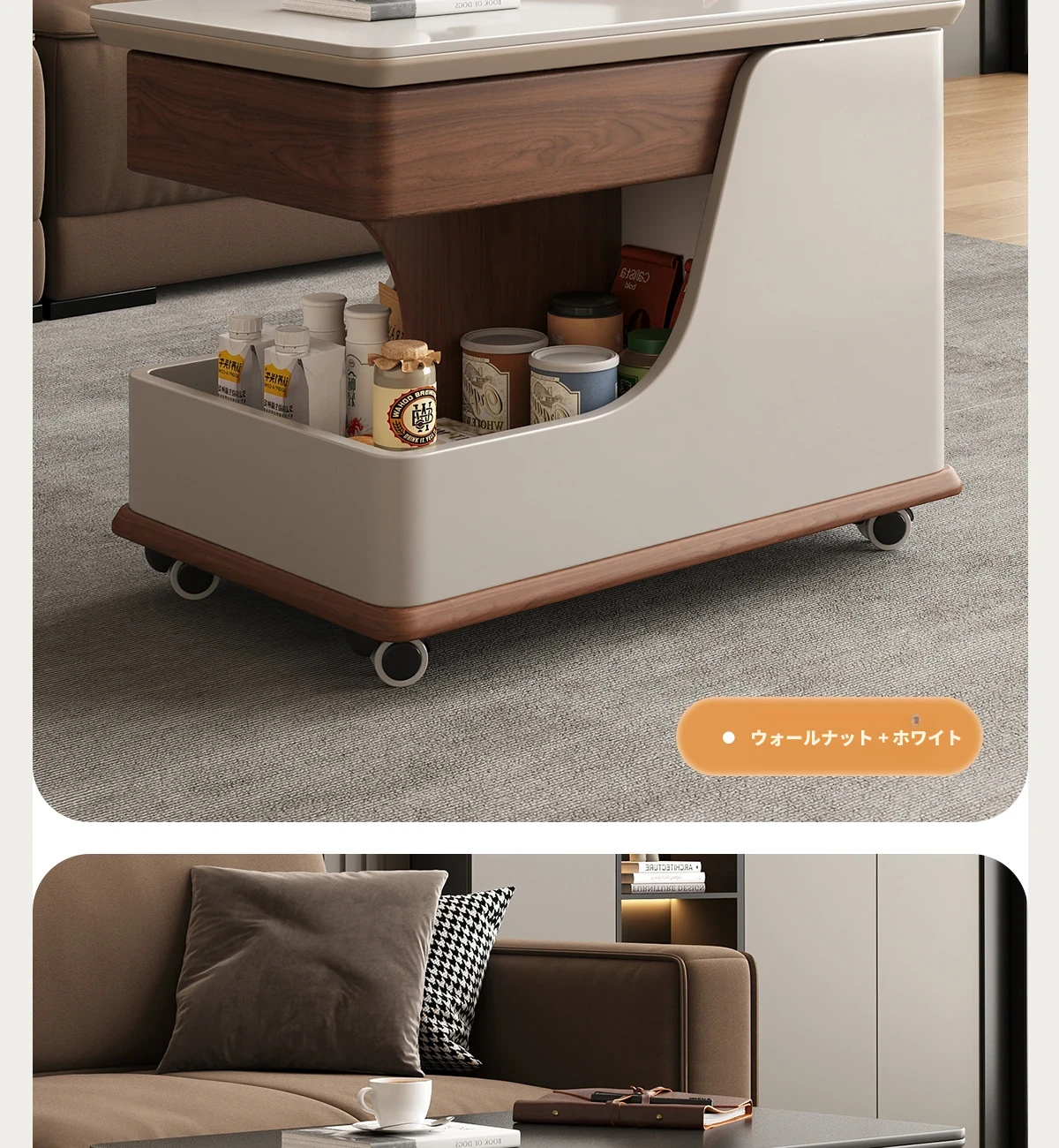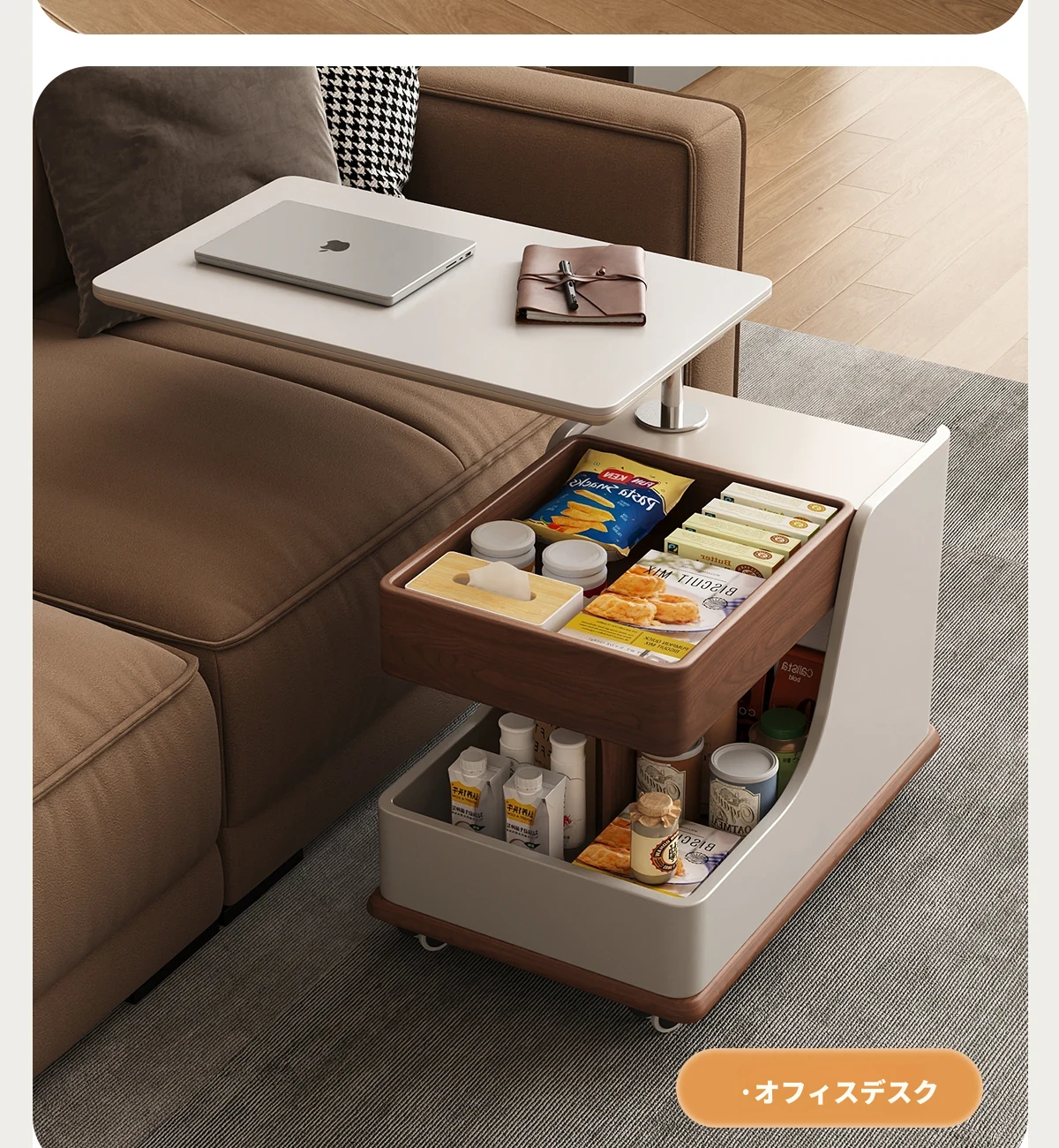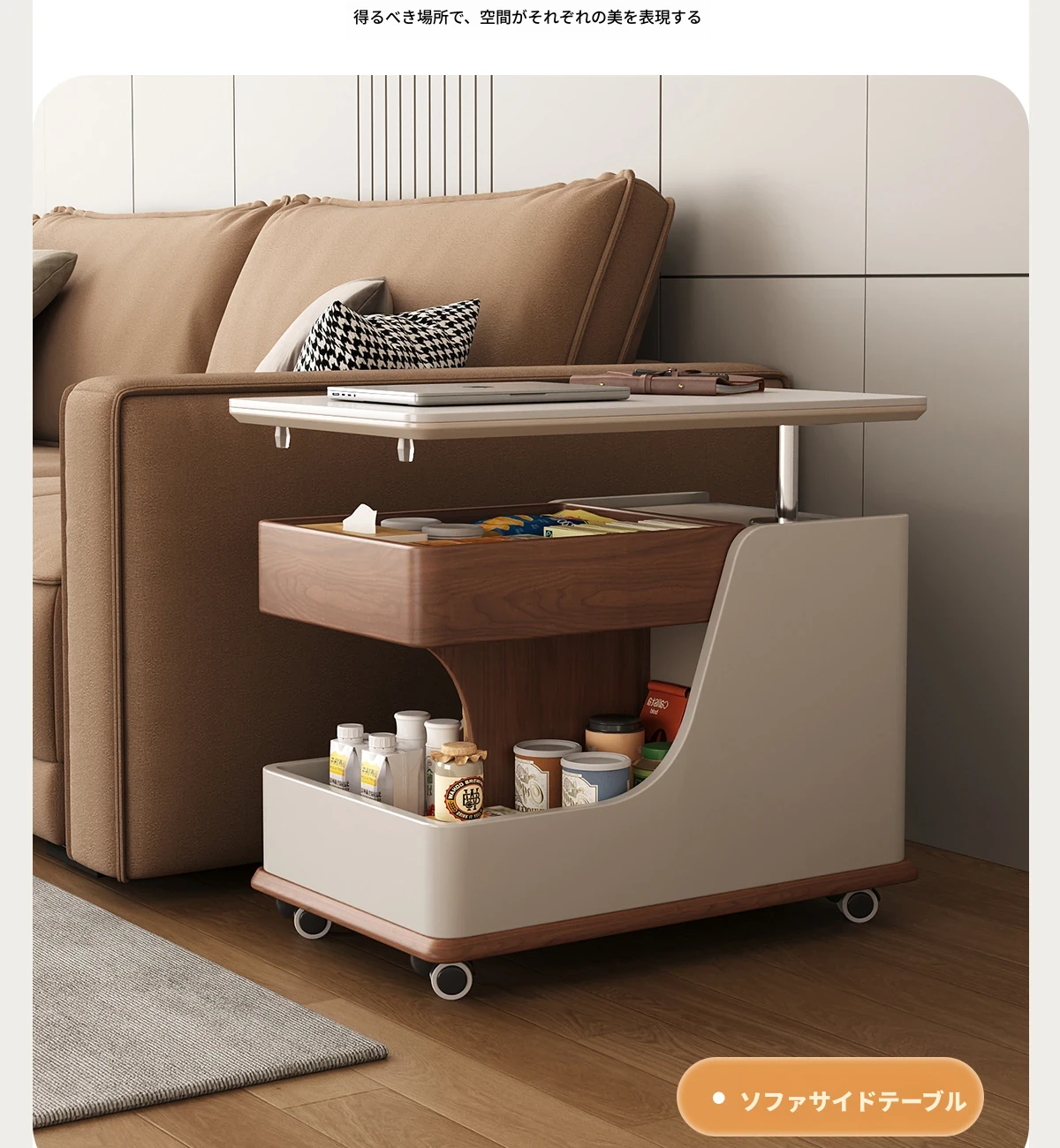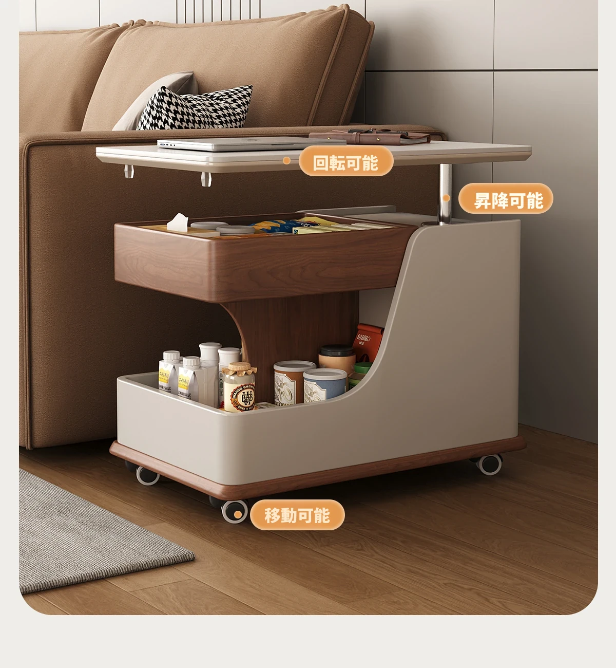 【ホワイト+ウォールナット色】移動式昇降小推車サイドテーブル【組立配送】