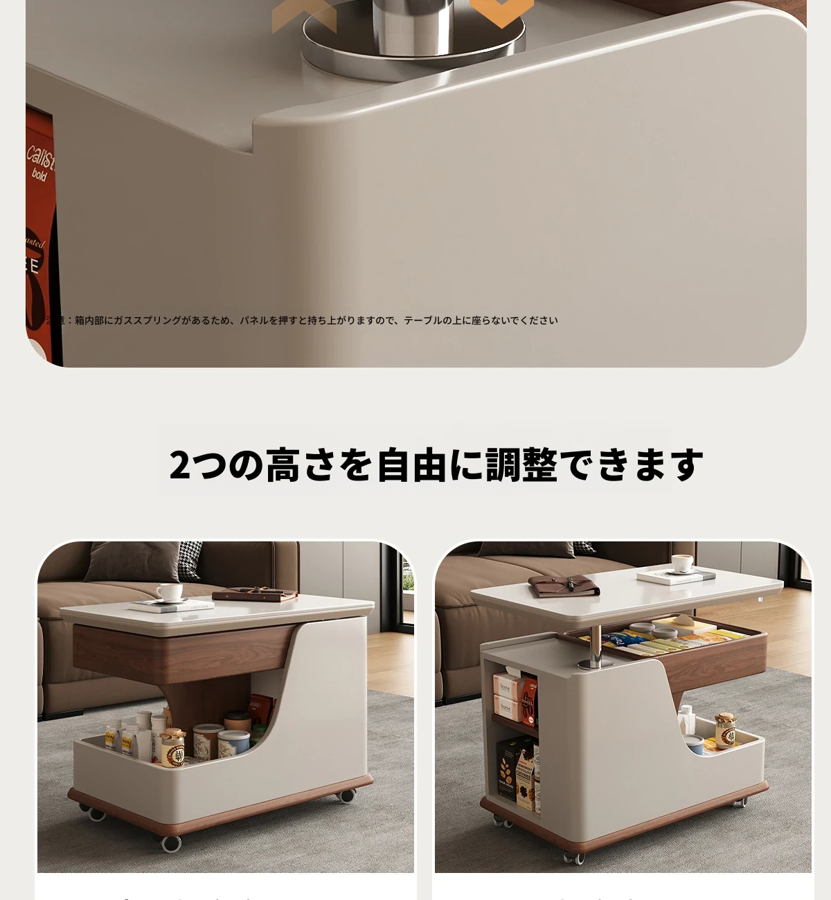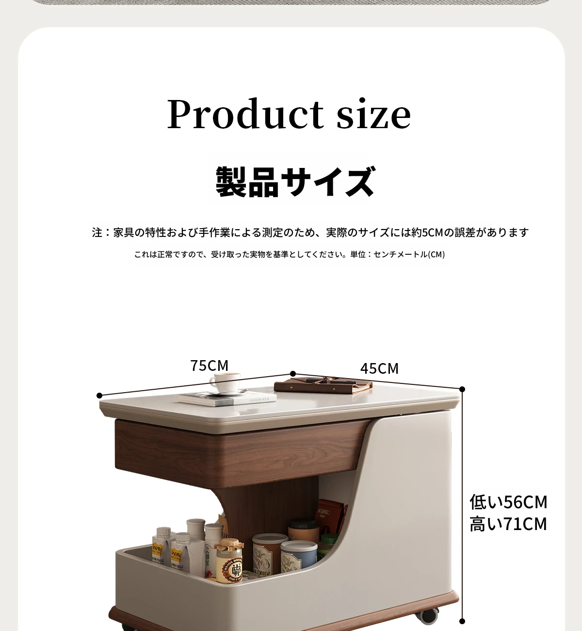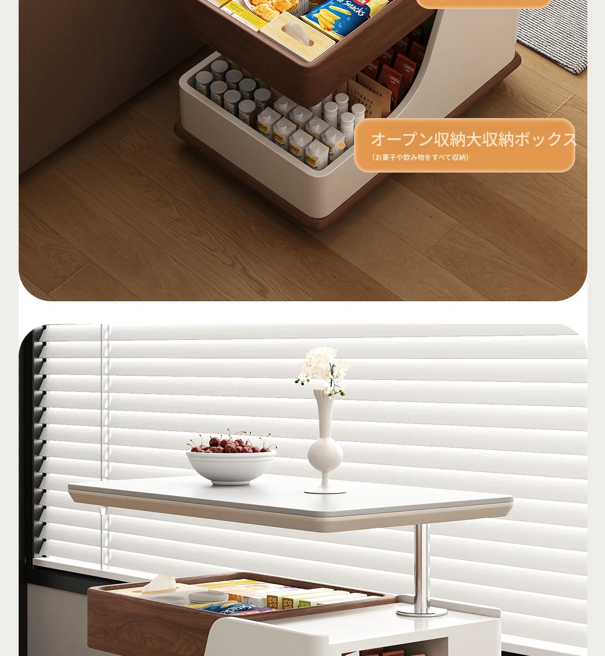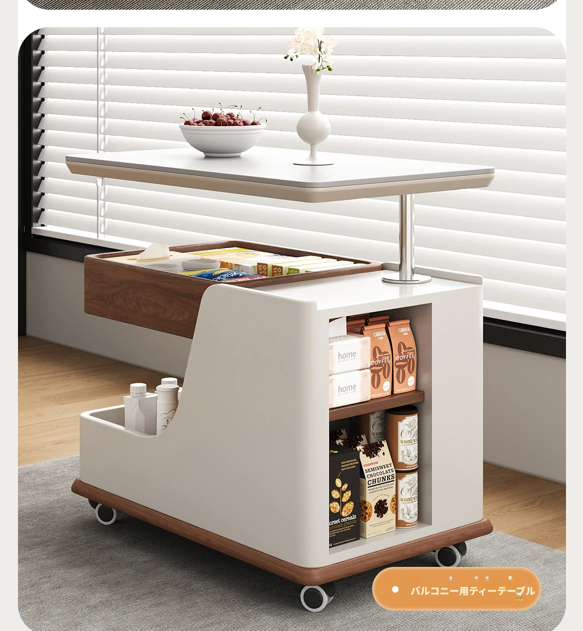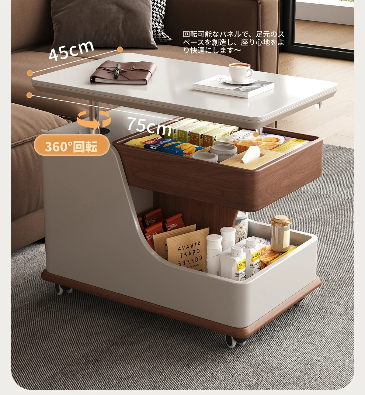 【ホワイト+ウォールナット色】移動式昇降小推車サイドテーブル【組立配送】