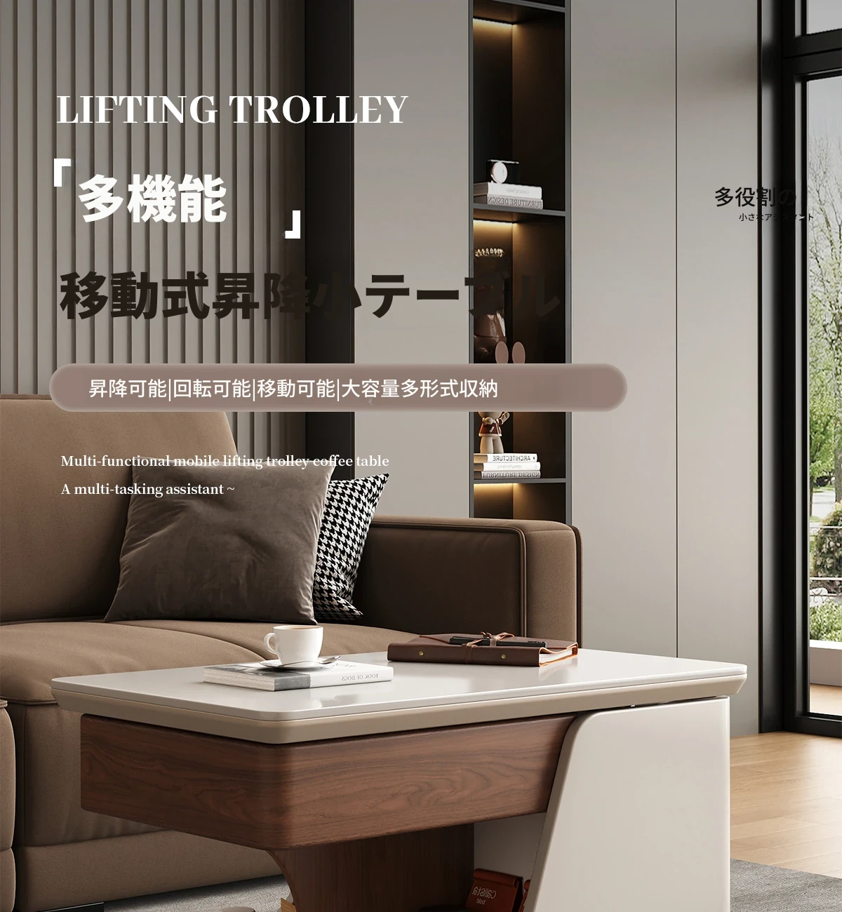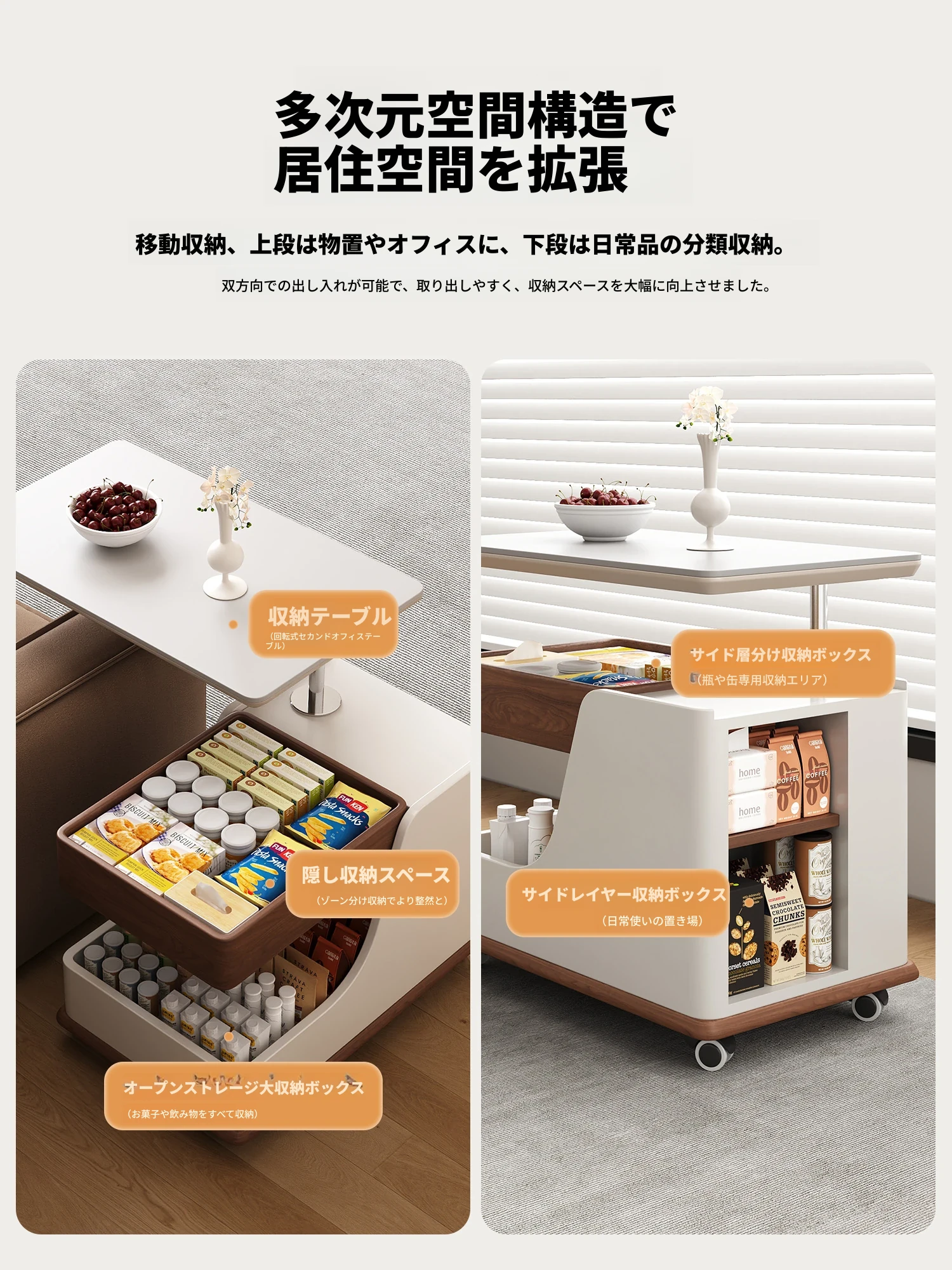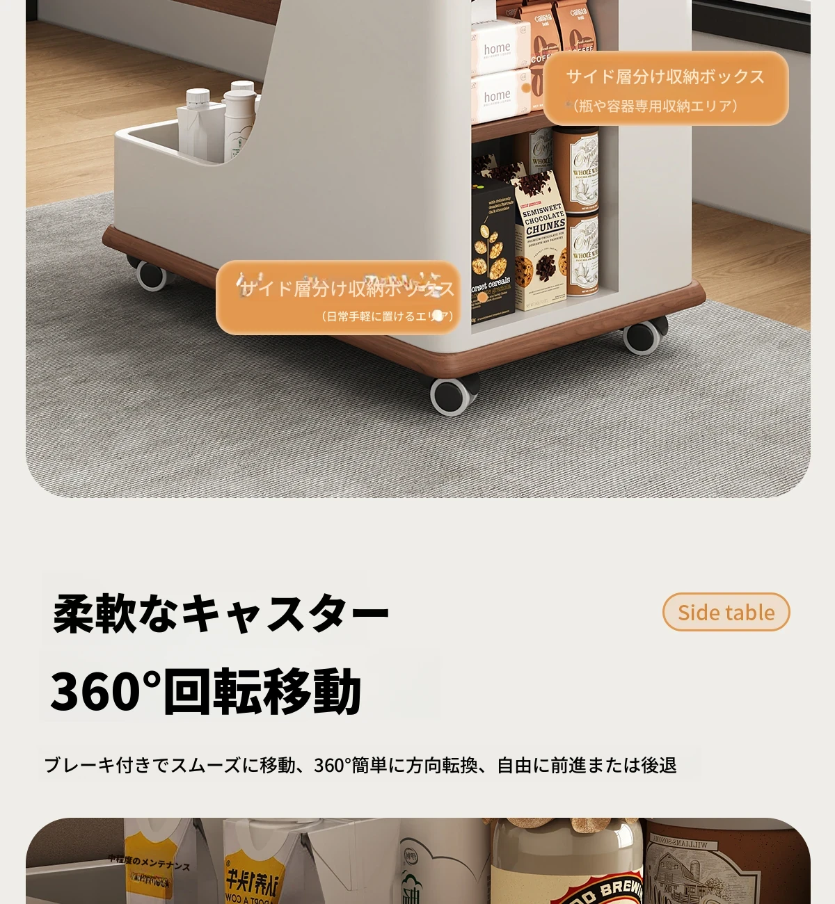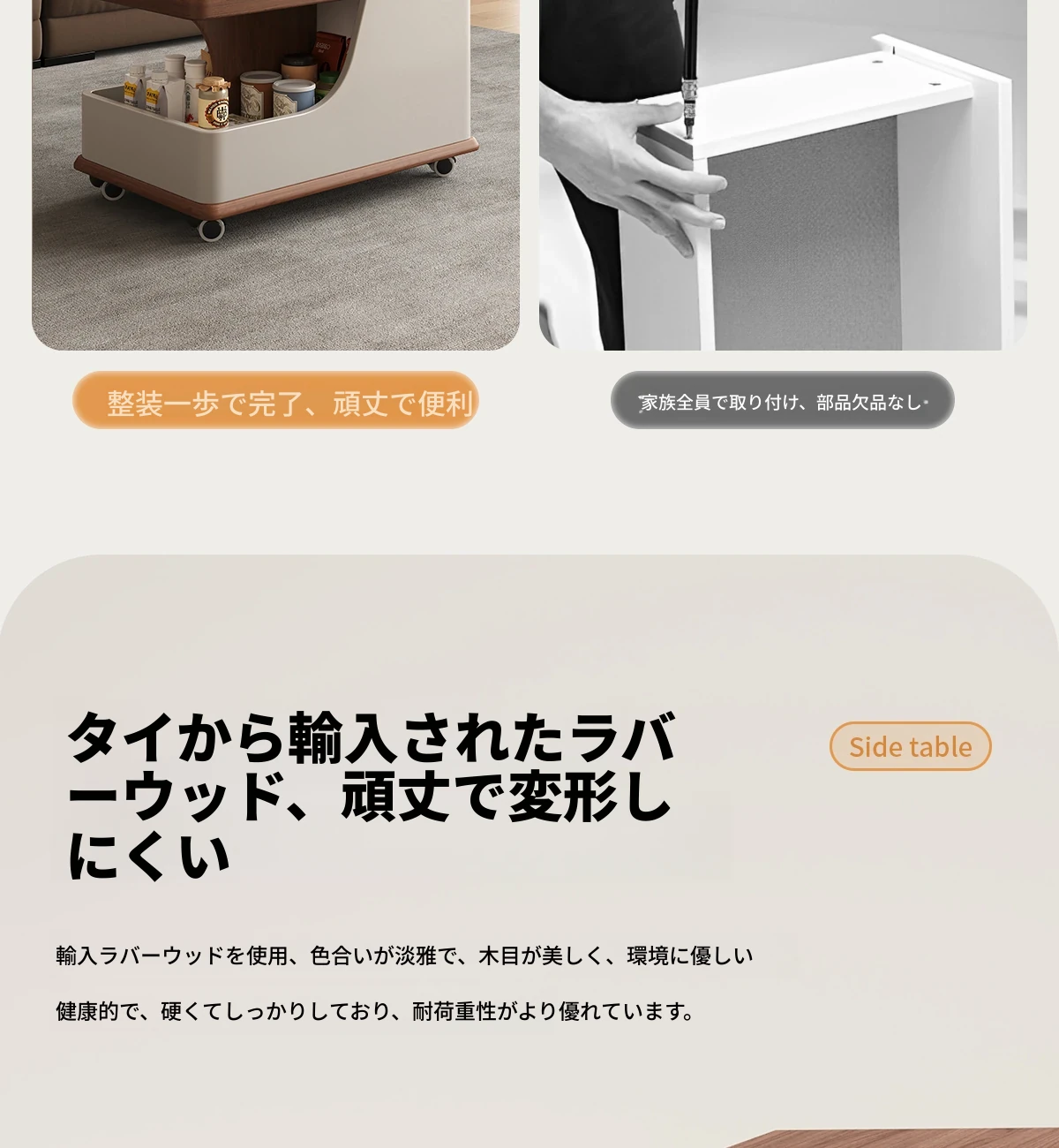 【ホワイト+ウォールナット色】移動式昇降小推車サイドテーブル【組立配送】