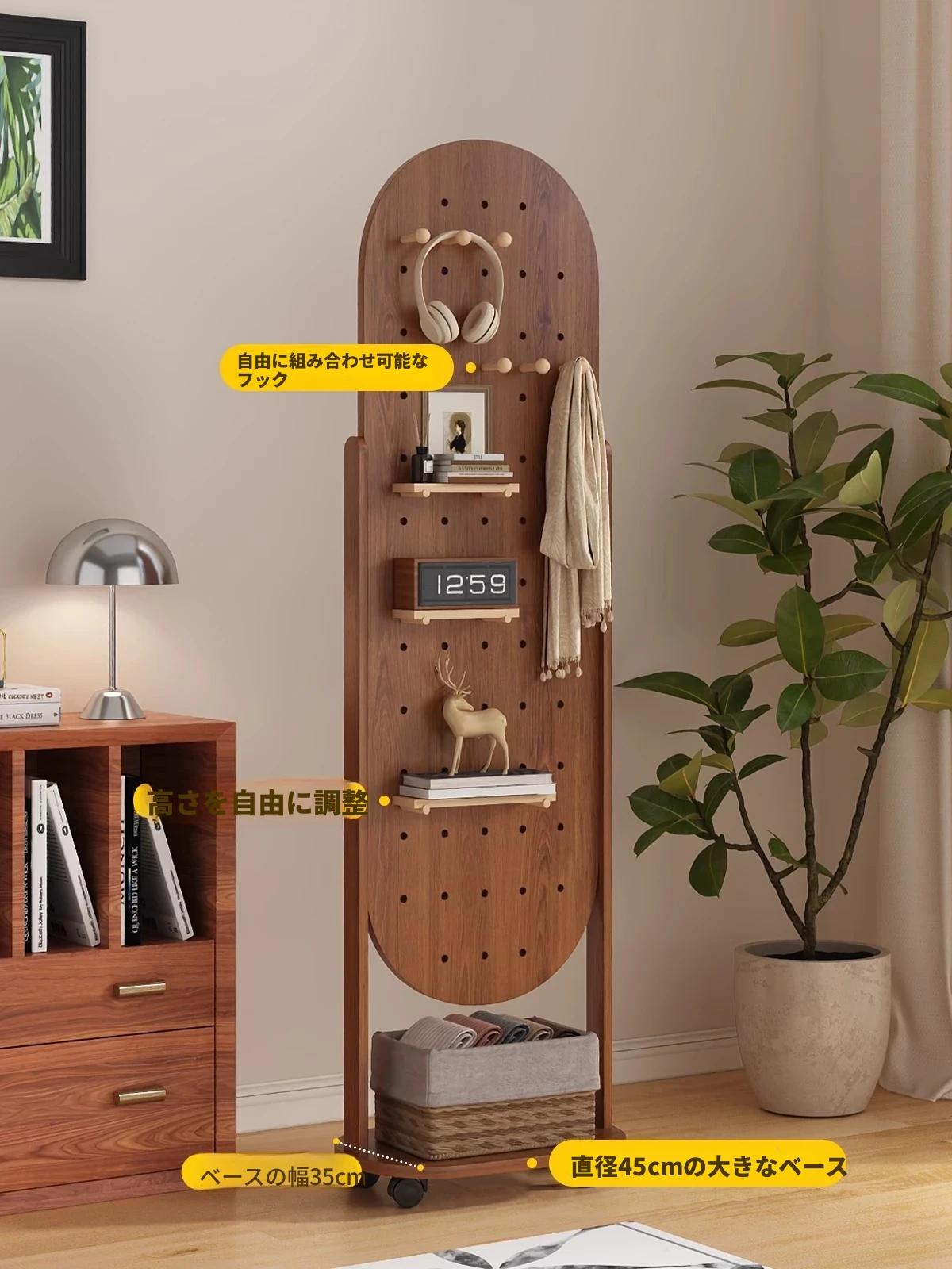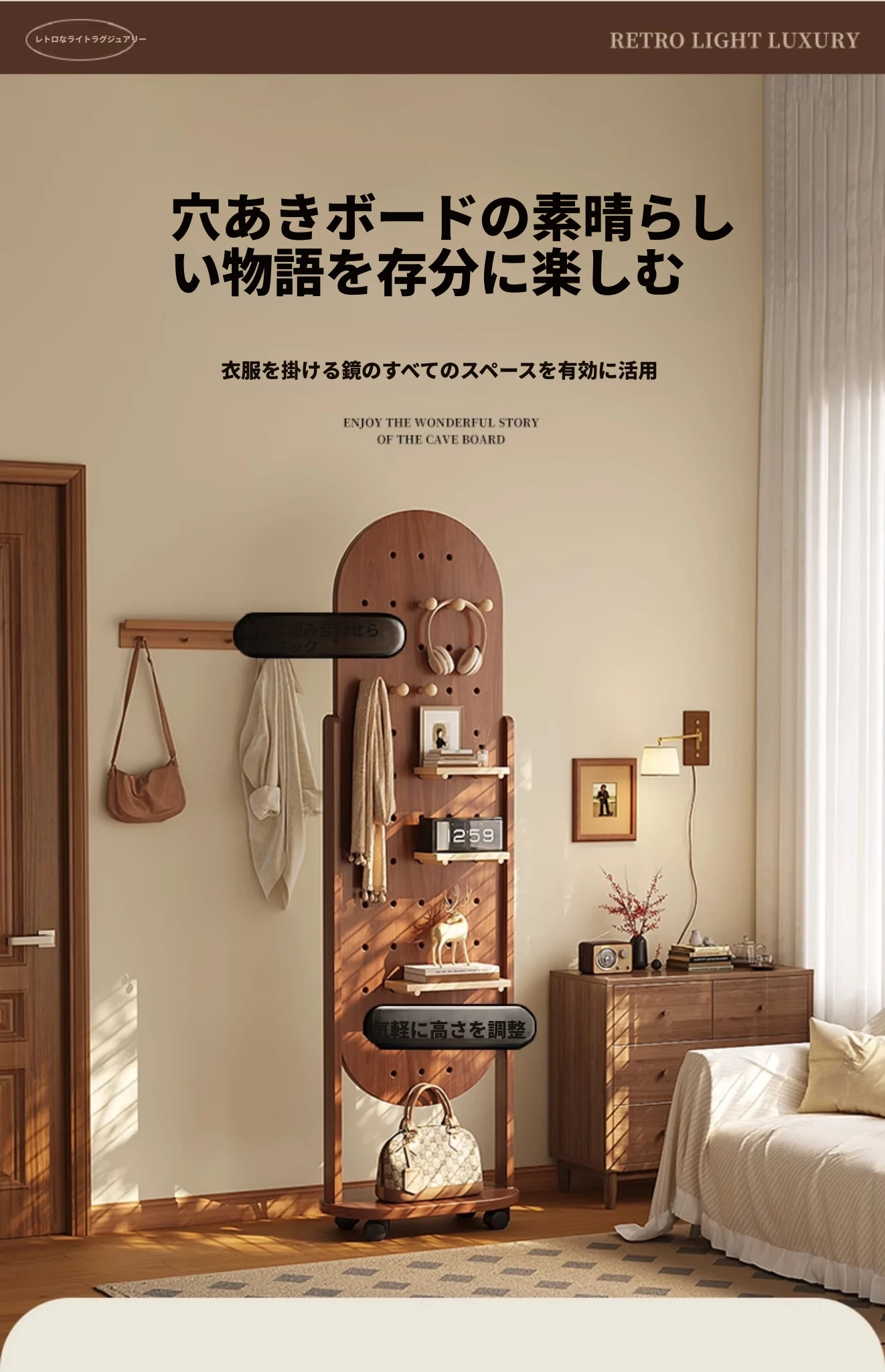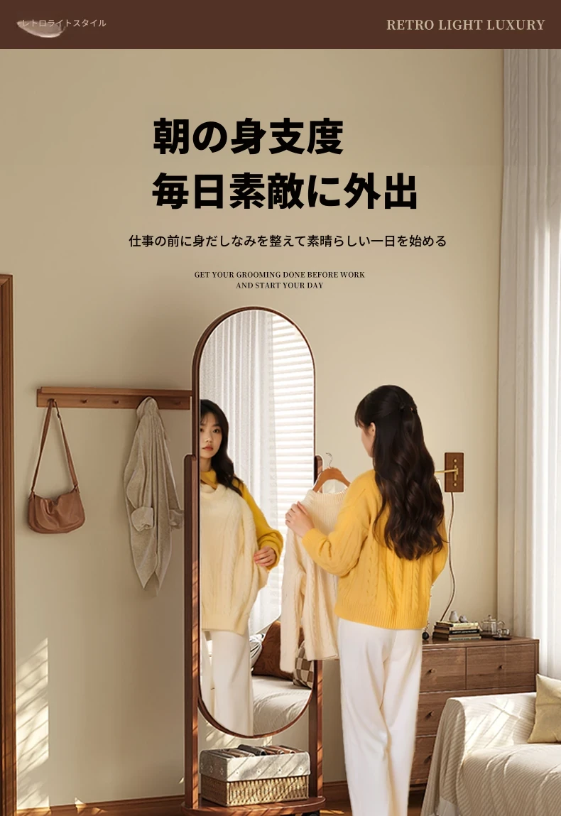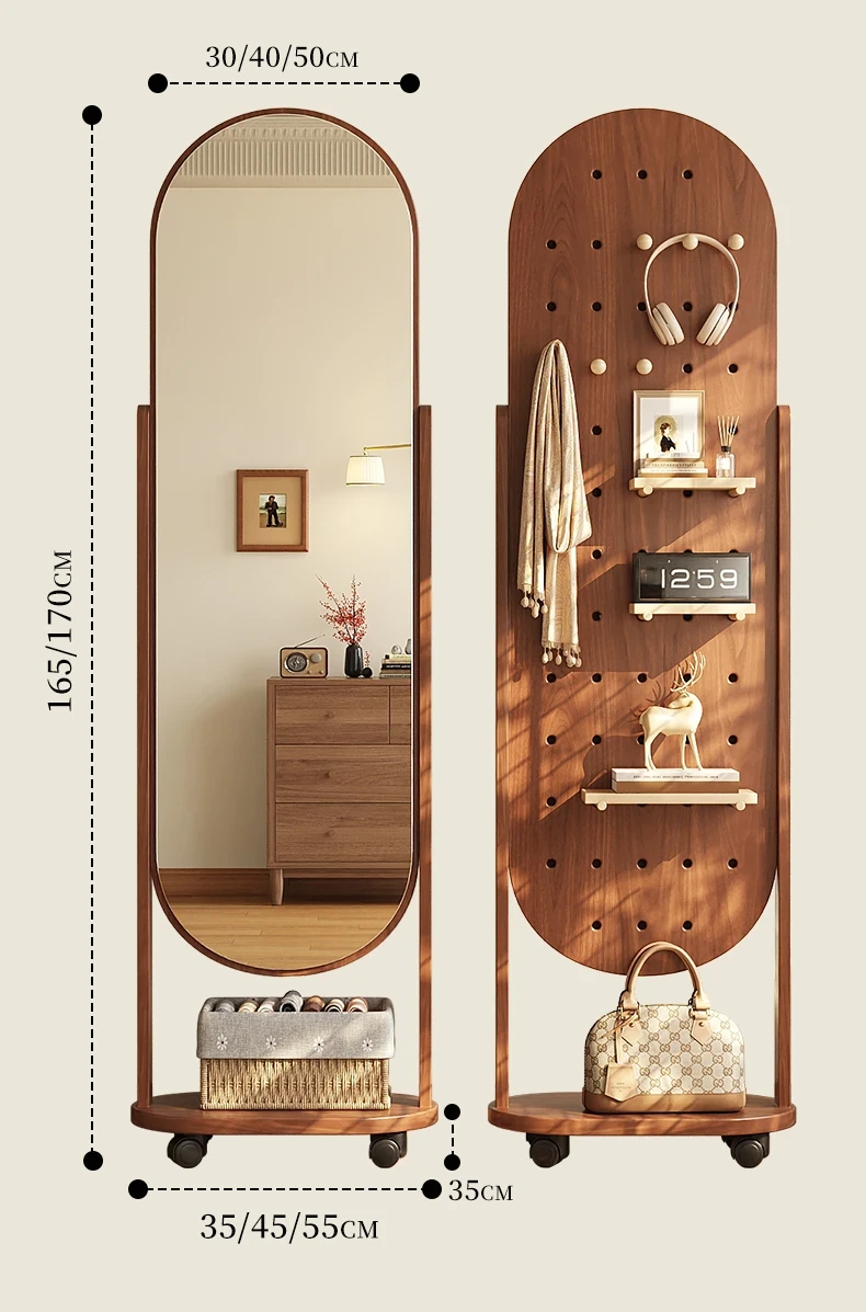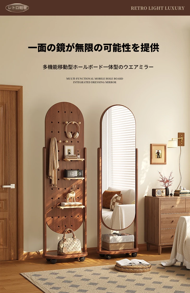 回転式全身ミラー付きの穴あきボード、移動可能なフロアミラー、寝室用ハンガーラック一体型の試着鏡!スタイリッシュなデザインで、どんな部屋にもぴったり。自宅で簡単にコーディネートチェックができる便利アイテム!