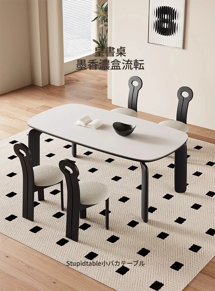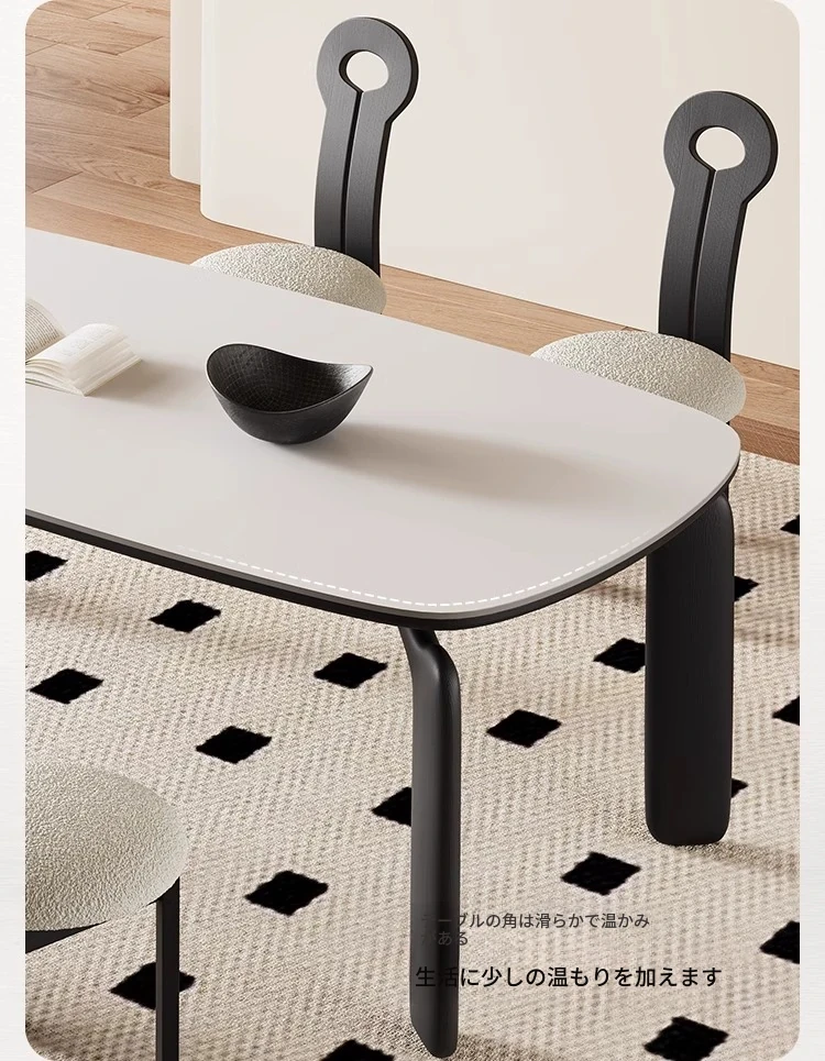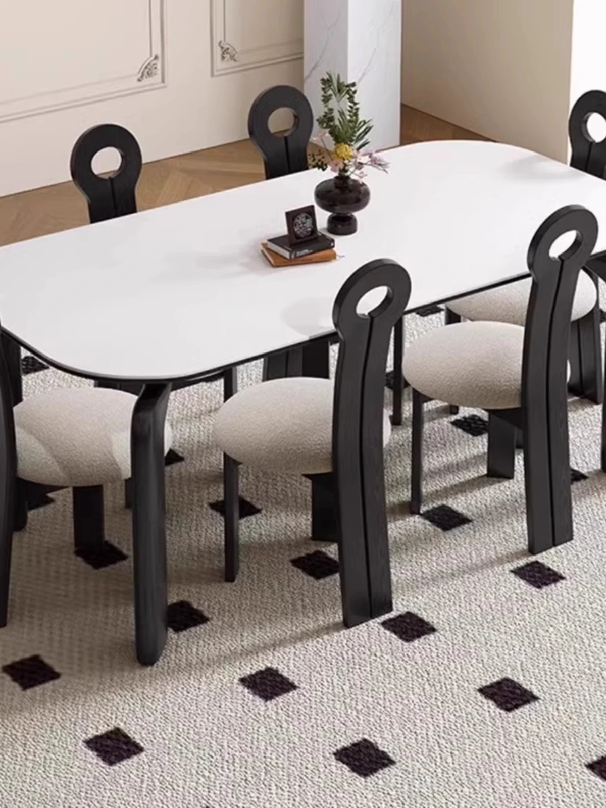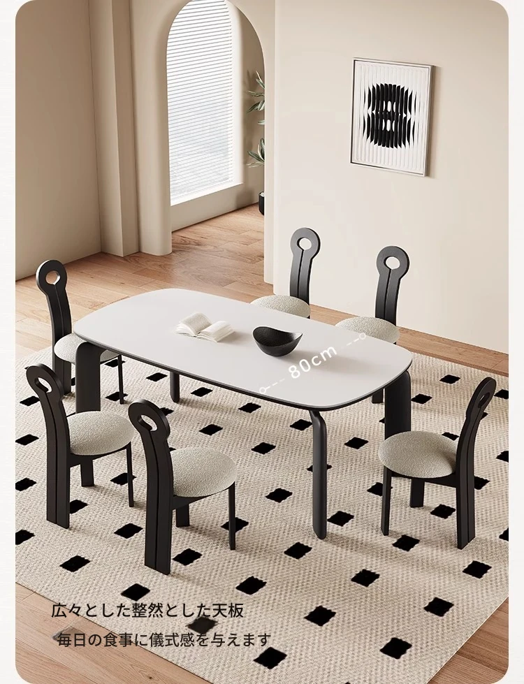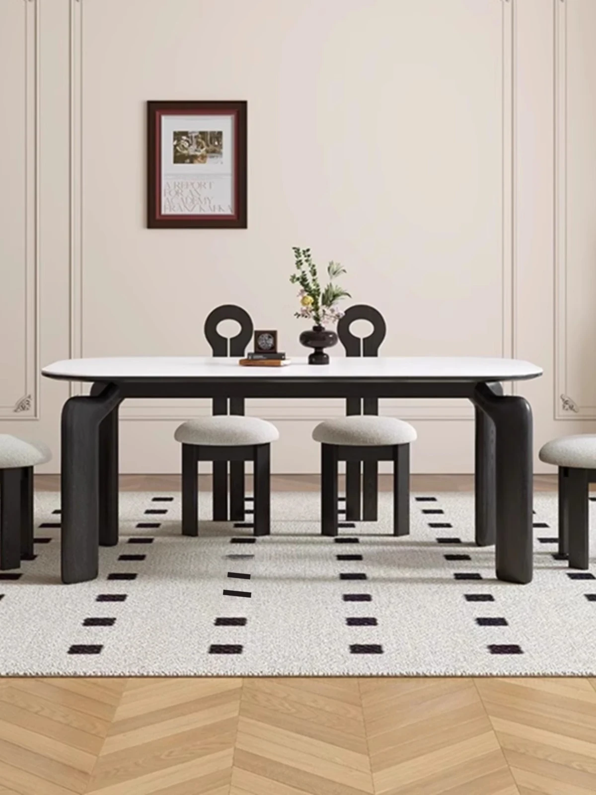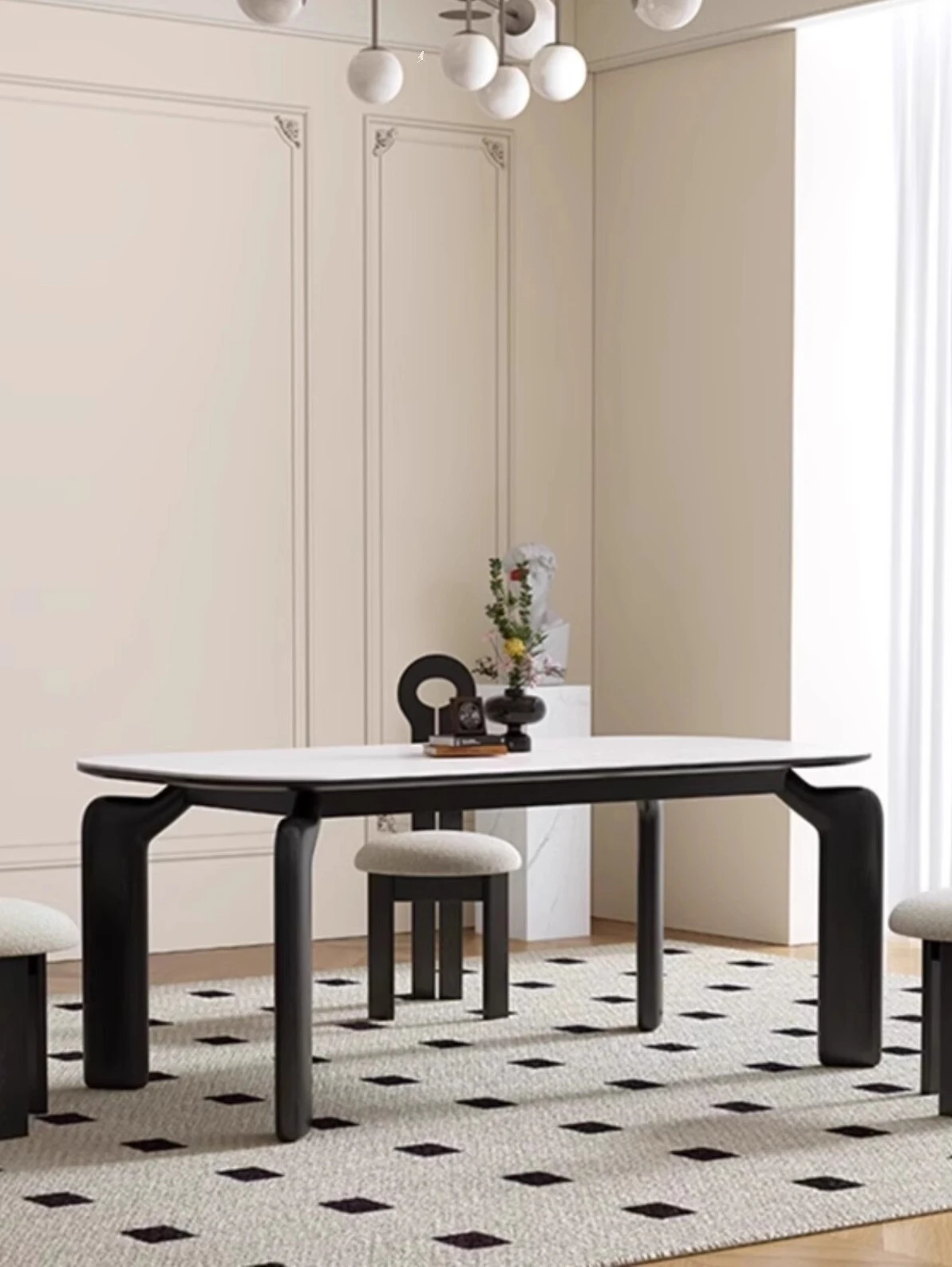 中古風の岩板実木ダイニングテーブル|フレンチブラックの侘寂スタイル|アメリカン・北欧デザイン|高級オーク&ホワイトアッシュ|クリーミーカラーで優雅な食卓を演出!