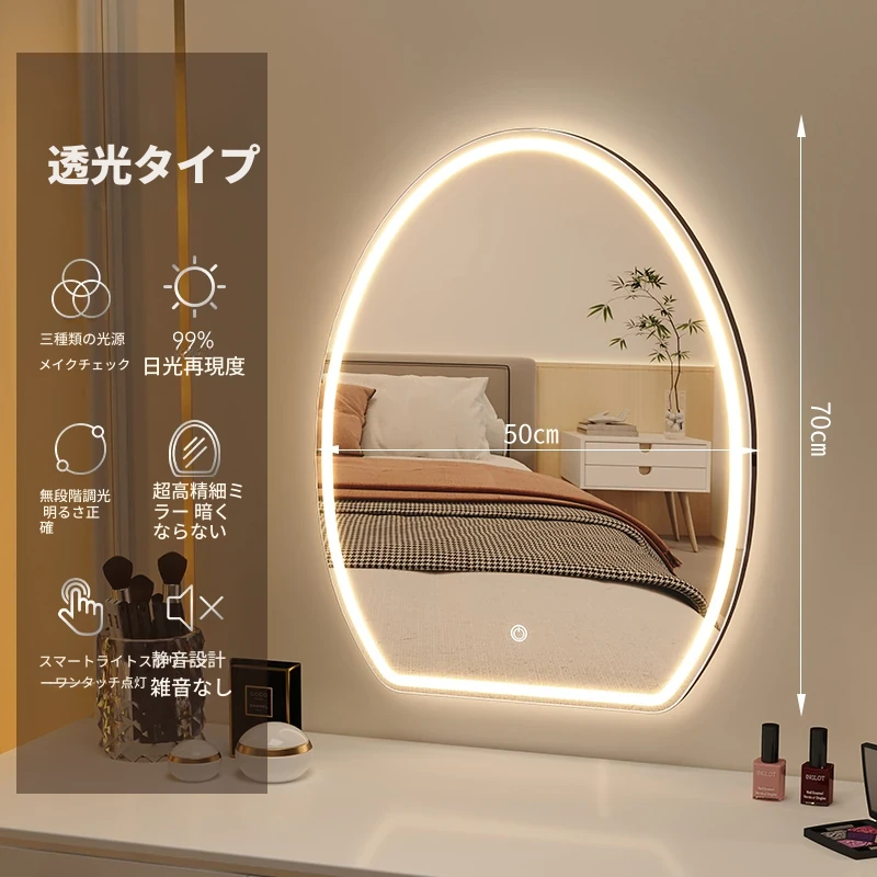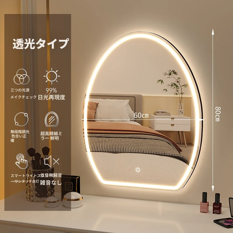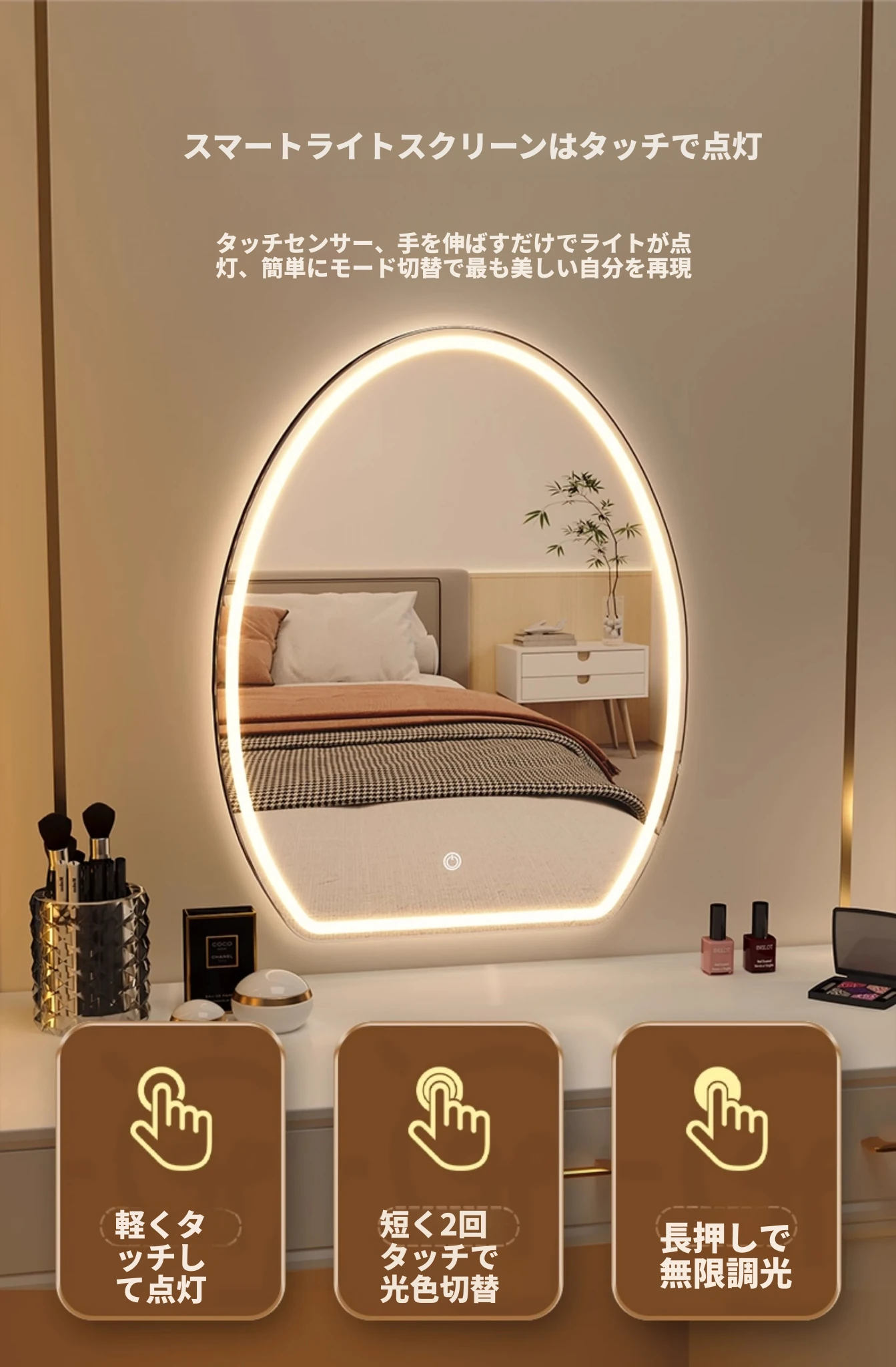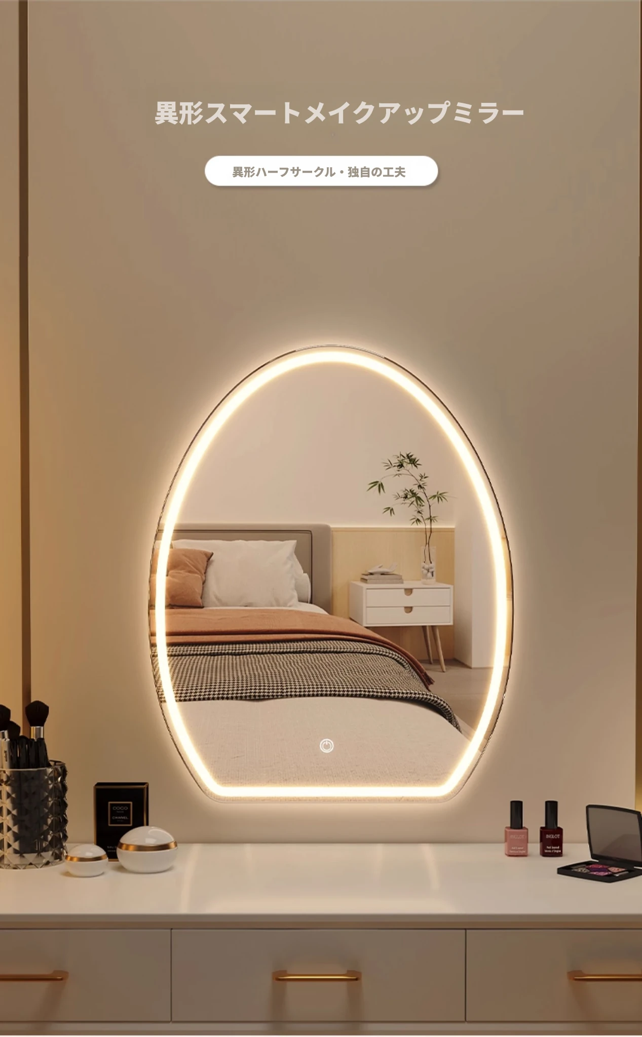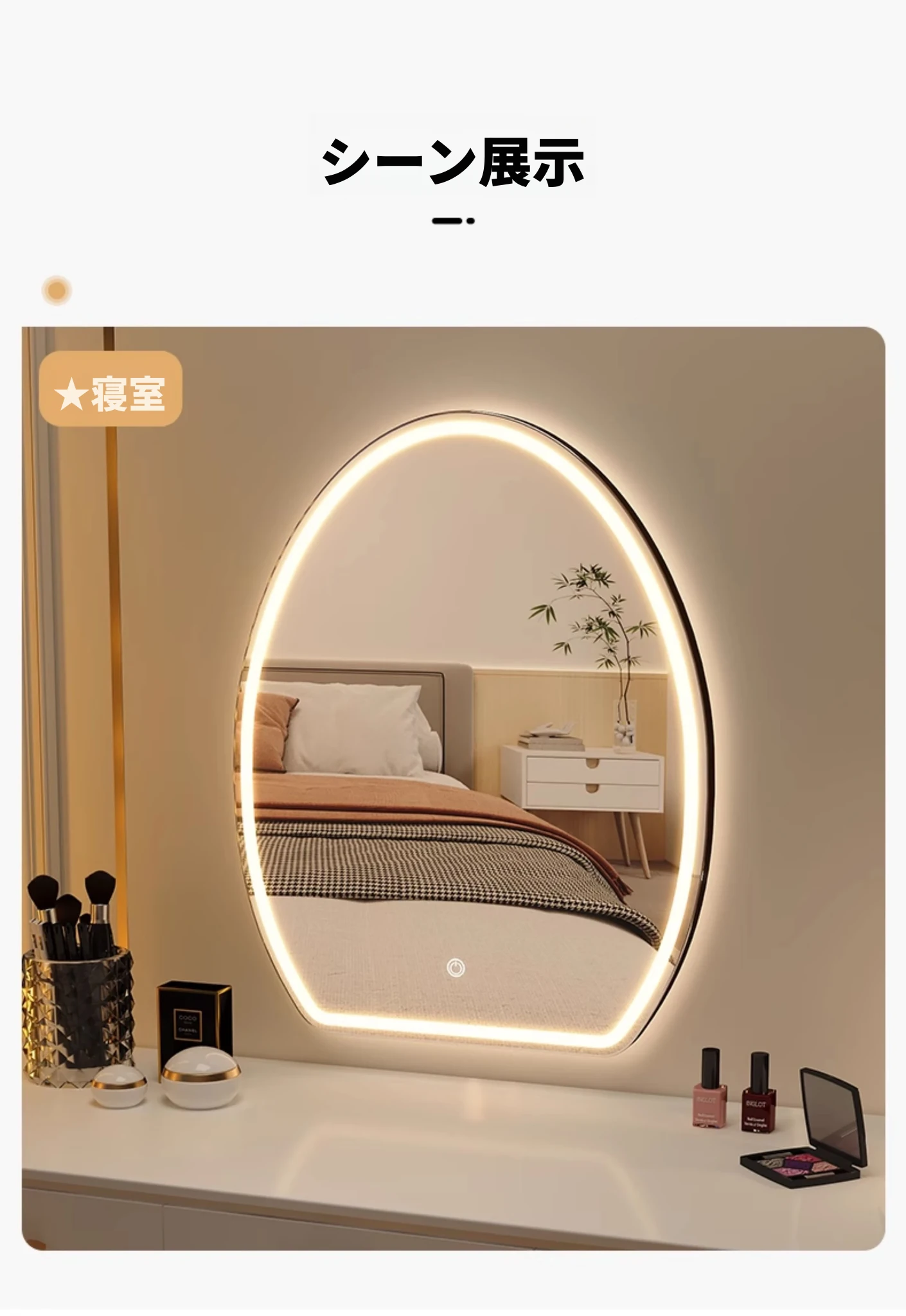 壁掛け式スマートLED化粧鏡 - 洗練されたデザインで、主寝室にぴったりの大きな鏡。明るい照明でメイクを完璧にサポートし、スタイリッシュなコスメティック台を演出します。