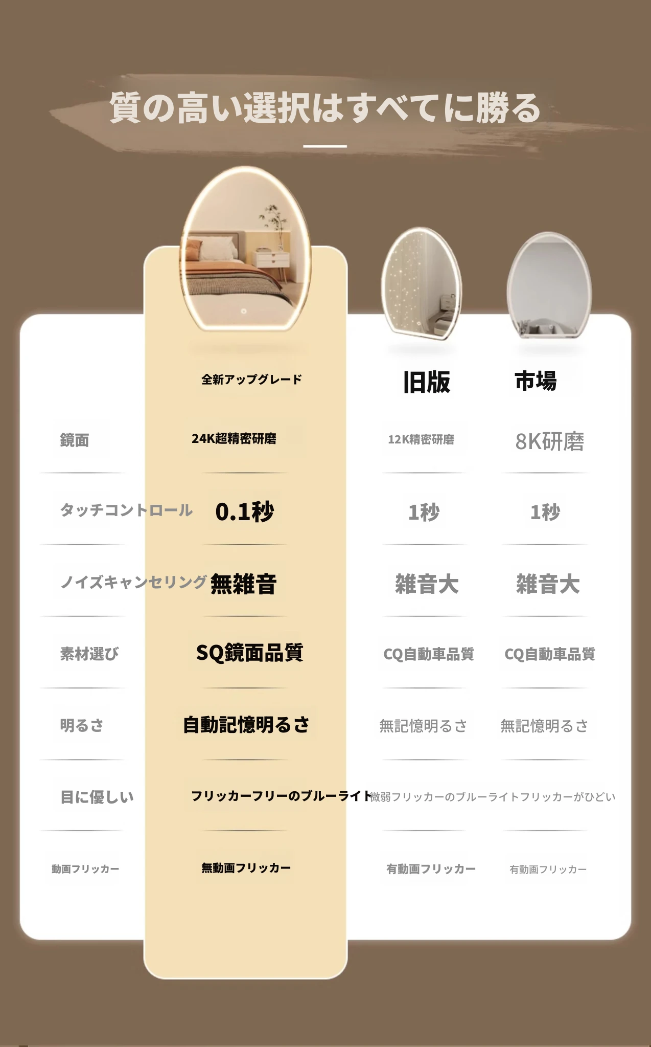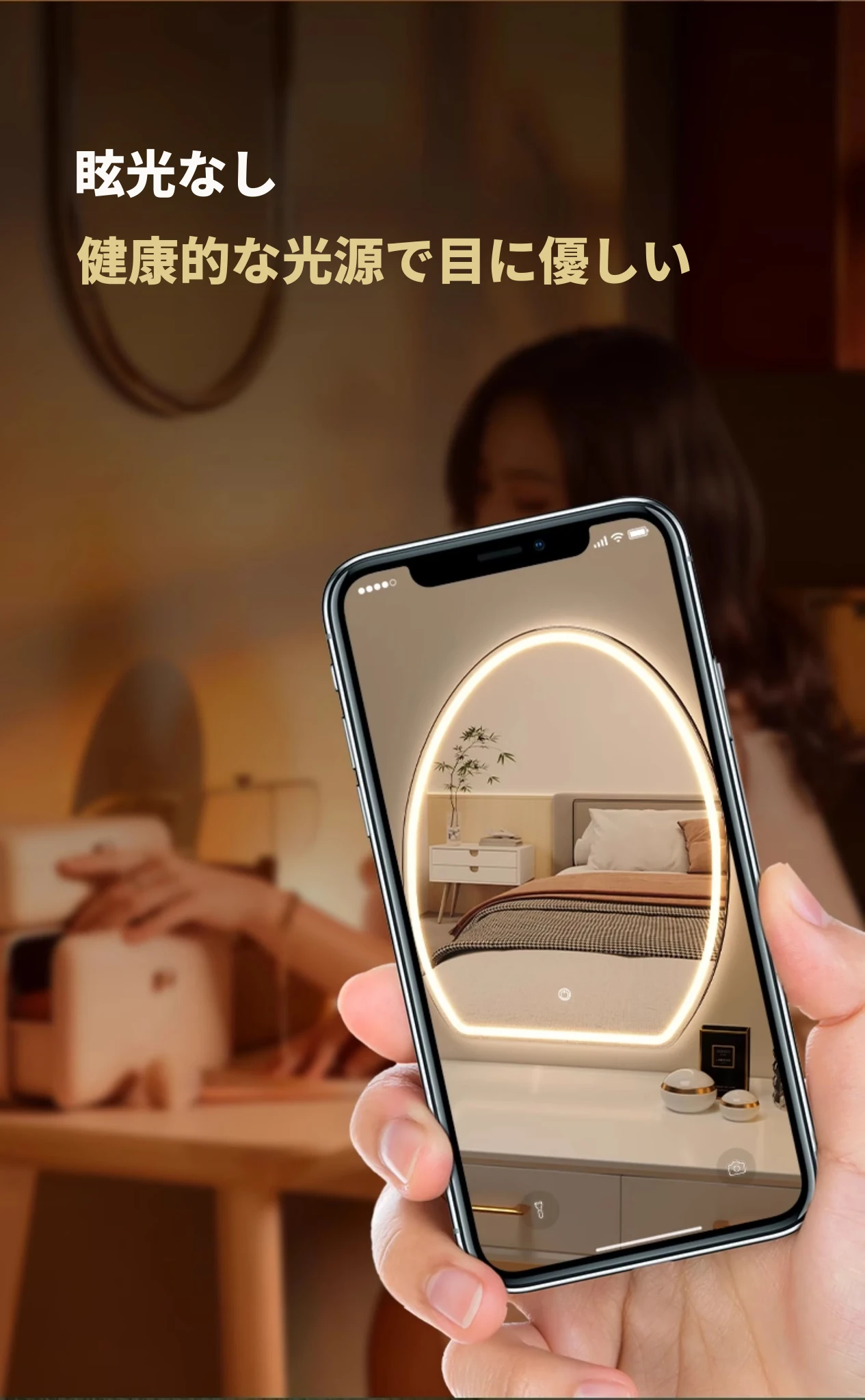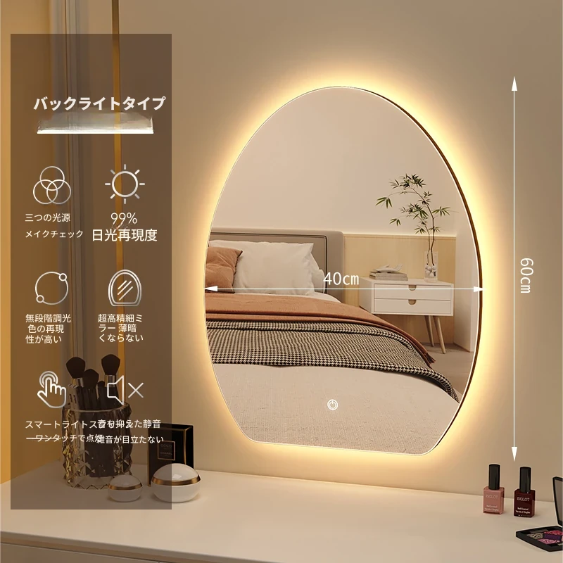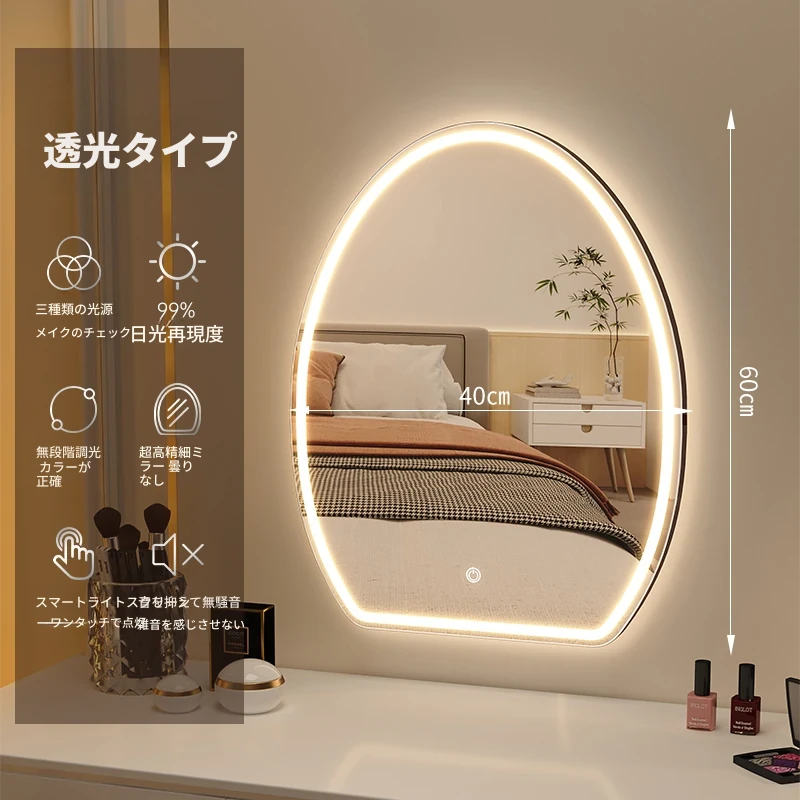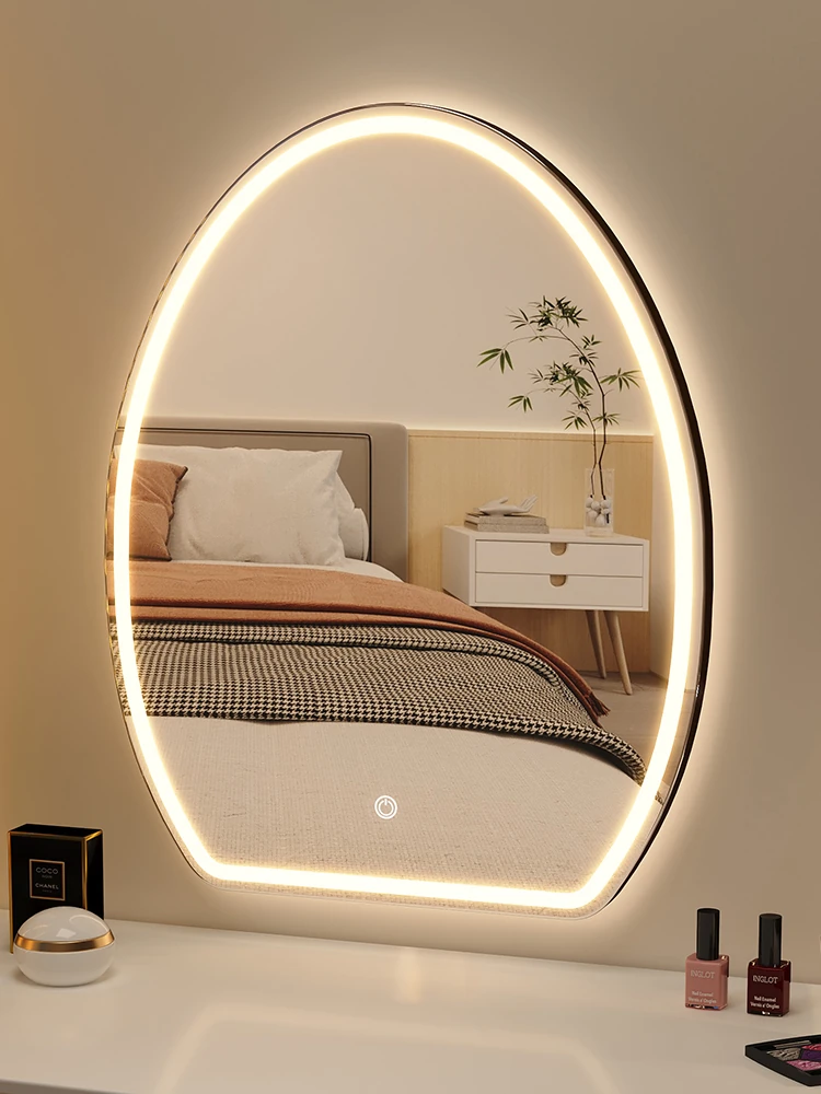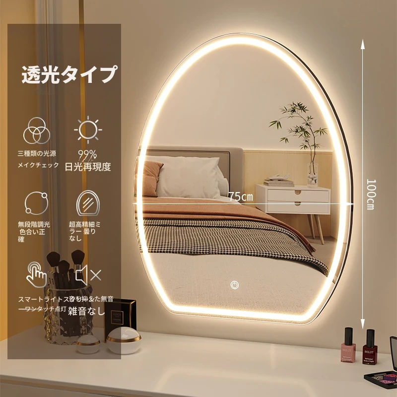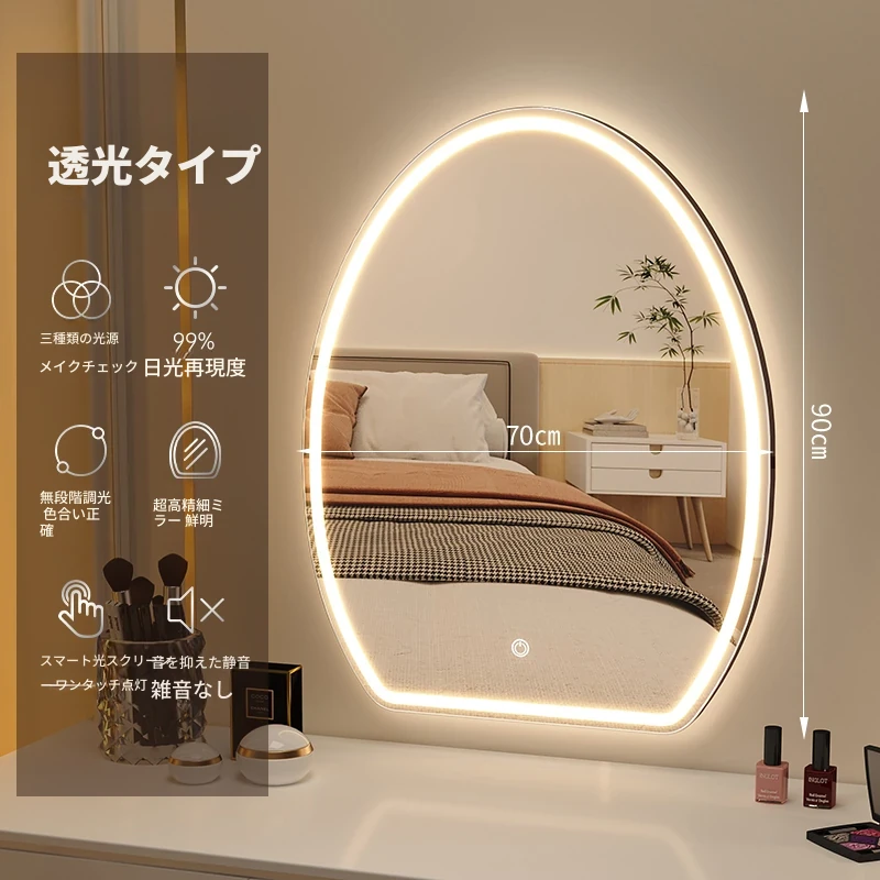 壁掛け式スマートLED化粧鏡 - 洗練されたデザインで、主寝室にぴったりの大きな鏡。明るい照明でメイクを完璧にサポートし、スタイリッシュなコスメティック台を演出します。