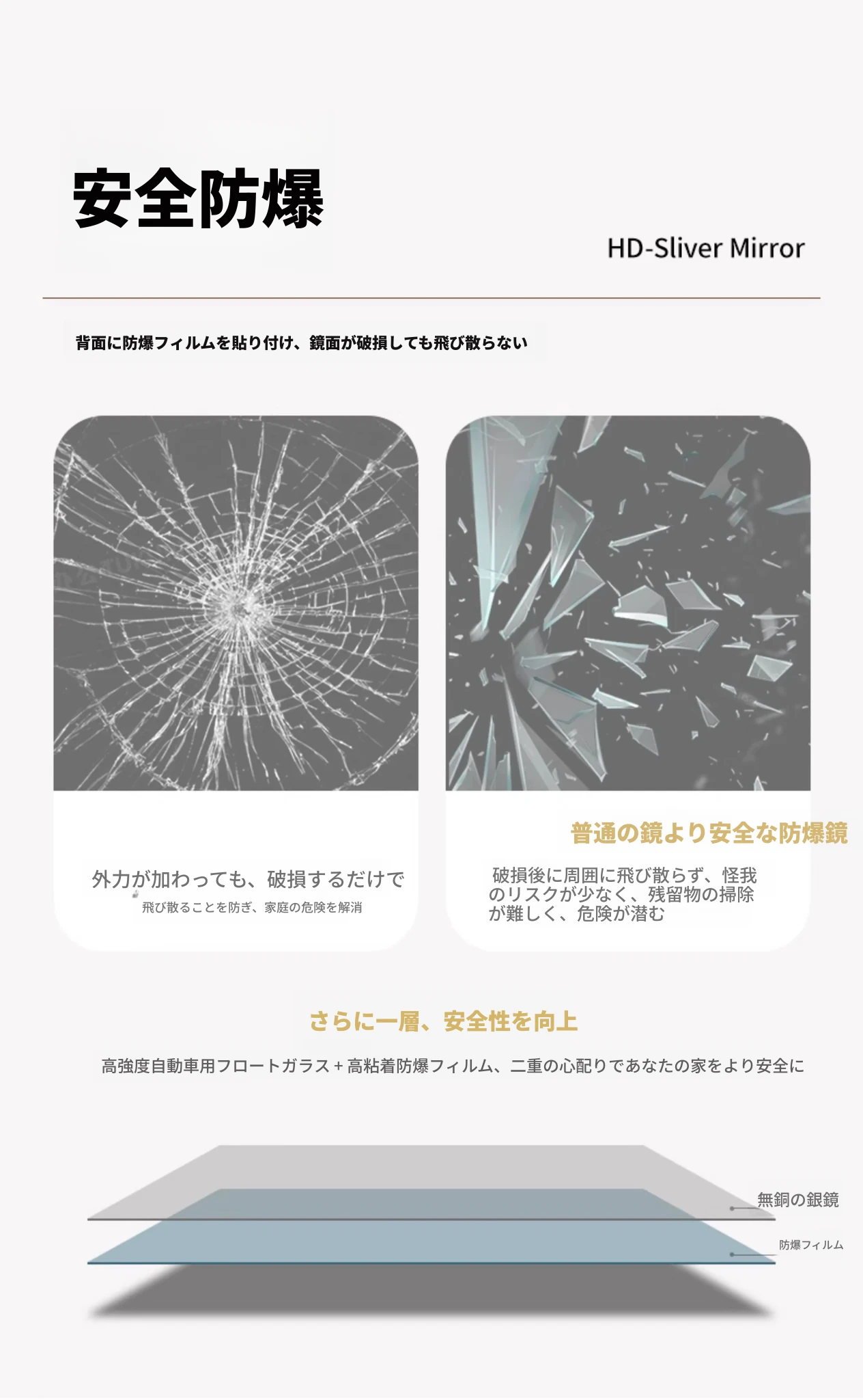 【照明なし】【穴あけ/穴あけ不要】50*70cm【高解像度防爆5mm無銅銀鏡】