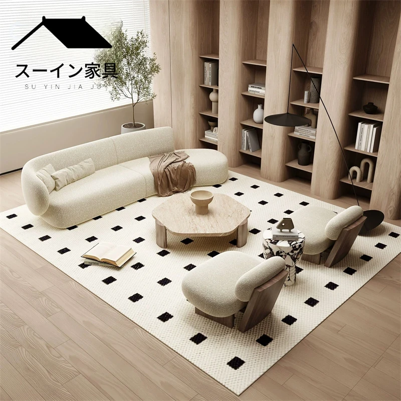 侘寂スタイルのホテル民宿用アーチ型ソファ - シンプルで優雅なクリーム色のウッドとラムズウールのリラックスソファチェア。心地よい空間で特別なひとときをお楽しみください。