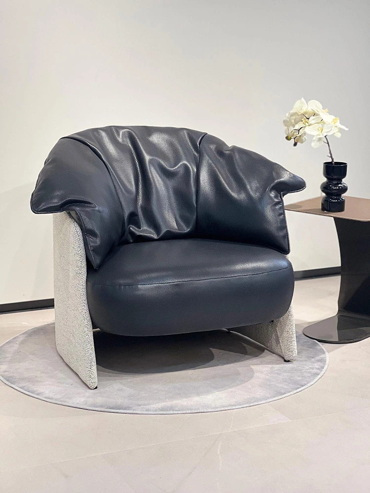 イタリアンデザインの本革&ファブリック使用!ふんわりダウンパッキングのリラックスチェア。おしゃれなリビングにぴったりな一人用ソファ!快適さとスタイルを両立させた贅沢な座り心地を体験してください。