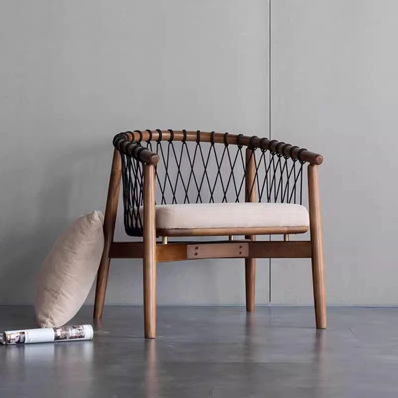 北欧デザインのレトロな一人掛けソファ、シンプルでおしゃれなロープ編みのウッドフレーム。カフェスタイルのリラックスチェアで、居心地の良いリビング空間を演出します。