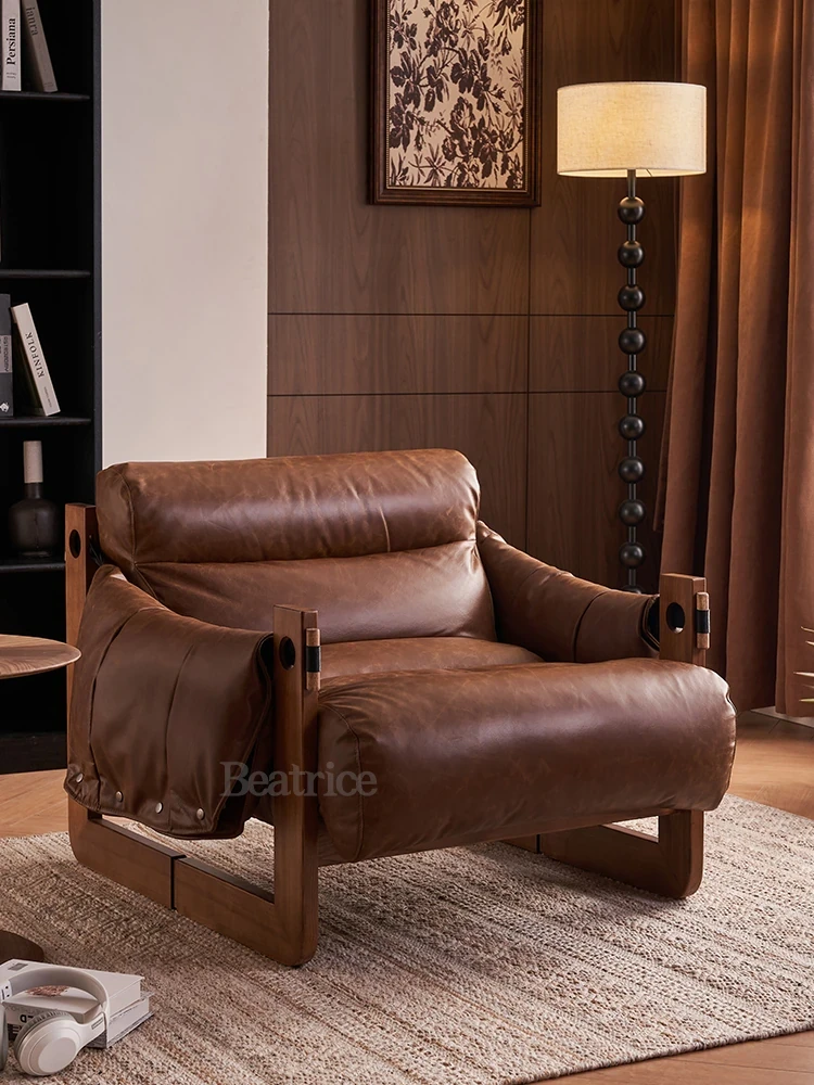 ジャージー島スタイルのレトロデザイン一人掛けソファ - 寝室やバルコニー、リビングに最適!高品質の本革と天然木を使用したリラックスチェアで、優雅な時間をお楽しみください。