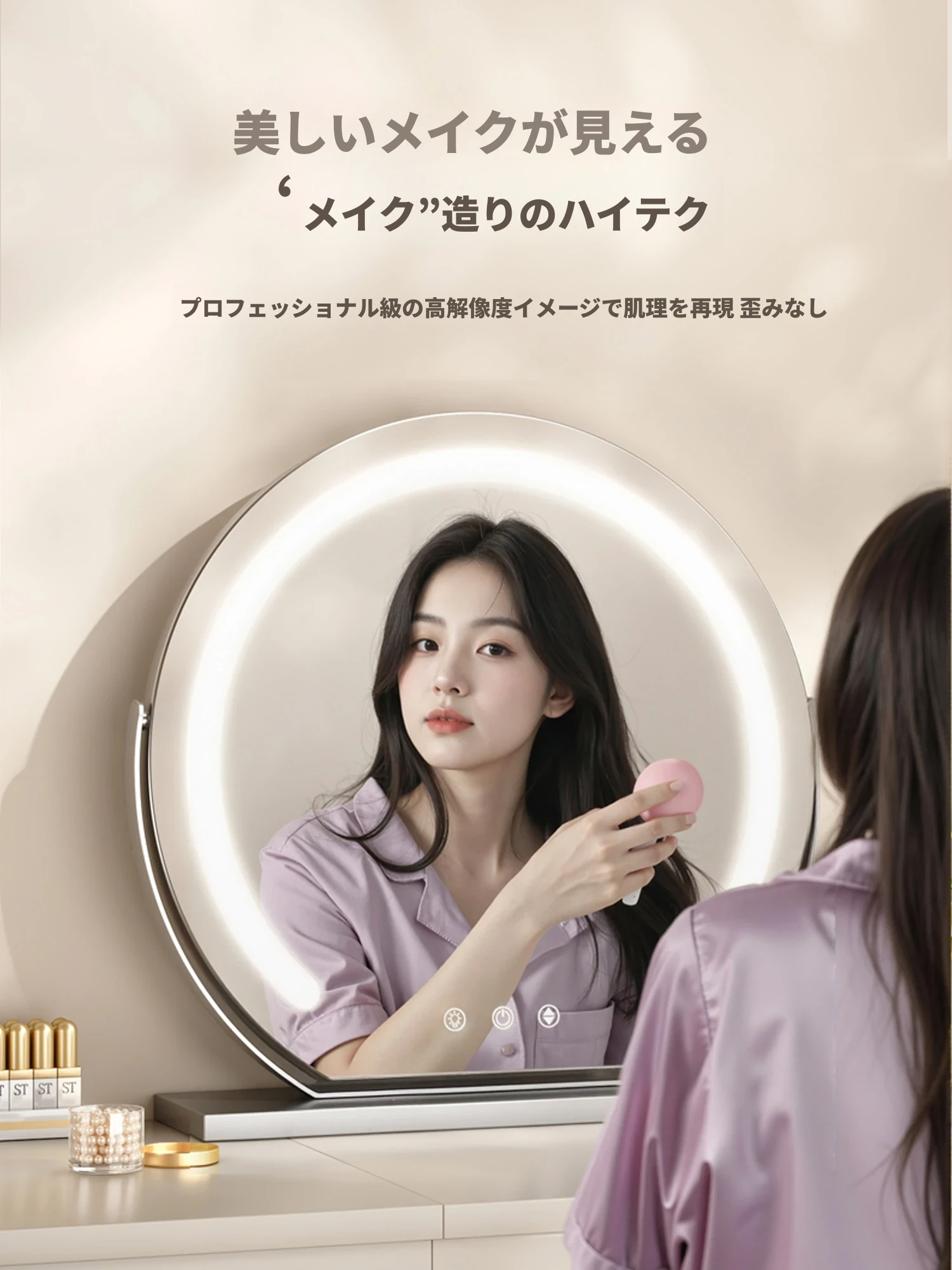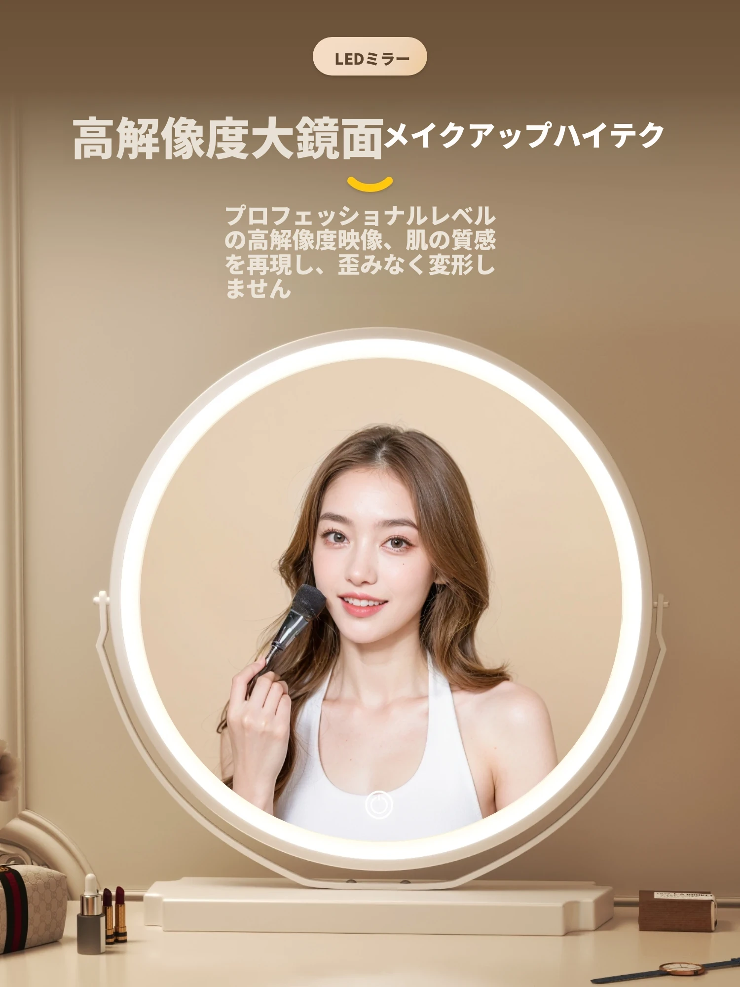 LEDライト付きスマート化粧鏡 - おしゃれなインスタ風デザインで、寝室やドレッサーに最適!卓上で使える補光鏡で、いつでも美しさを引き立てます。あなたのメイクアップを完璧にサポート!