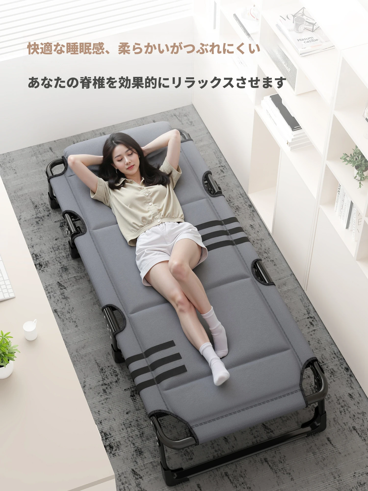 昼寝に最適!折りたたみ式シングルベッド・リクライニングチェア。オフィスやアウトドアで手軽に使える、快適な昼寝の必需品。病院の付き添いやキャンプにもぴったり!