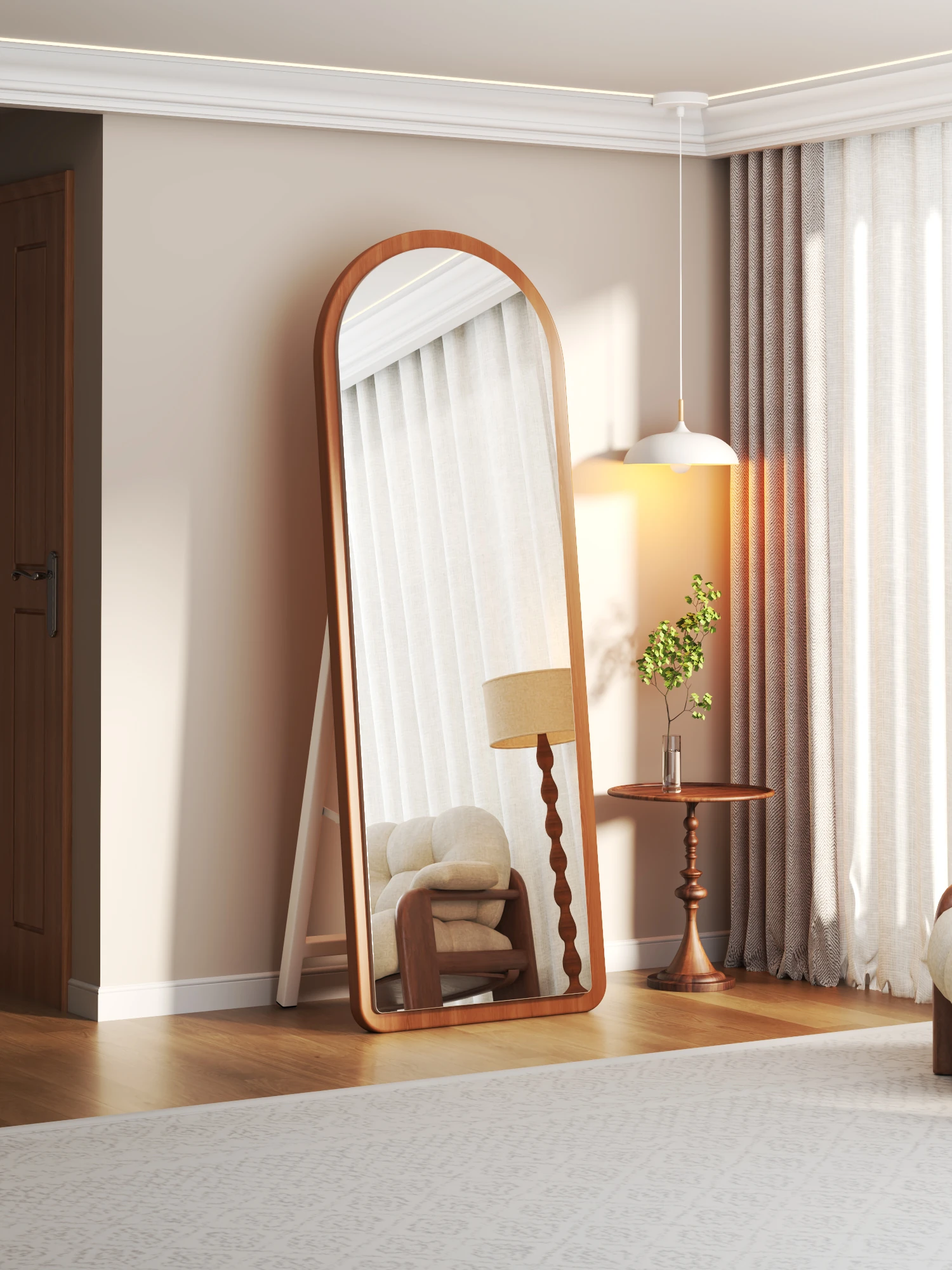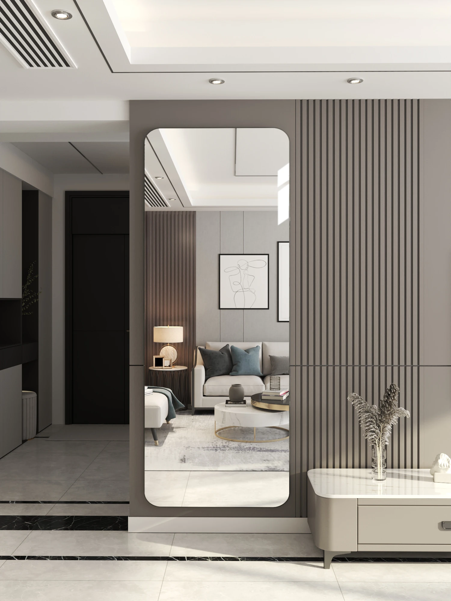 高級感漂う軽奢スタイルの壁掛け全身鏡 - 自粘式で簡単取り付け、寝室にぴったりなドレッシングミラー!おしゃれなインテリアに最適な試着用ミラーです。