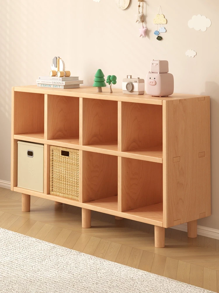 無垢材のシェルフ、グリッドデザインの収納ラック!リビングや幼稚園に最適なシンプルな壁付け収納キャビネット。お子様の本を整理できる、家族のための実用的な書棚です。